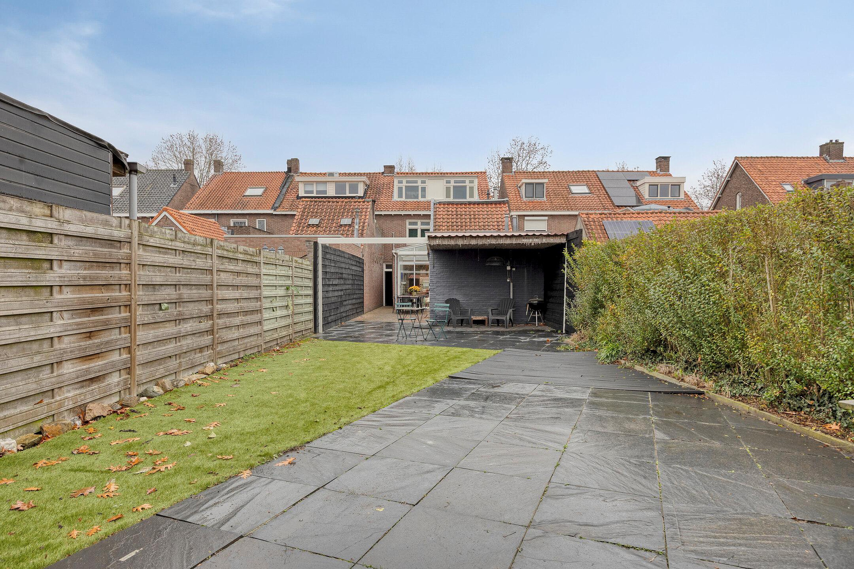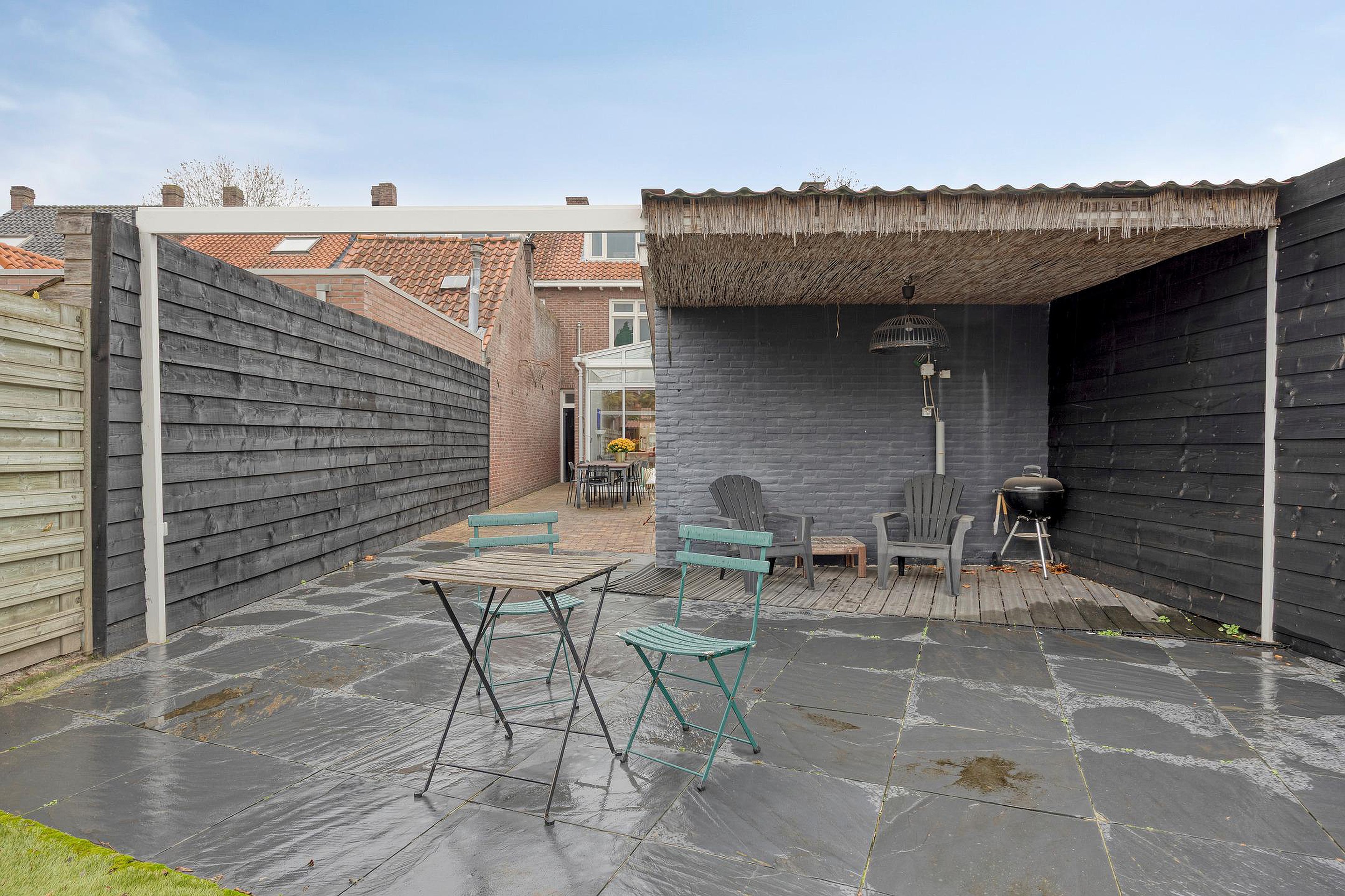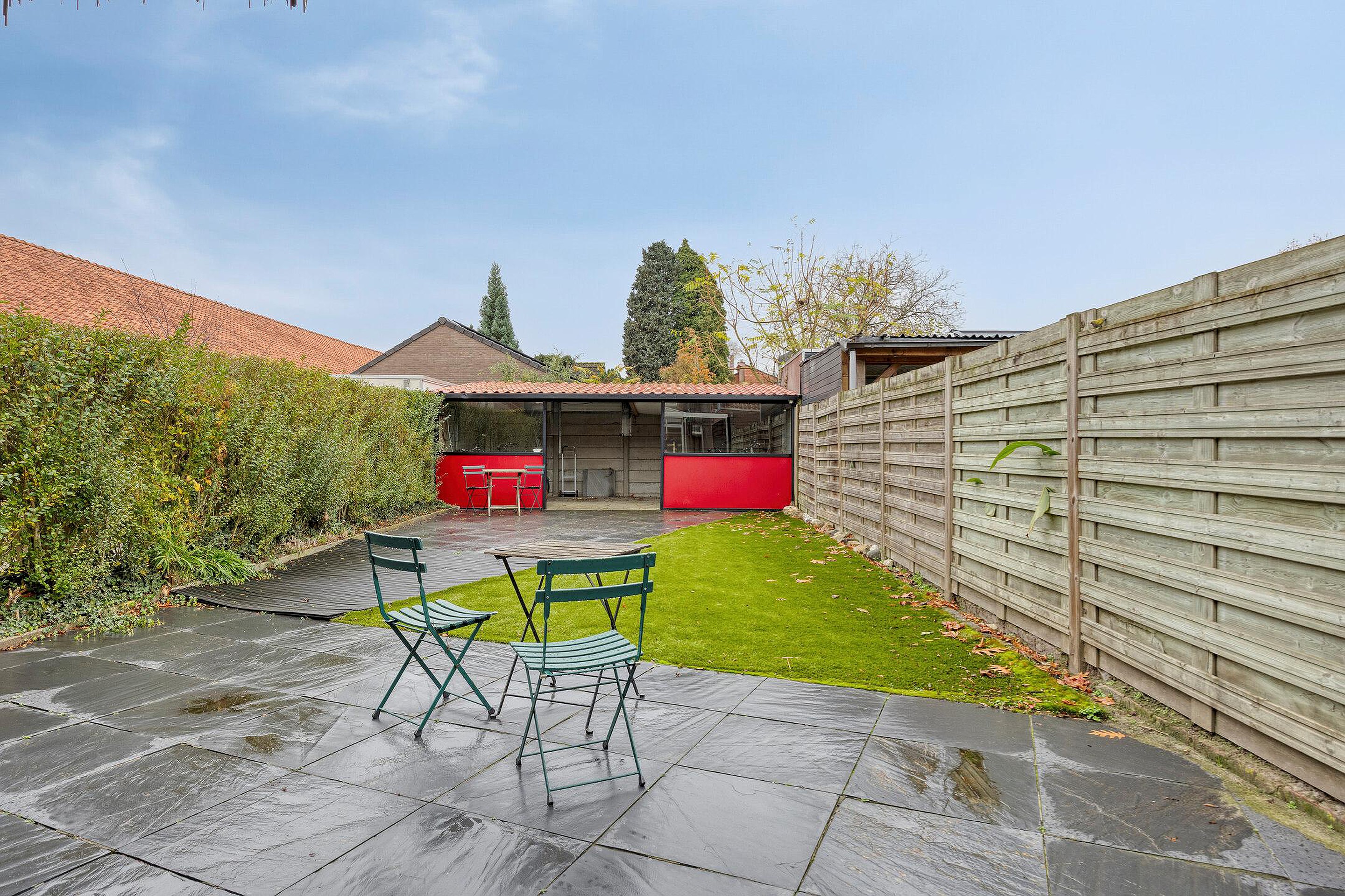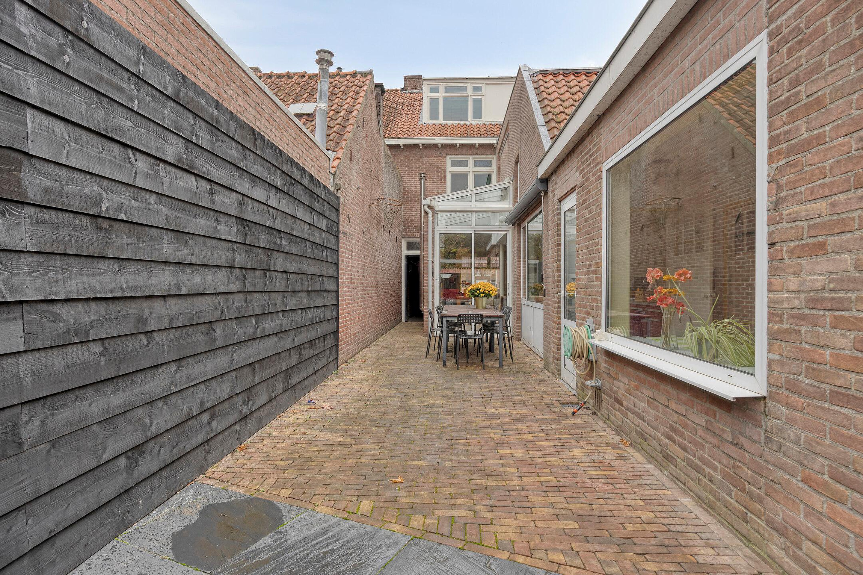 De diepe tuin beschikt over een ruime schuur voor fietsen en opslag. Een overdekt tuinterras zorgt ervoor dat u ook in de zomer heerlijk lang in de tuin te kunt zitten. Teven beschikt dit huis over een eigen achterom.