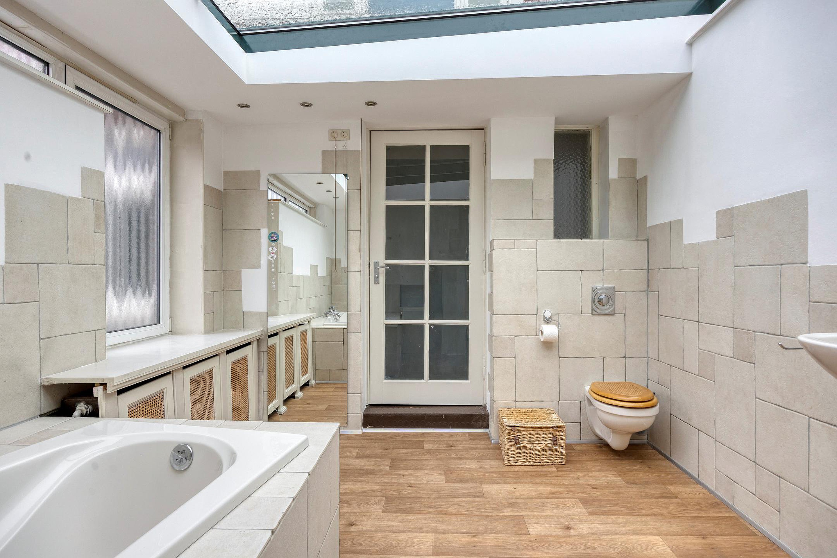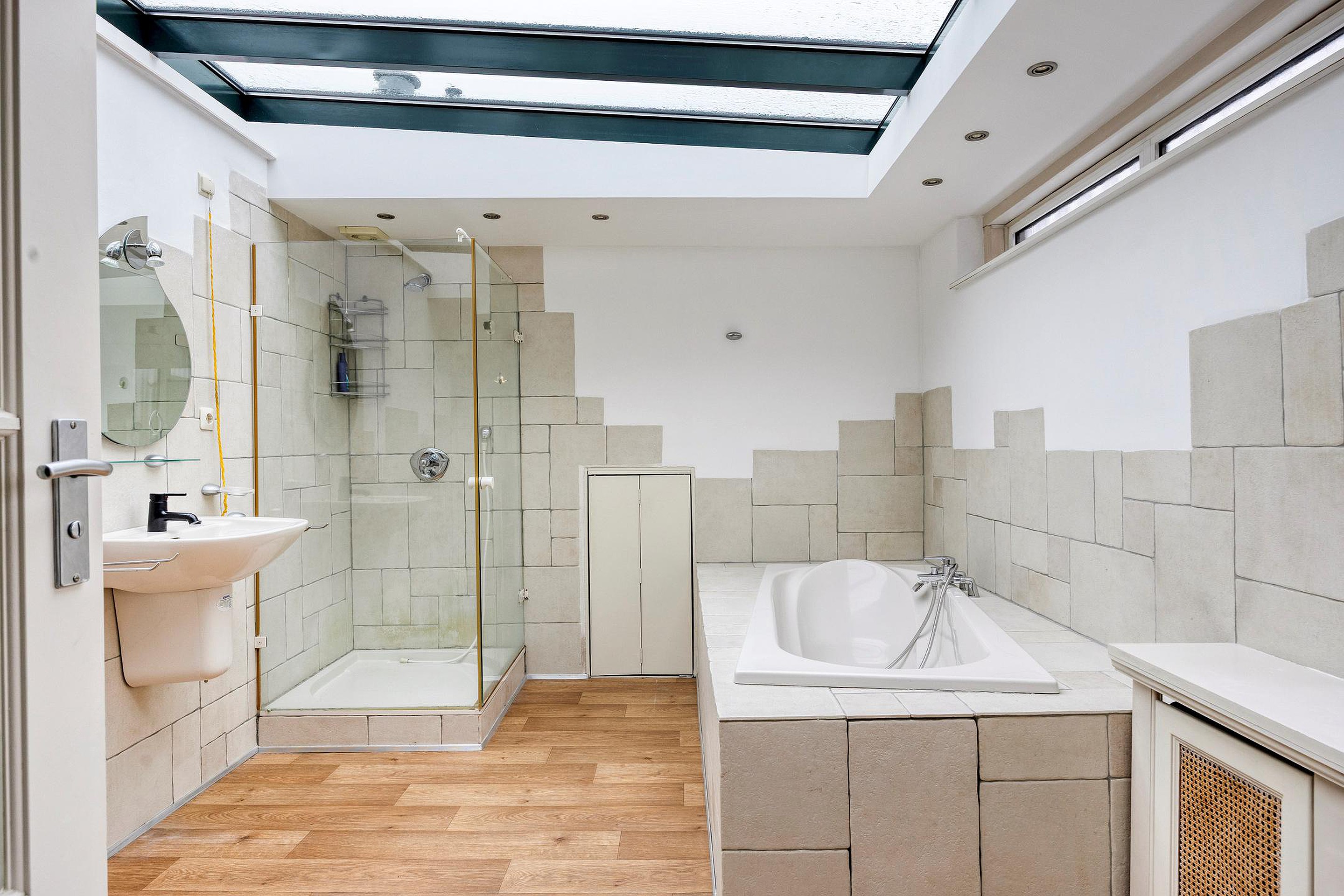De royale badkamer is licht en speels van opzet. Hier komt comfort en ruimte perfect samen. U beschikt over een heerlijk ligbad en een separate douche voor extra gemak. De open en lichte sfeer maakt deze badkamer tot een fijne plek.