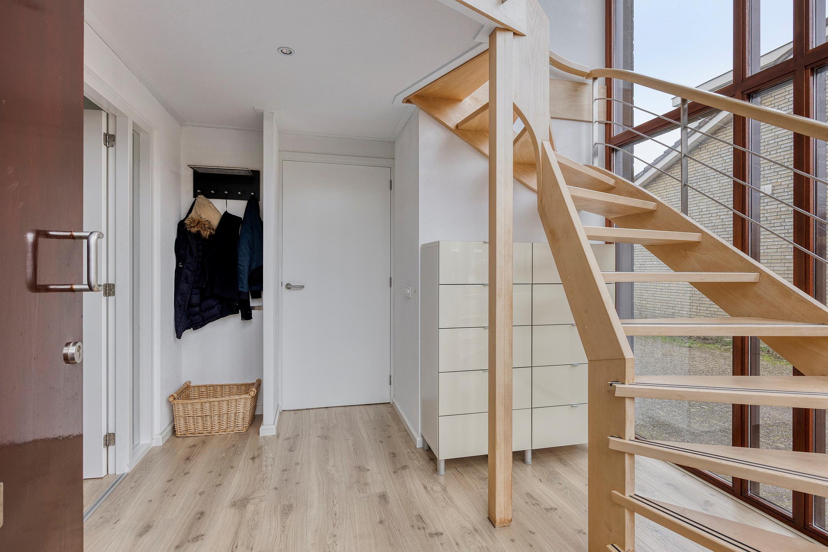 De hal, inclusief garderobe, geeft u toegang tot de living, de eetkamer en de trapopgang naar de verdieping.