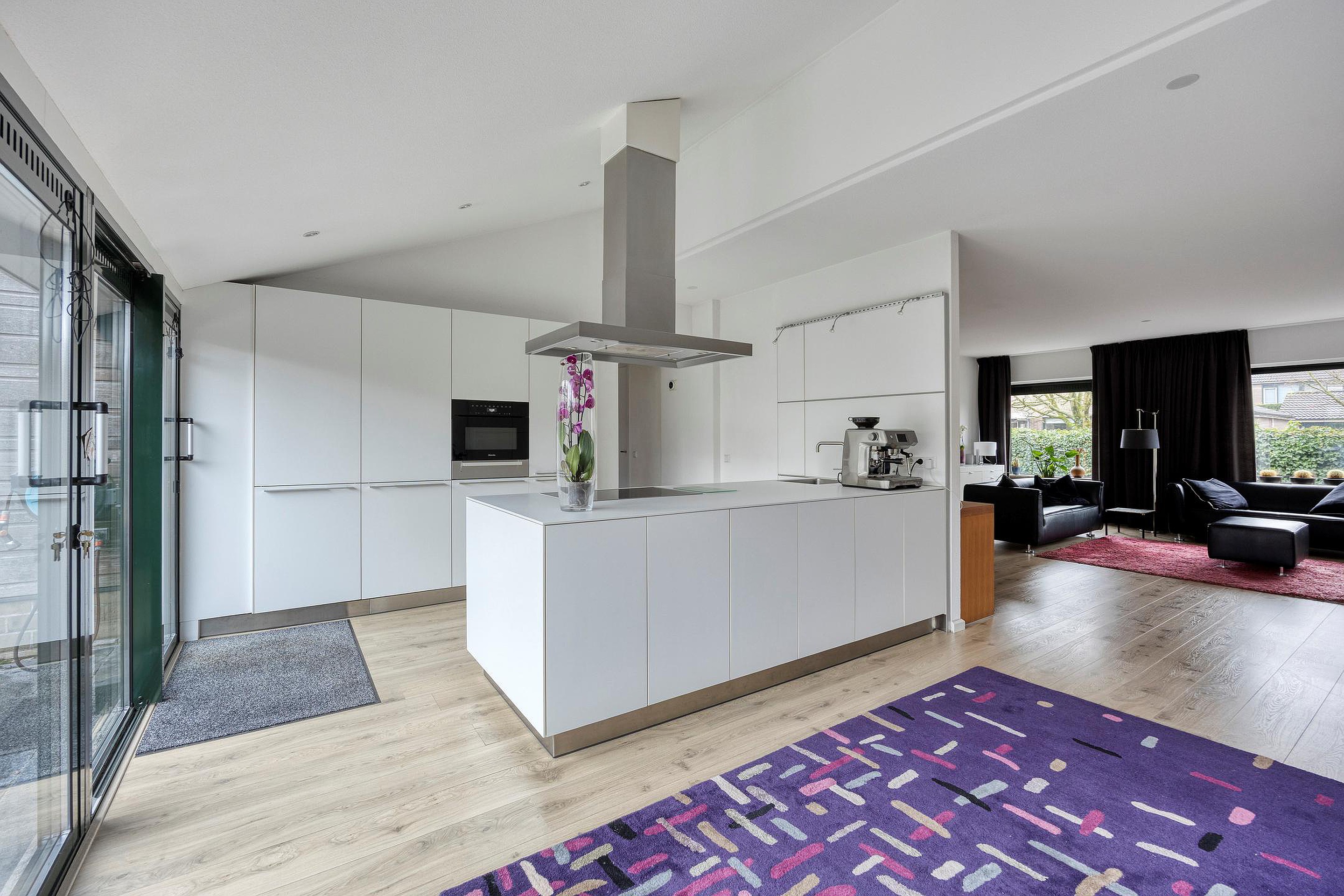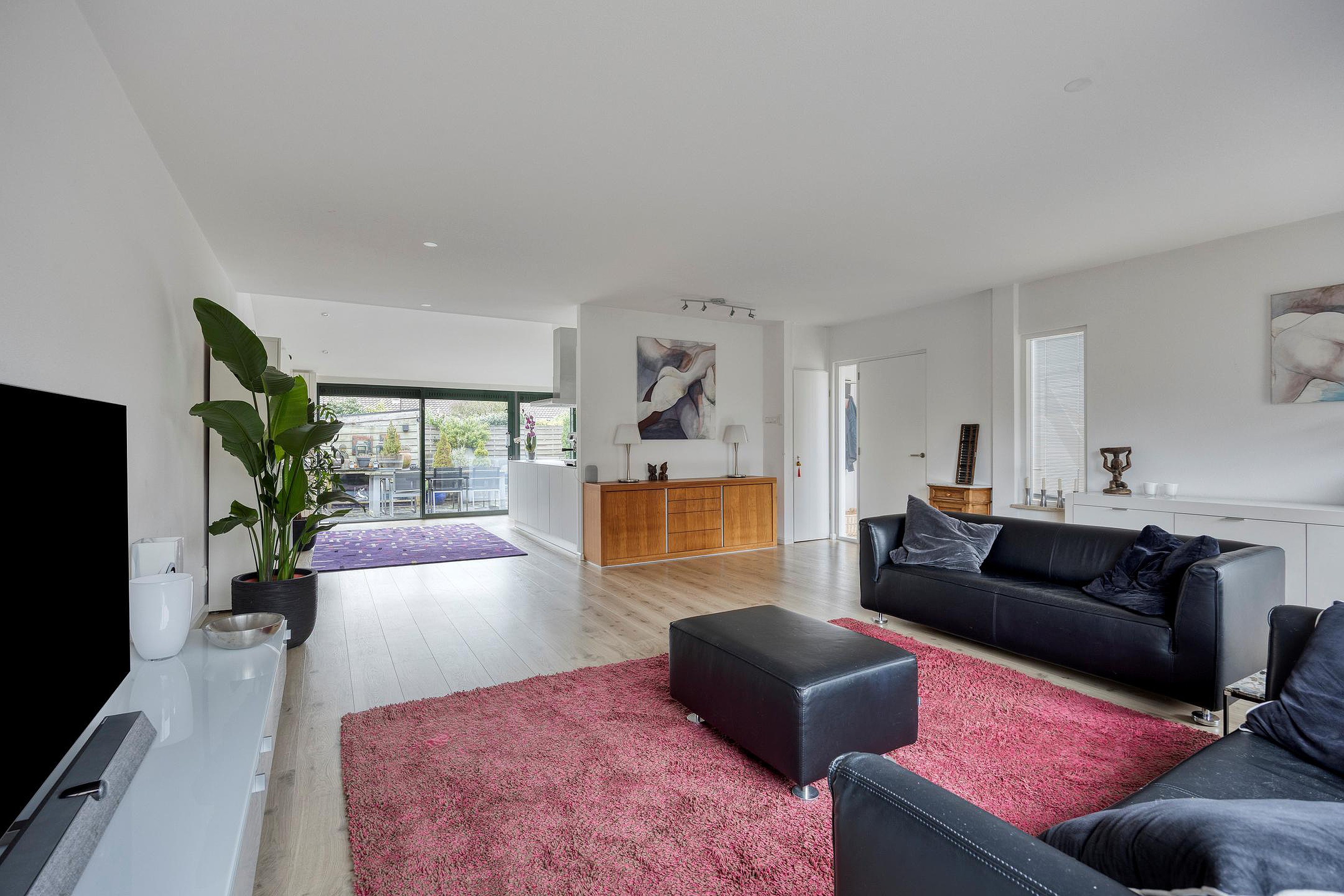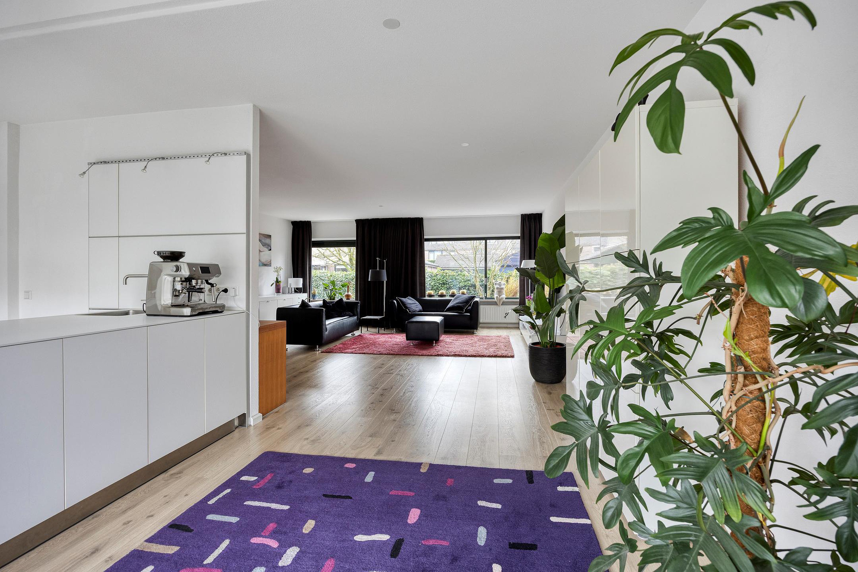 Grote living met zitkamer aan de voorzijde en vrij uitzicht over de voortuin. De open keuken bevindt zich aan achterzijde waar u door de prachtige schuifpui (over de gehele breedte van de woning) zo de achtertuin in loopt.