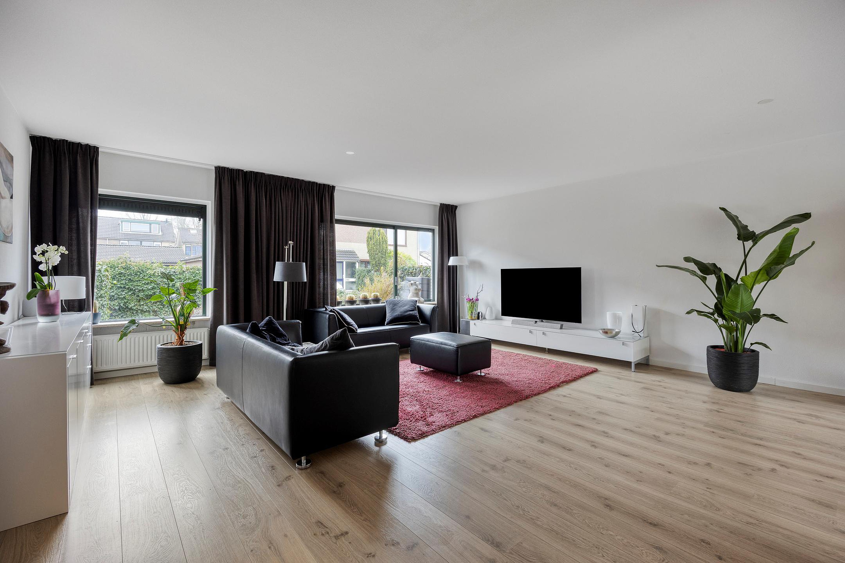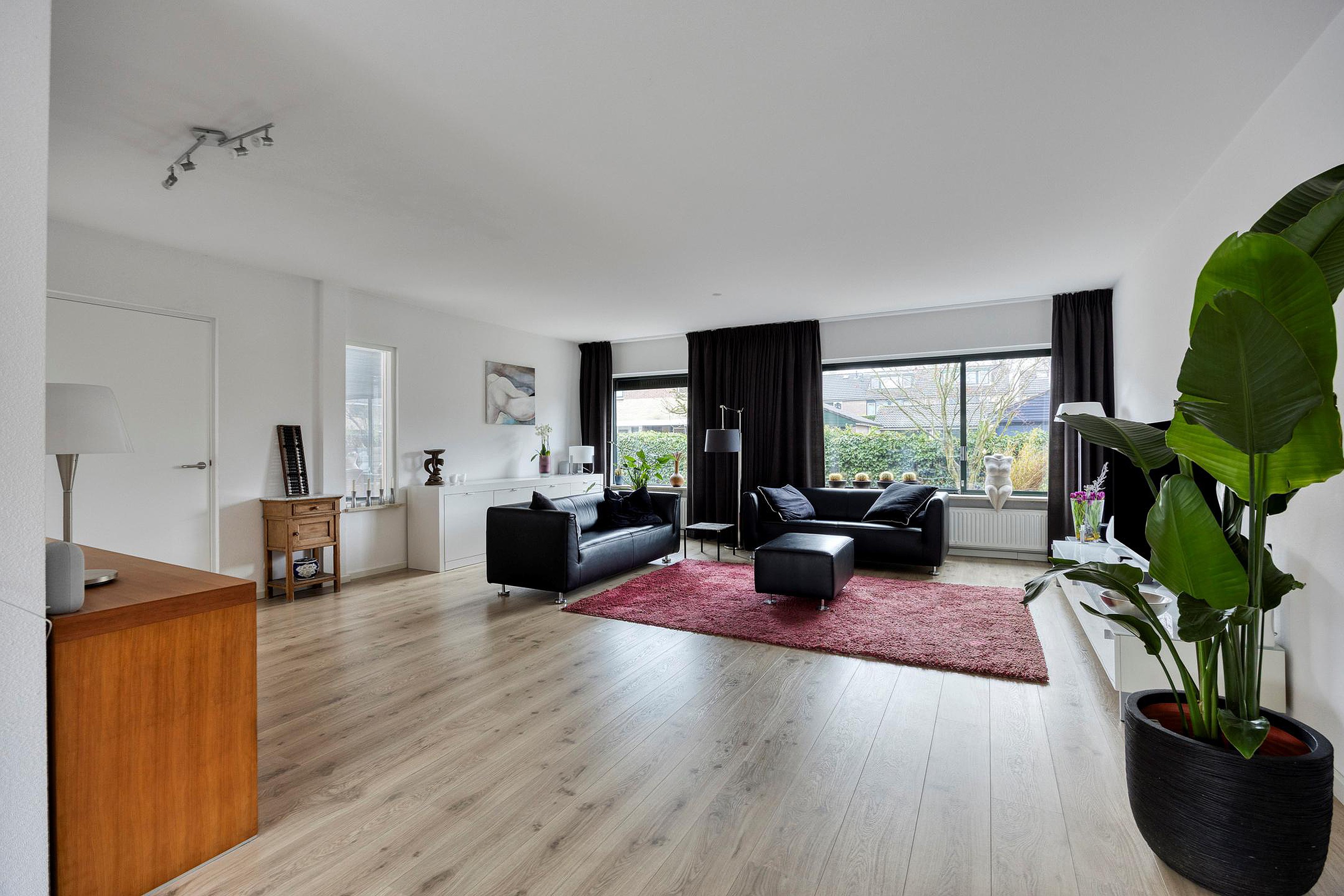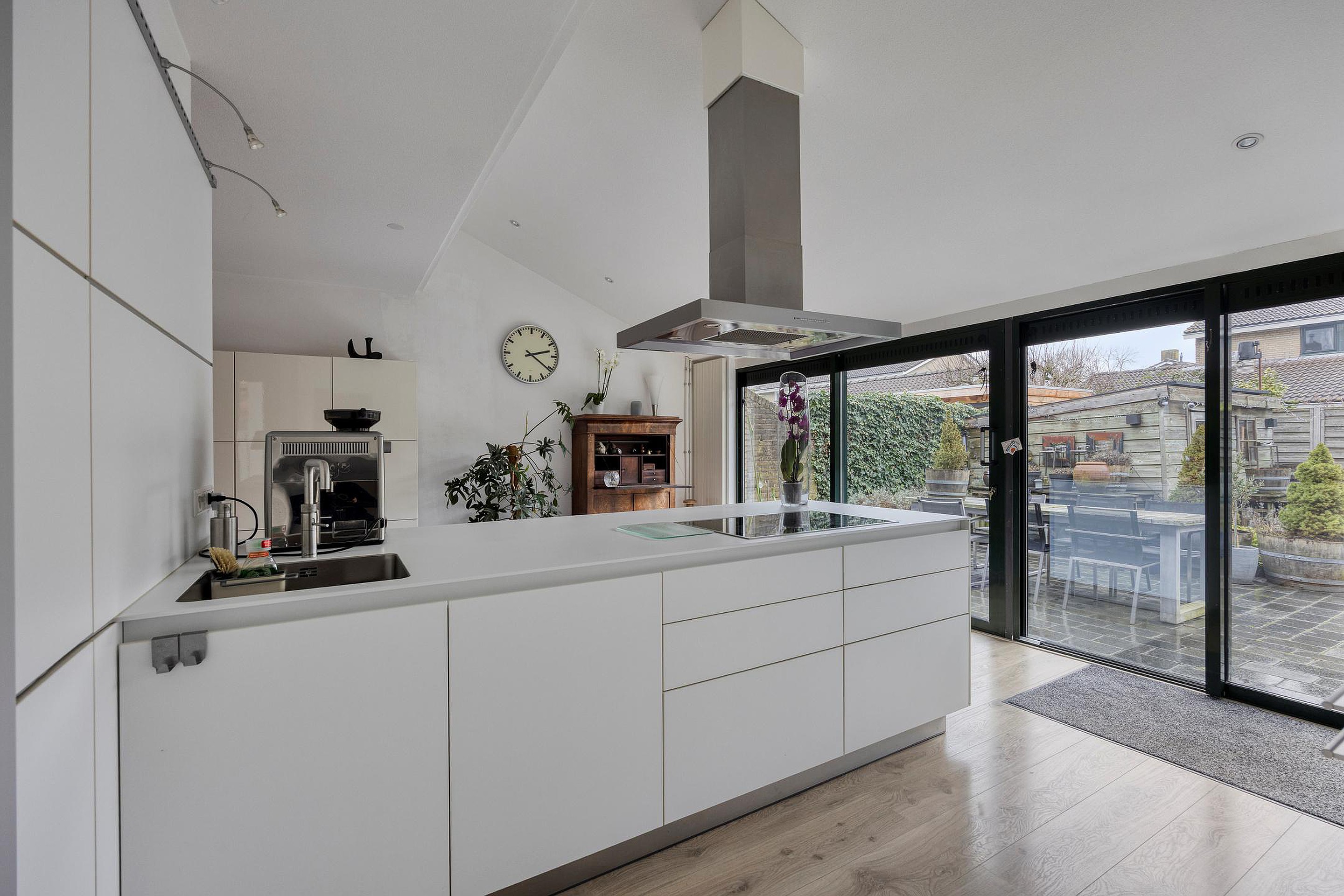 Grote living met zitkamer aan de voorzijde en vrij uitzicht over de voortuin. De open keuken bevindt zich aan achterzijde waar u door de prachtige schuifpui (over de gehele breedte van de woning) zo de achtertuin in loopt.