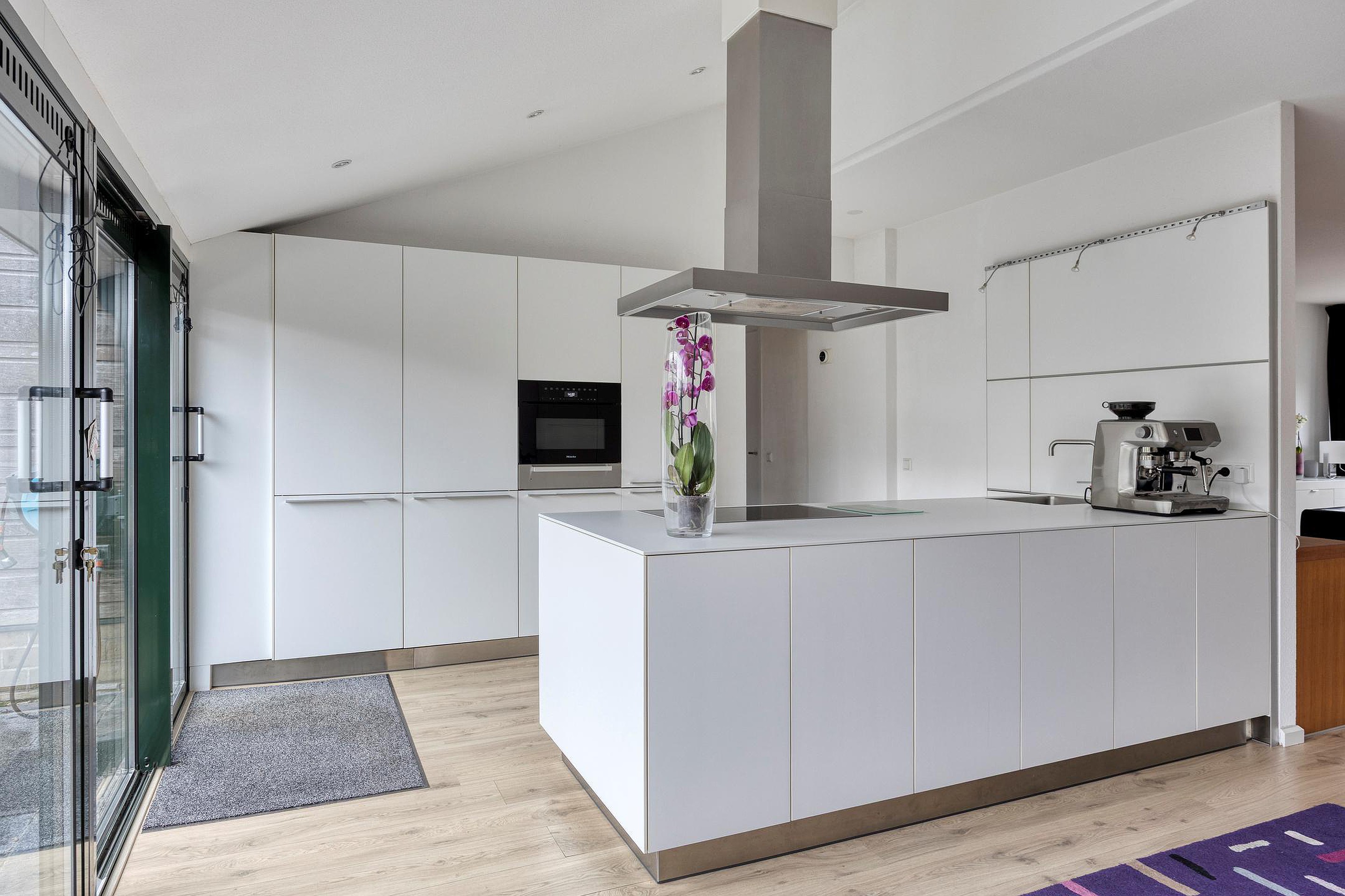 Royale open woonkeuken met een moderne keukeninrichting, waaronder een kookeiland en is voorzien van inbouwapparatuur, te weten: koel/vriescombinatie, design afzuigschouw, vaatwasser, combi magnetron oven, 4-pits Miele inductie kookplaat en spoelbak.