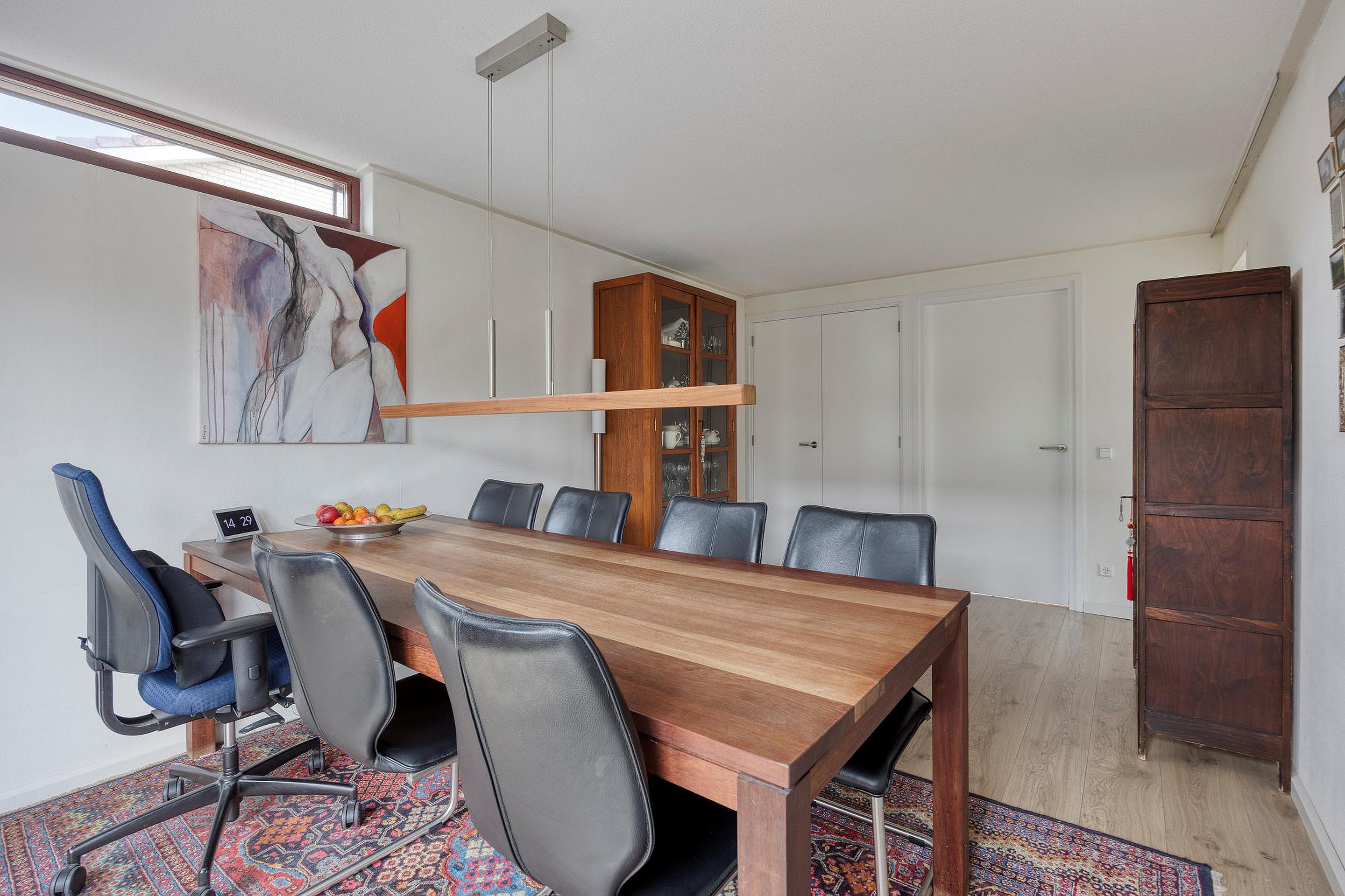 De zeer ruime eetkamer grenst aan de keuken en is ook bereikbaar vanuit de hal.