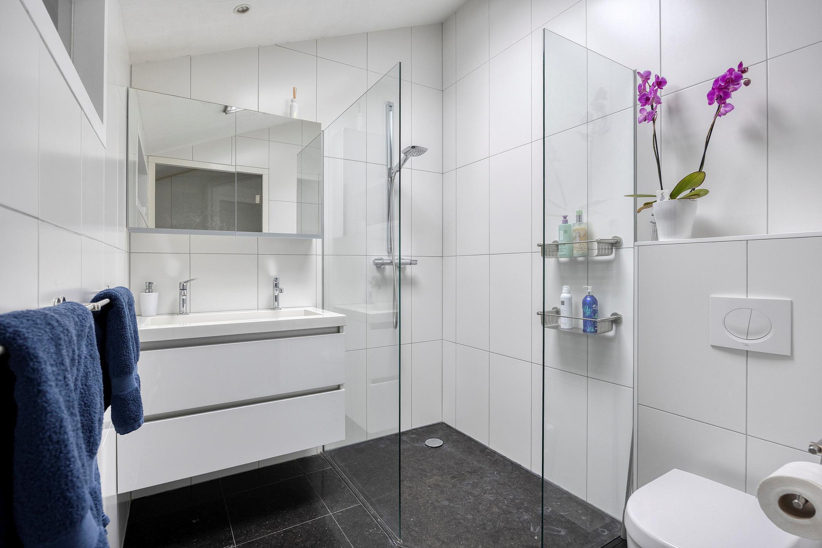 inloopdouche, hangend toilet, wastafelmeubel.