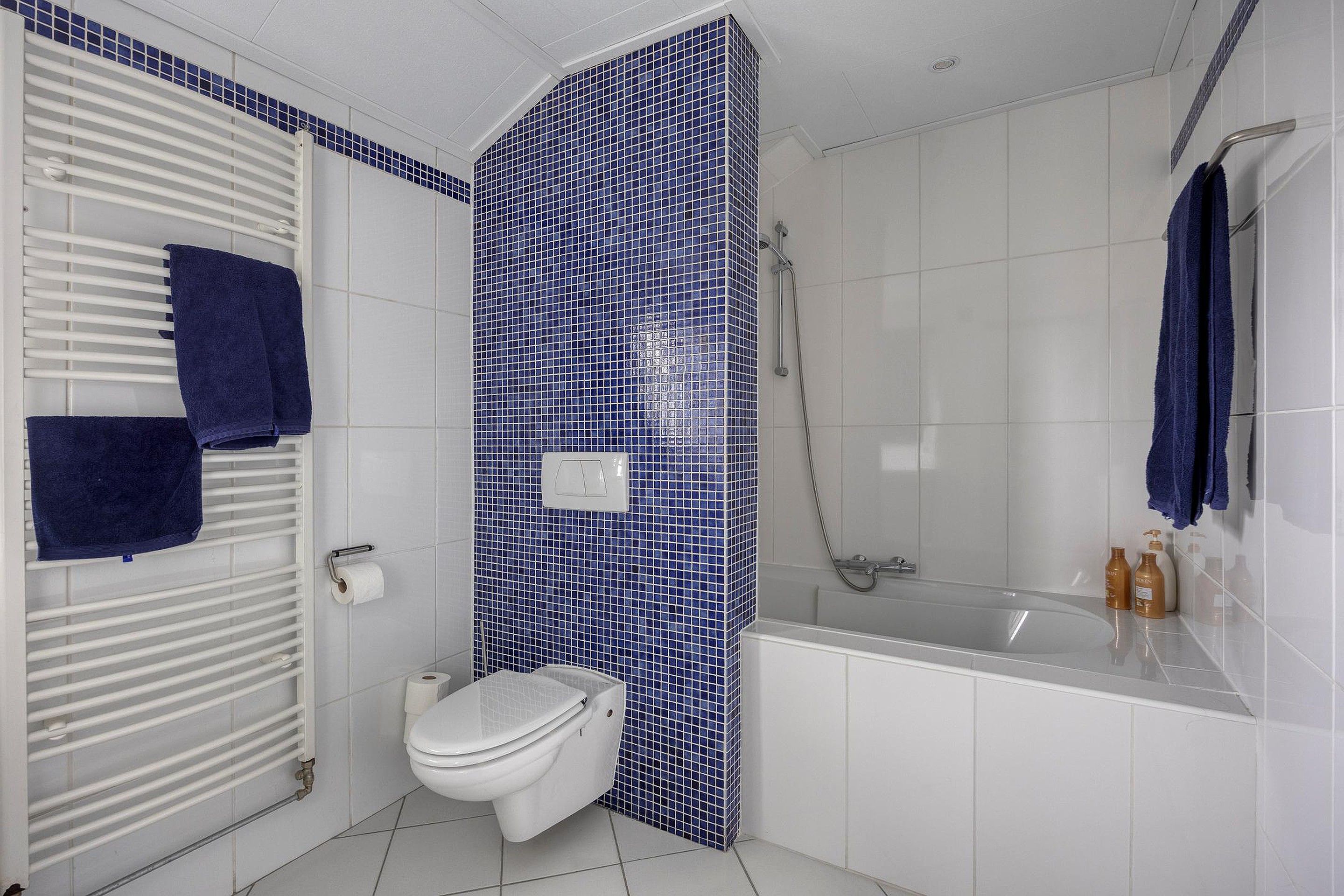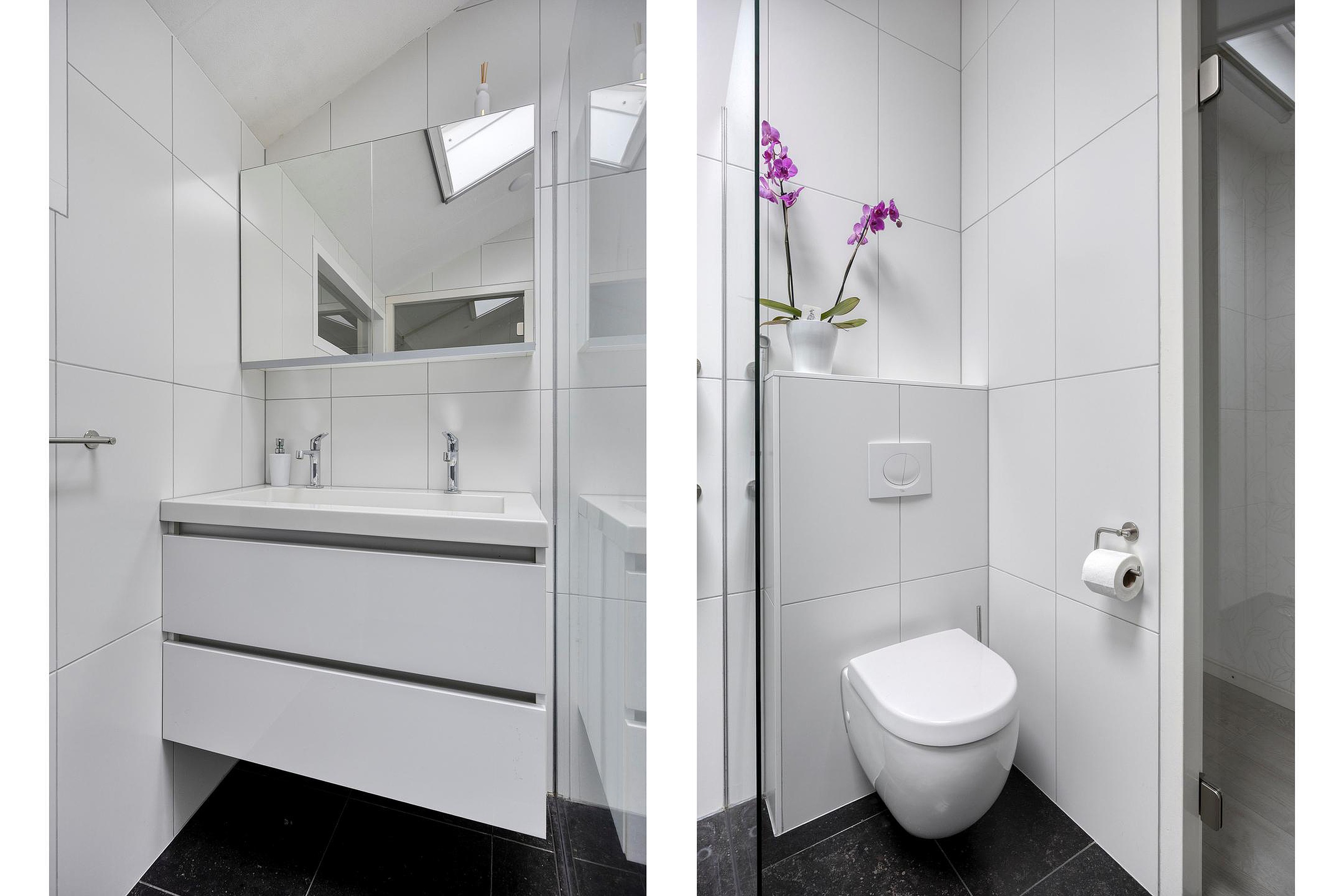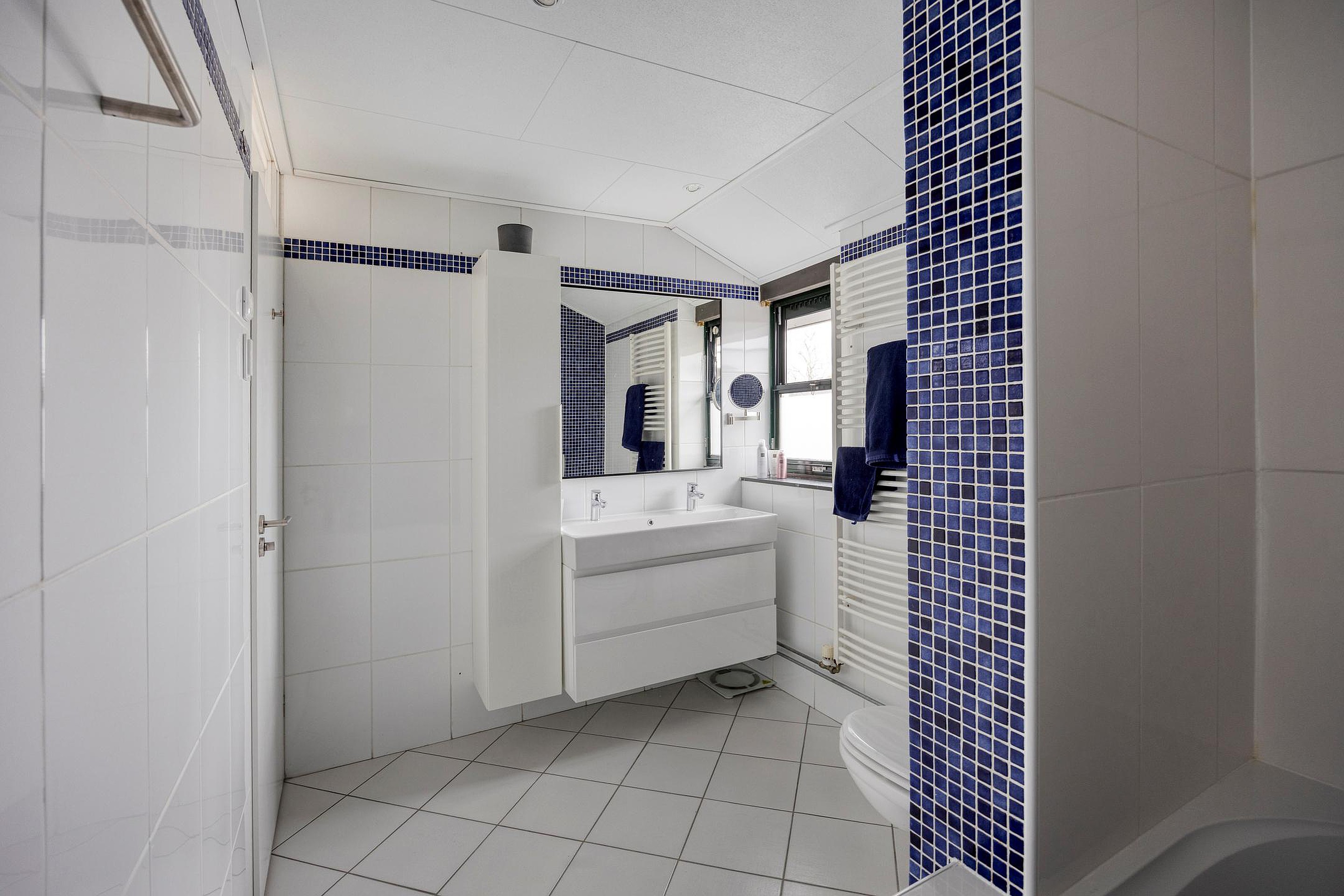 Badkamer v.v. douche/ligbad combinatie, hangend toilet, dubbel wastafelmeubel en handdoekradiator.