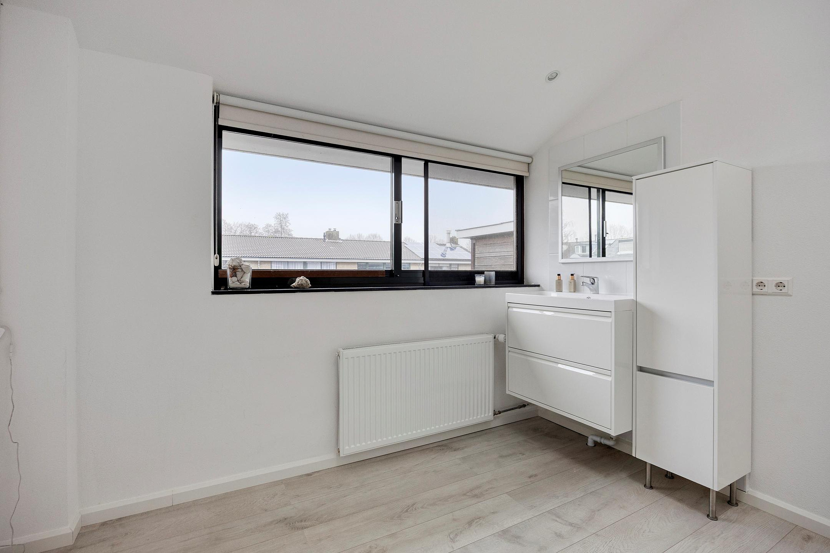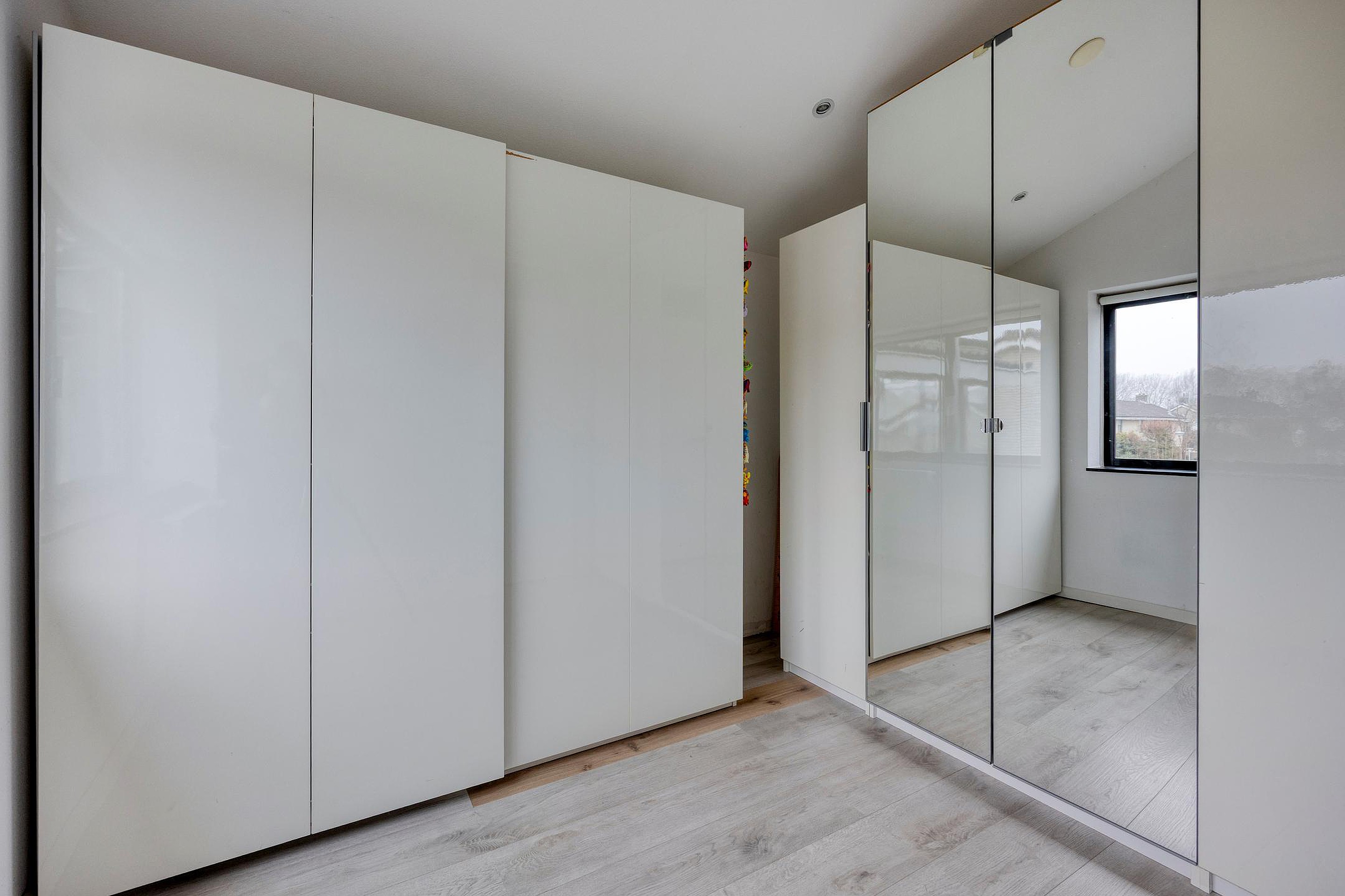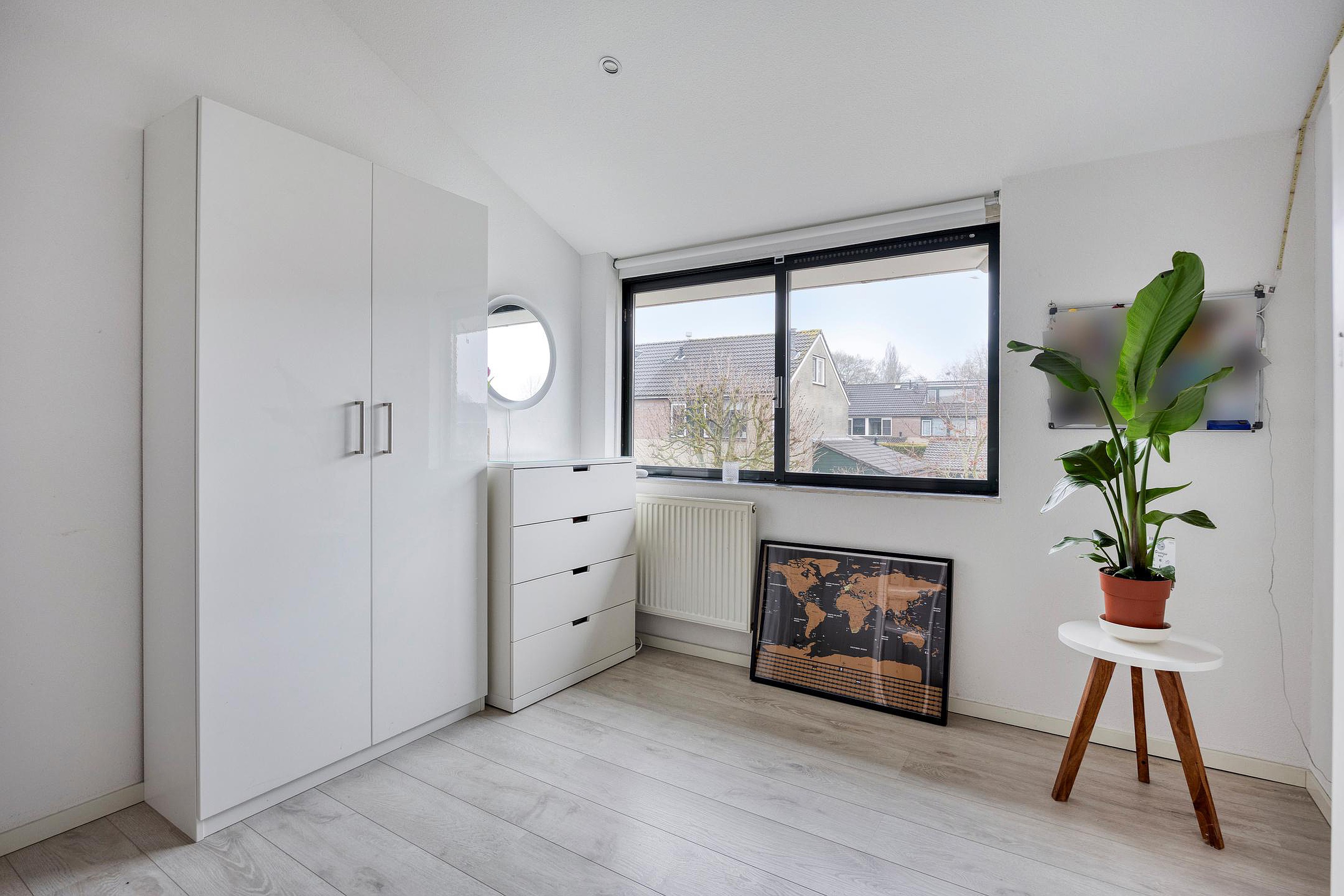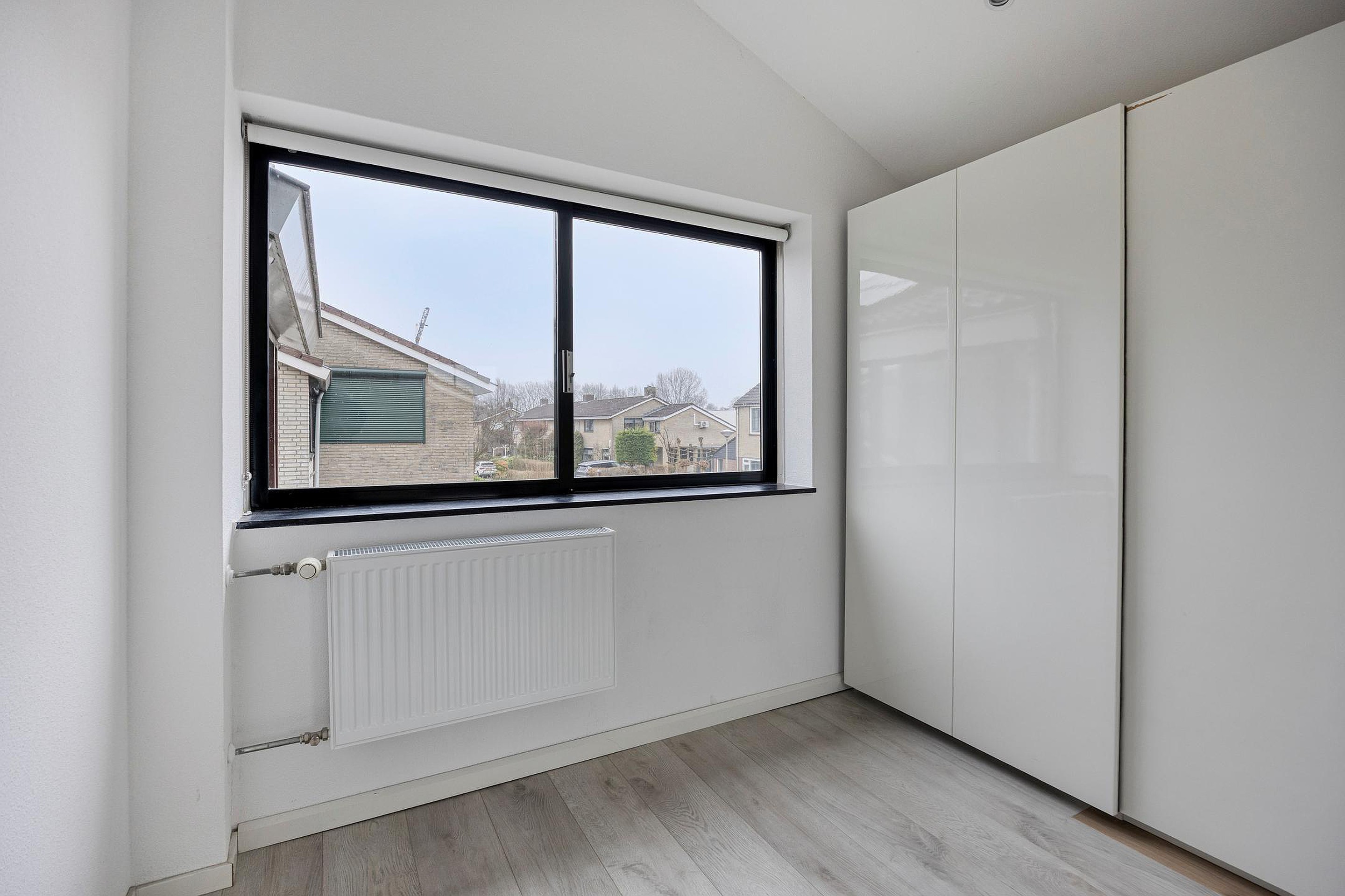 Slaapkamer (4) heeft een groot raam aan de zijkant van het huis en is momenteel in gebruik als kastenruimte.