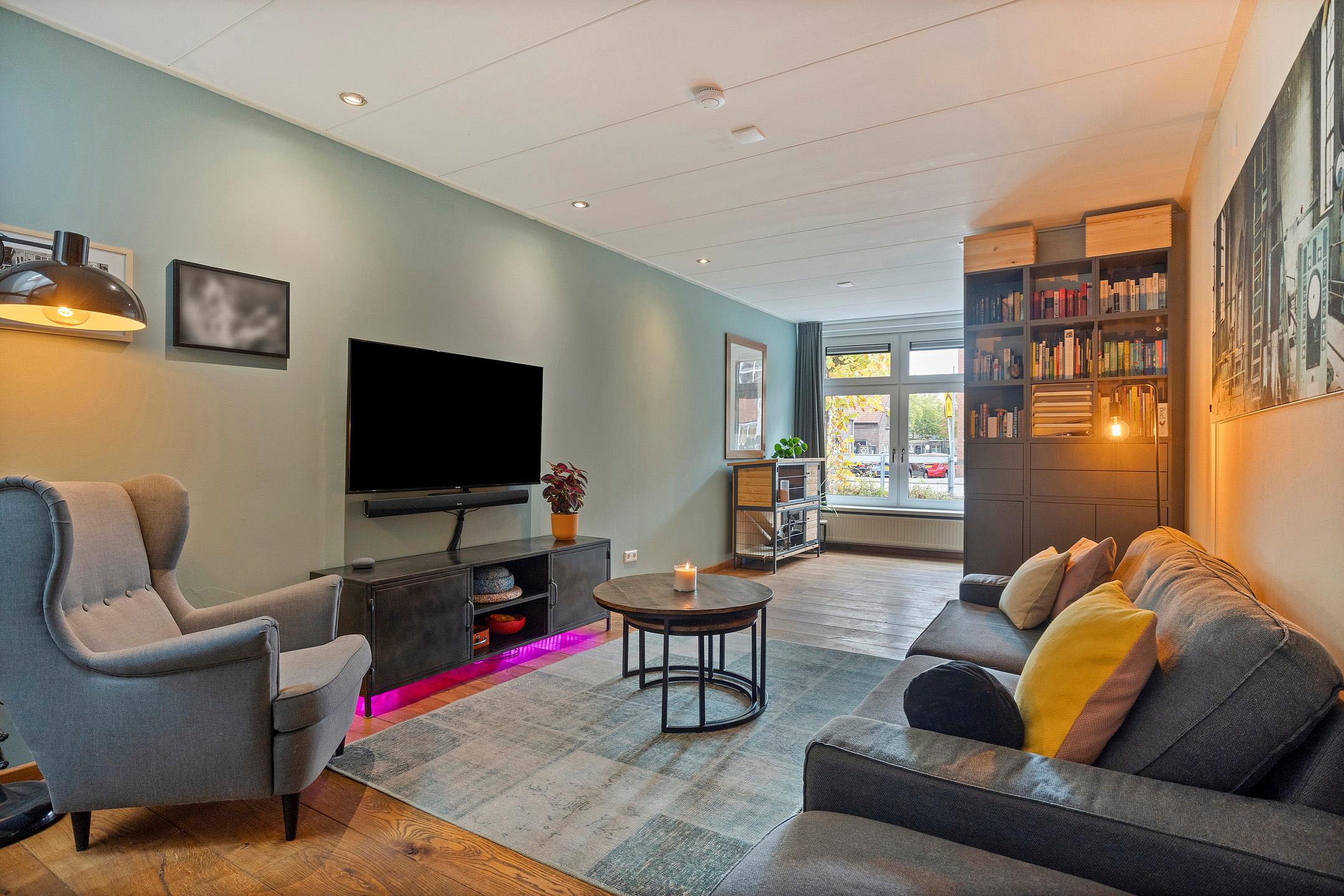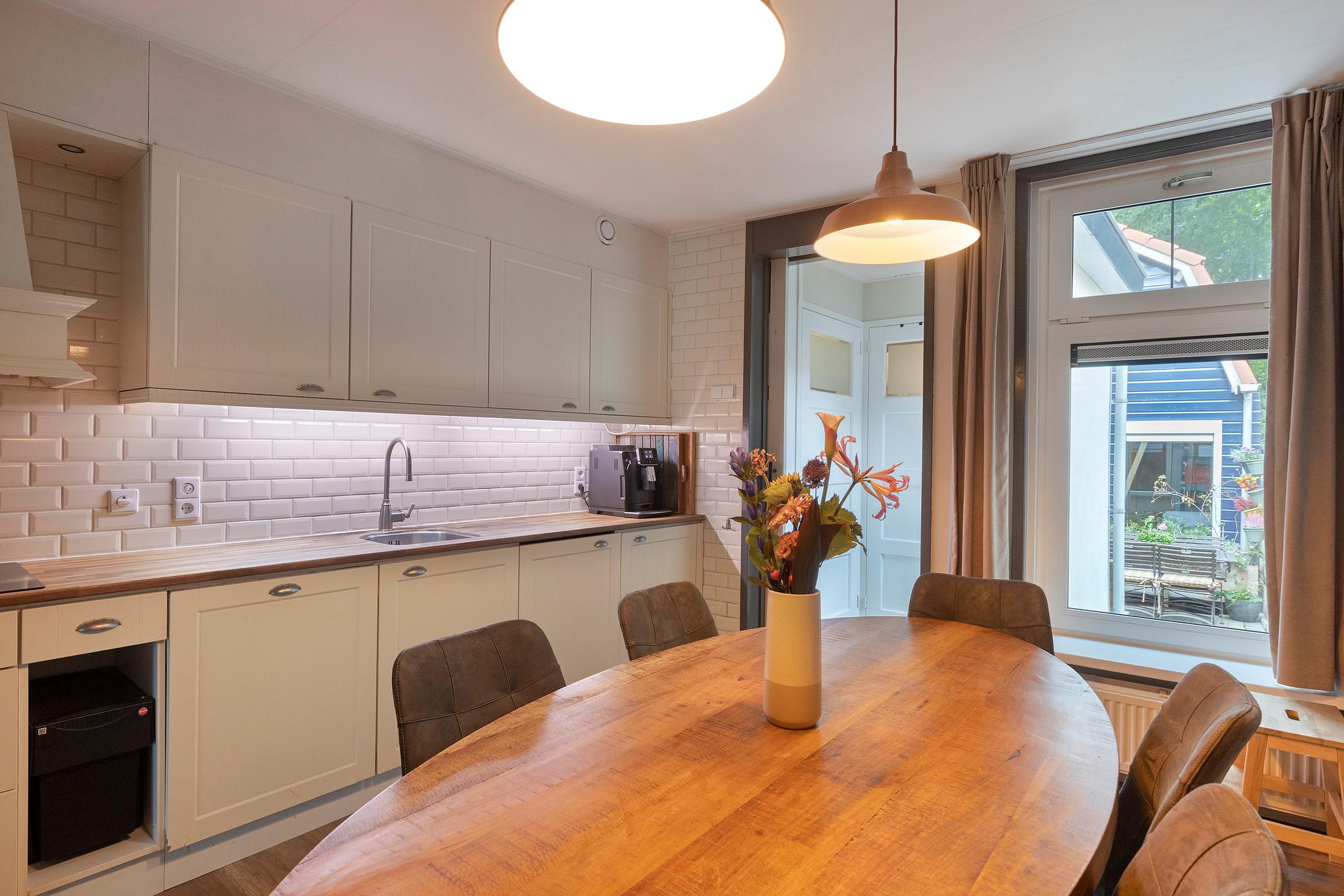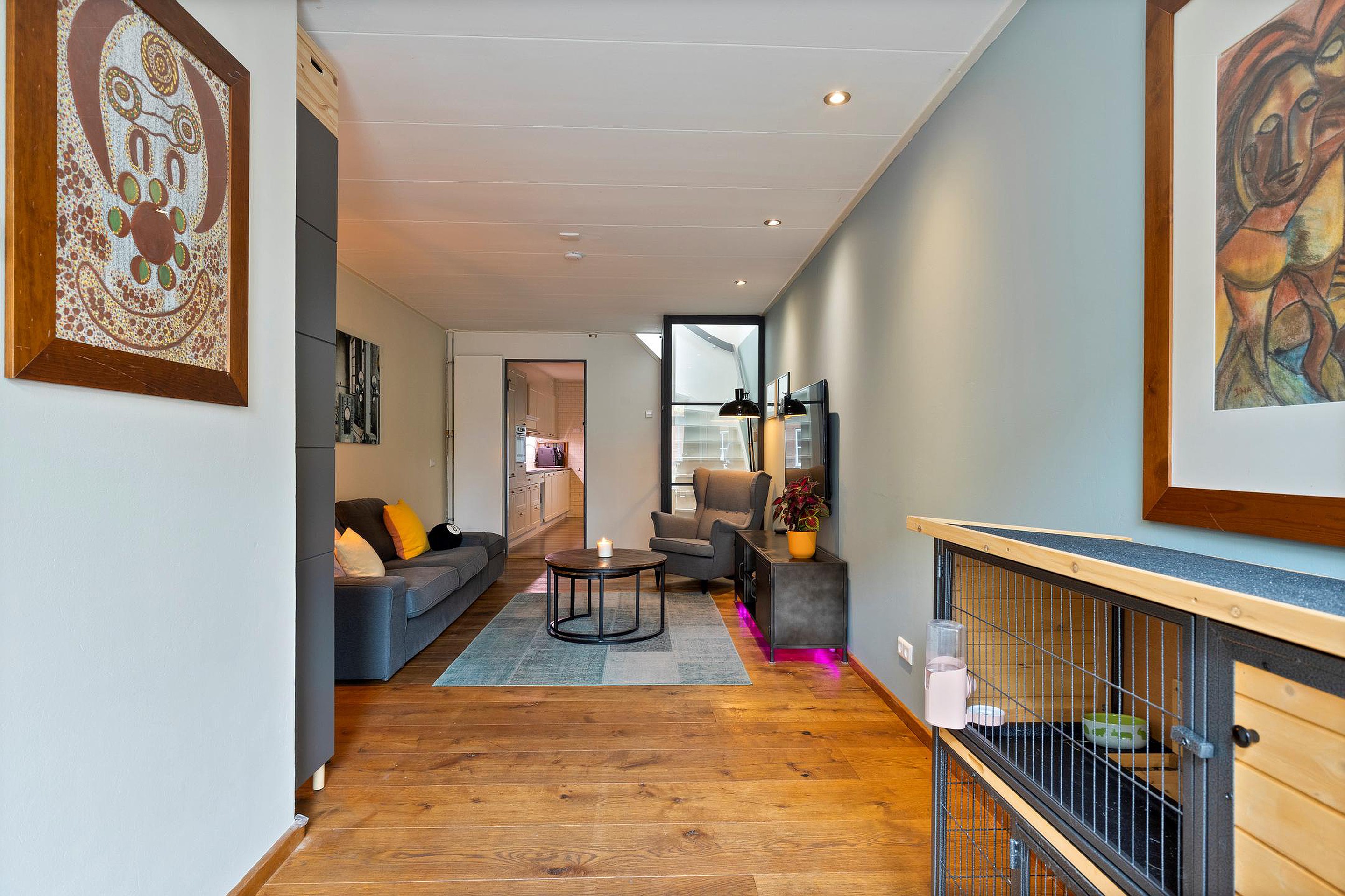 Via de entree met meterkast (11 groepen en aardlekschakelaar) komt u in de lichte woonkamer met prachtig uitzicht over de Karnemelksloot. De woonkamer is voorzien van een hardhouten vloer en openslaande ramen. In 2025 is de trapopgang afgesloten met een stijlvolle zwarte stalen pui.