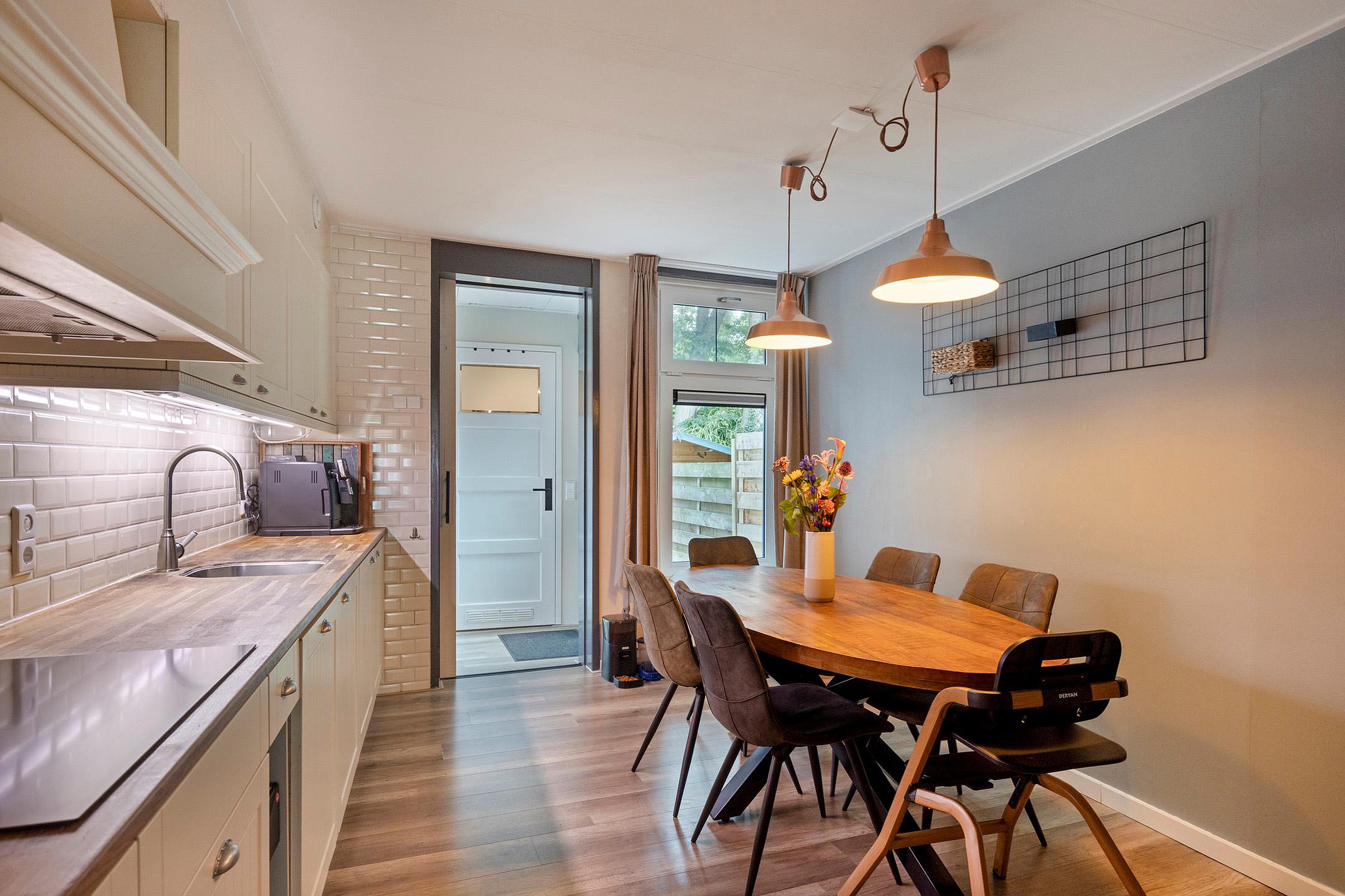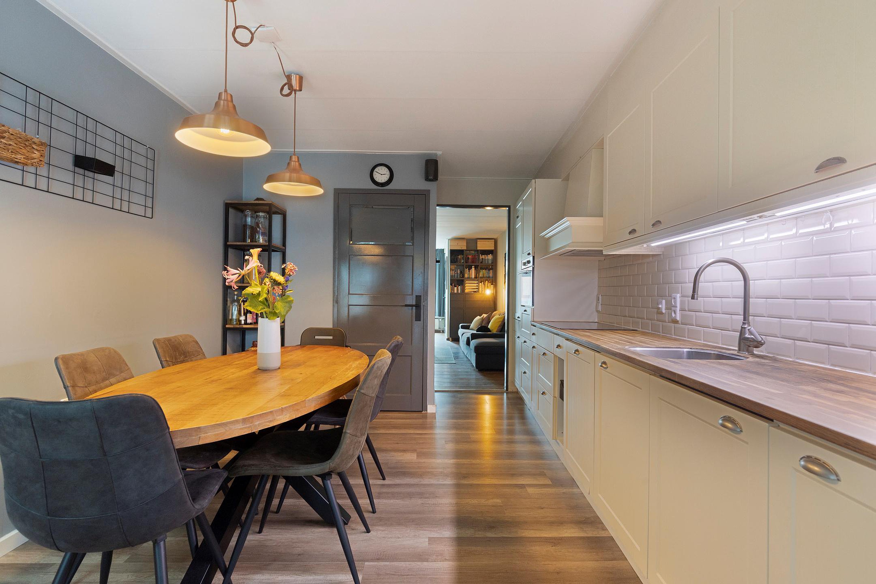 Aansluitend ligt de comfortabele woonkeuken met rechte opstelling, uitgerust met o.a. een 4-pits inductiekookplaat met deels flexibele zones, een afzuigkap in schouw, combi-oven, vaatwasser, kraan en wasmachine. In de ruime trapkast is plek voor schoonmaakspullen, voorraad en opslag.