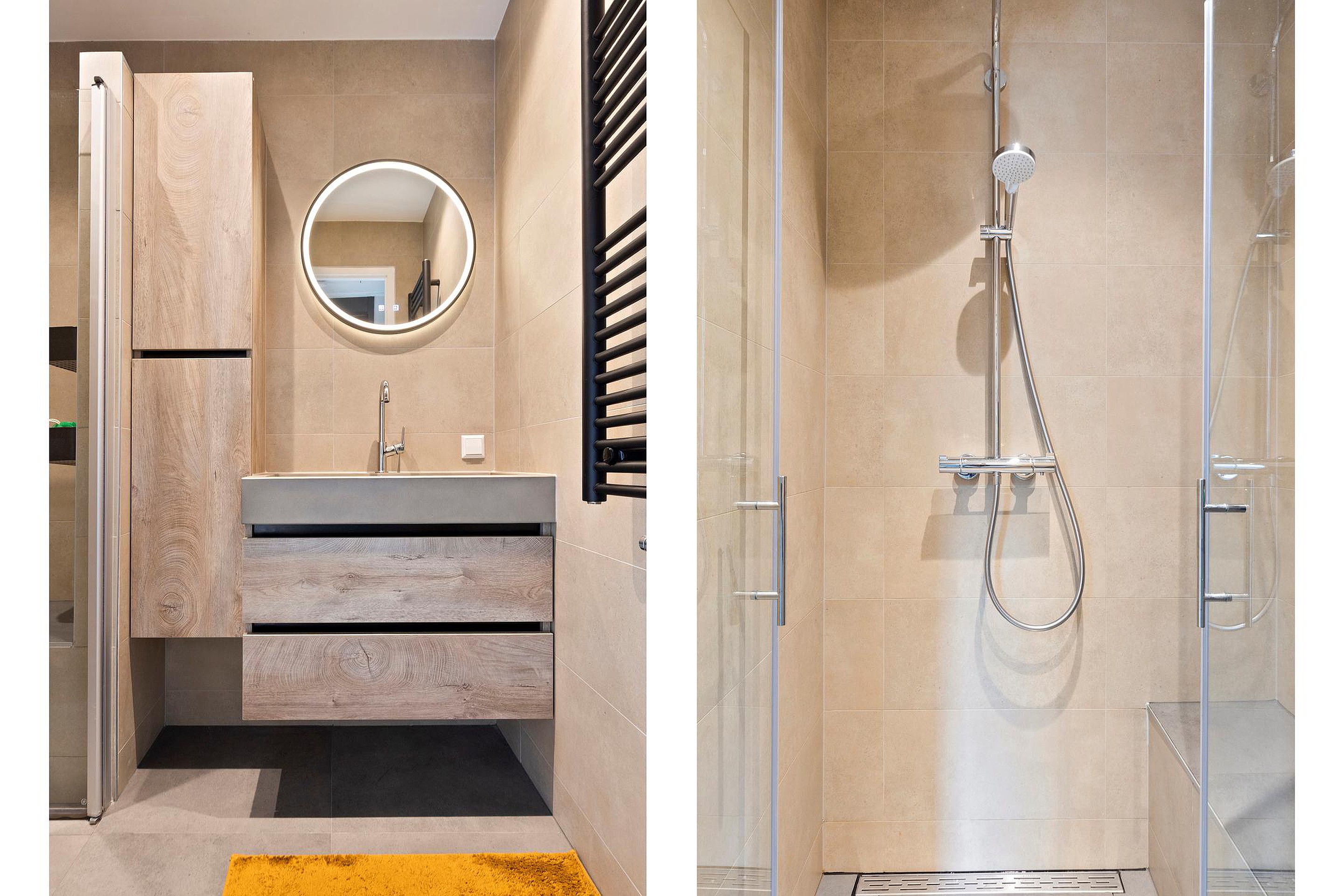 In de aanbouw bevinden zich het toilet en de in 2023 volledig vernieuwde badkamer met regendouche, wastafelmeubel, verwarmde spiegel, dimbare verlichting en designradiator. Vanuit de hal in de aanbouw bereikt u de achtertuin.