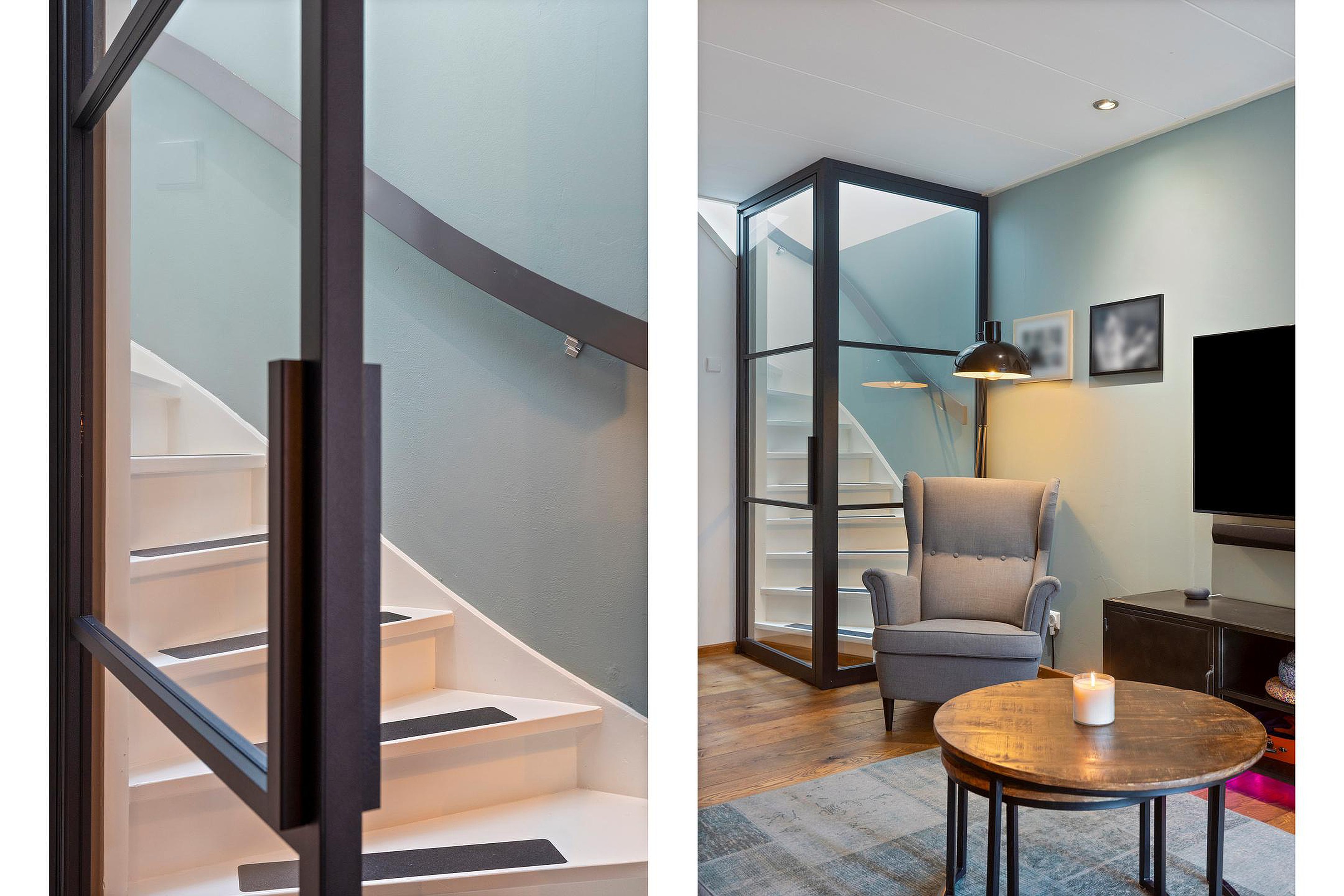 * In 2025 is in de woonkamer een designradiator geplaatst en is de open trap met een zwarte, stalen pui afgesloten.