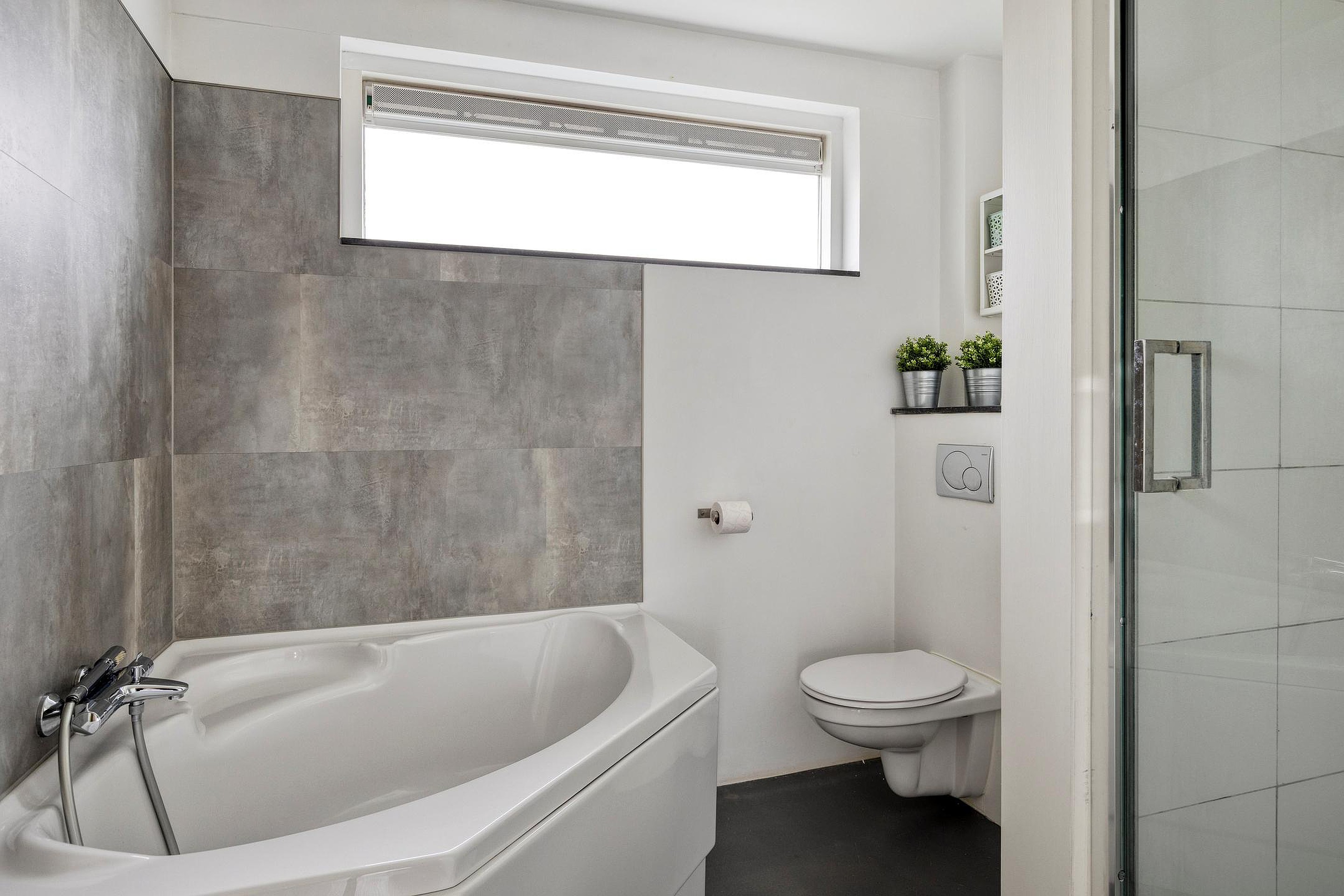 De badkamer heeft een douchecabine, een toilet, wastafel en het bad is in de hoek geplaatst