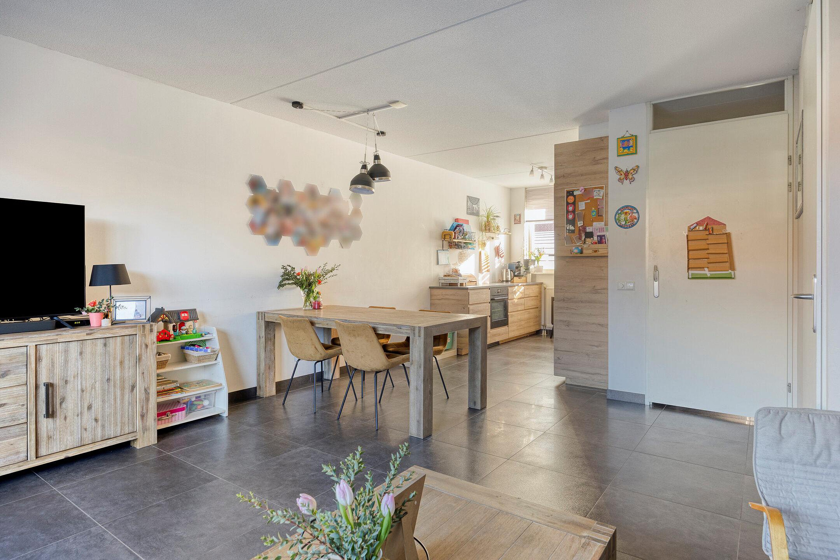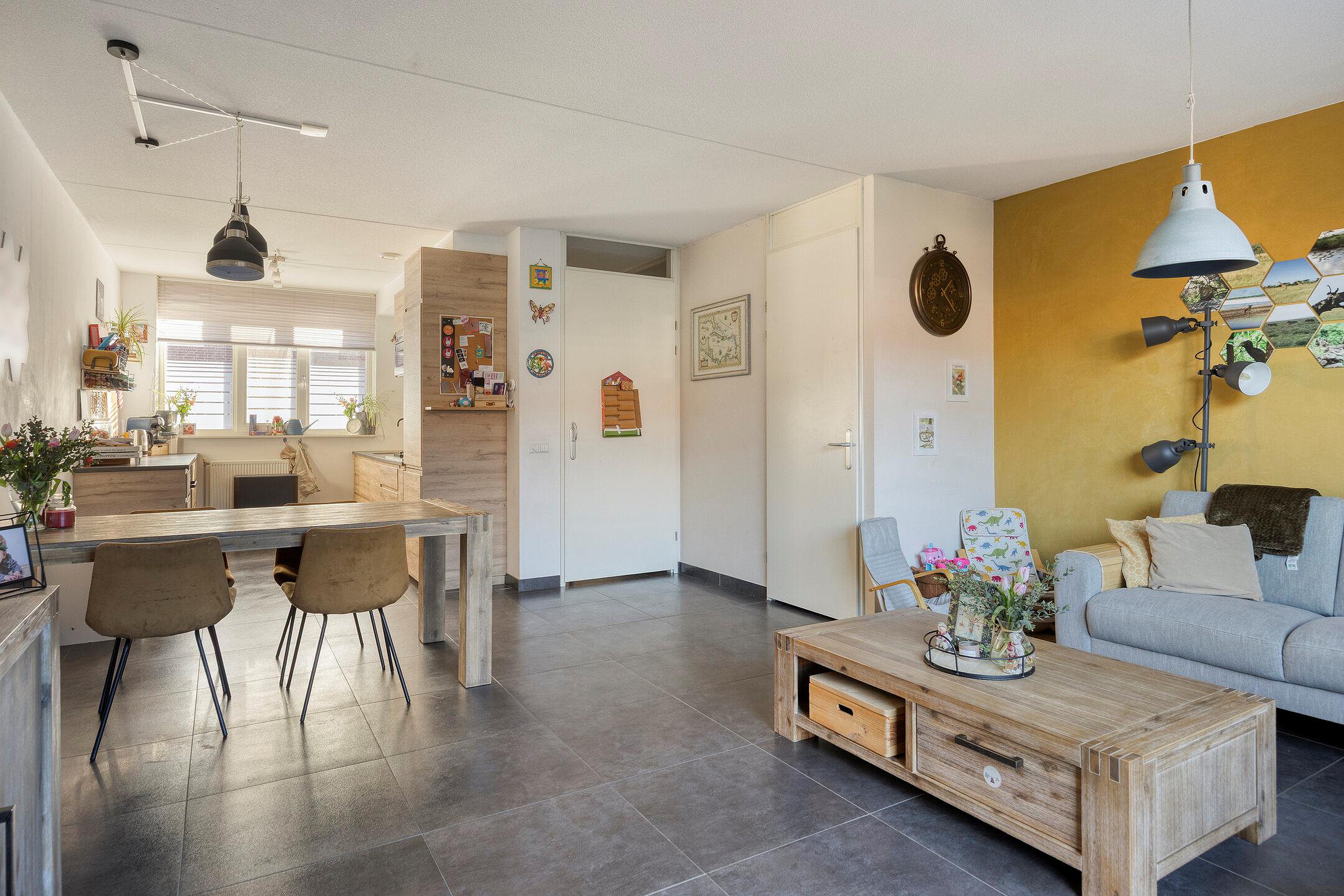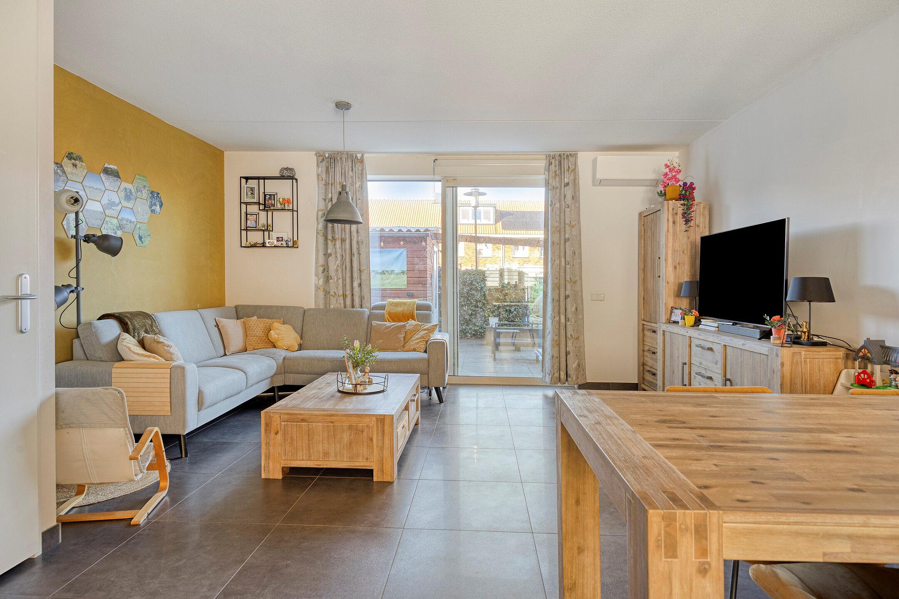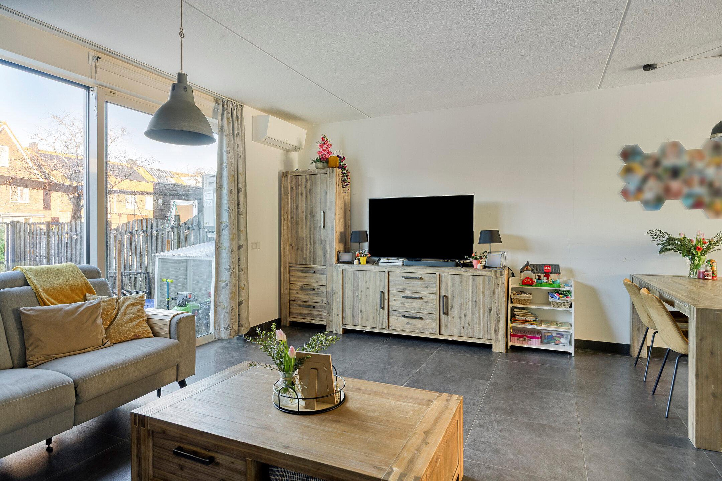 De lichte woonkamer heeft een trapkast en een schuifpui naar de nette achtertuin.