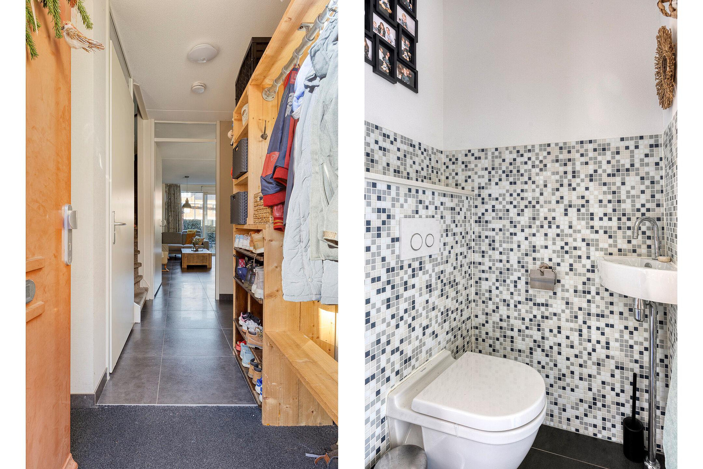 U komt binnen in de ruime hal met meterkast, toiletruimte en de trap naar boven.