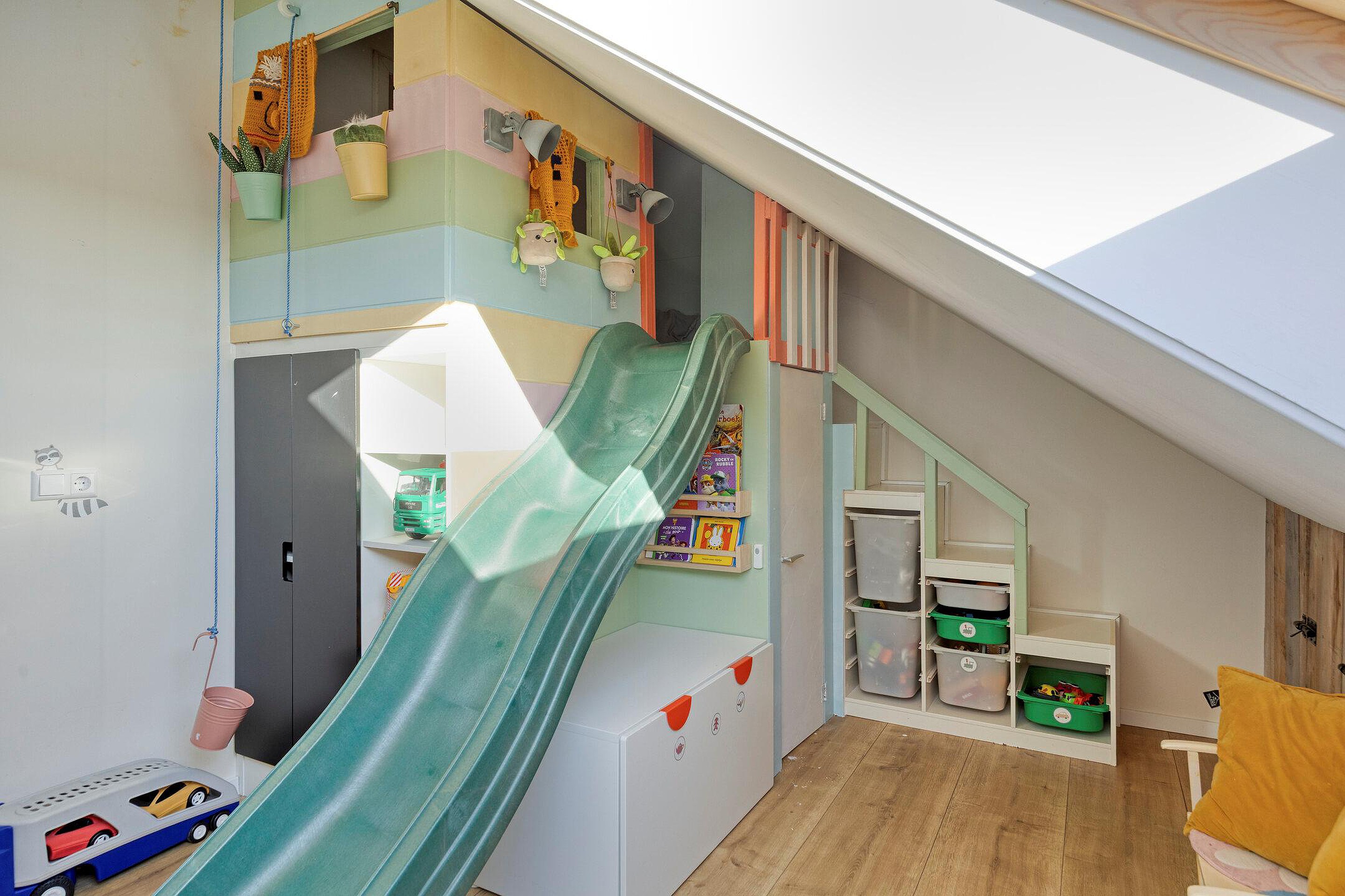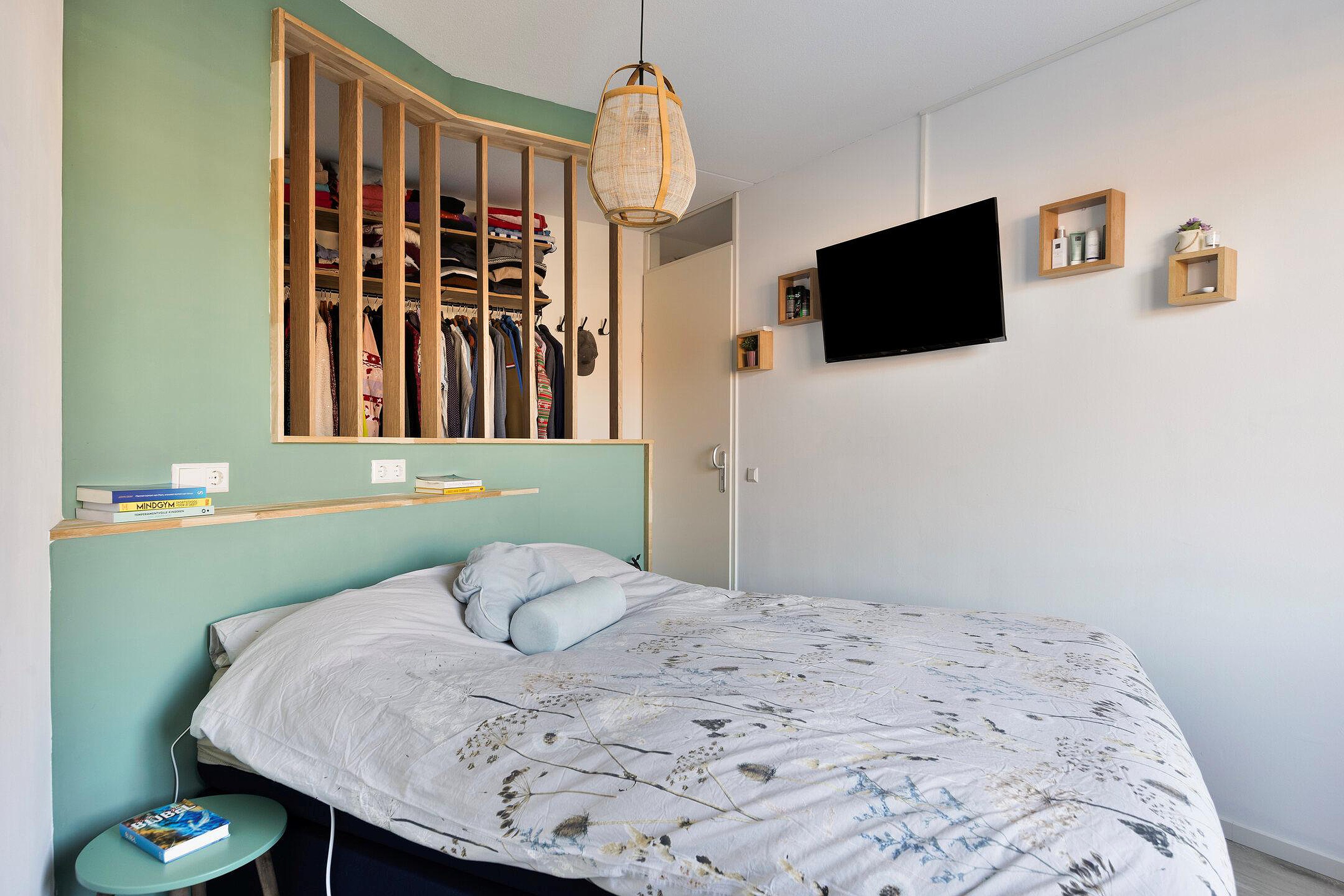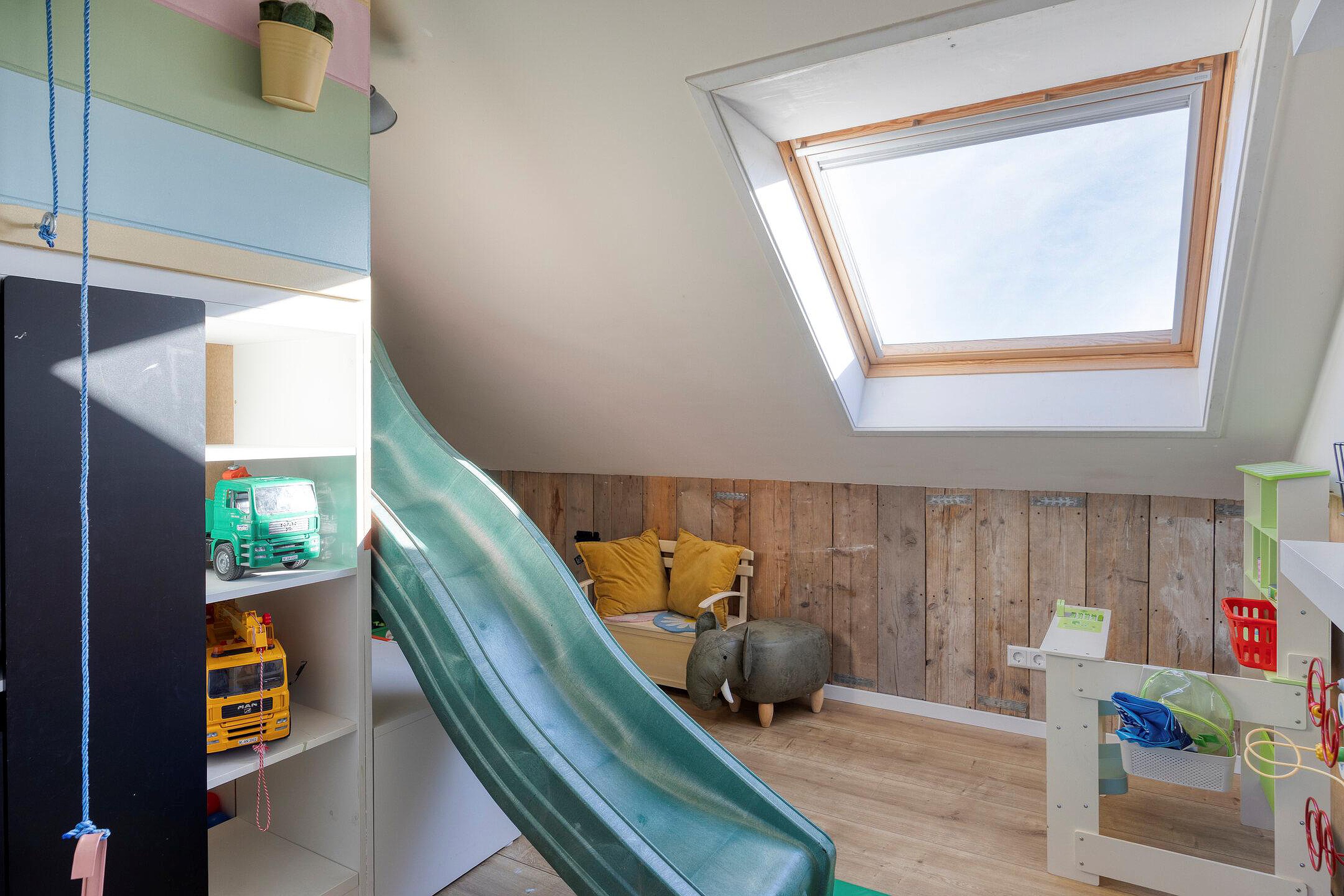 De grote slaapkamer is speels ingericht, voorzien van airco, rolluik en een inloopkast.