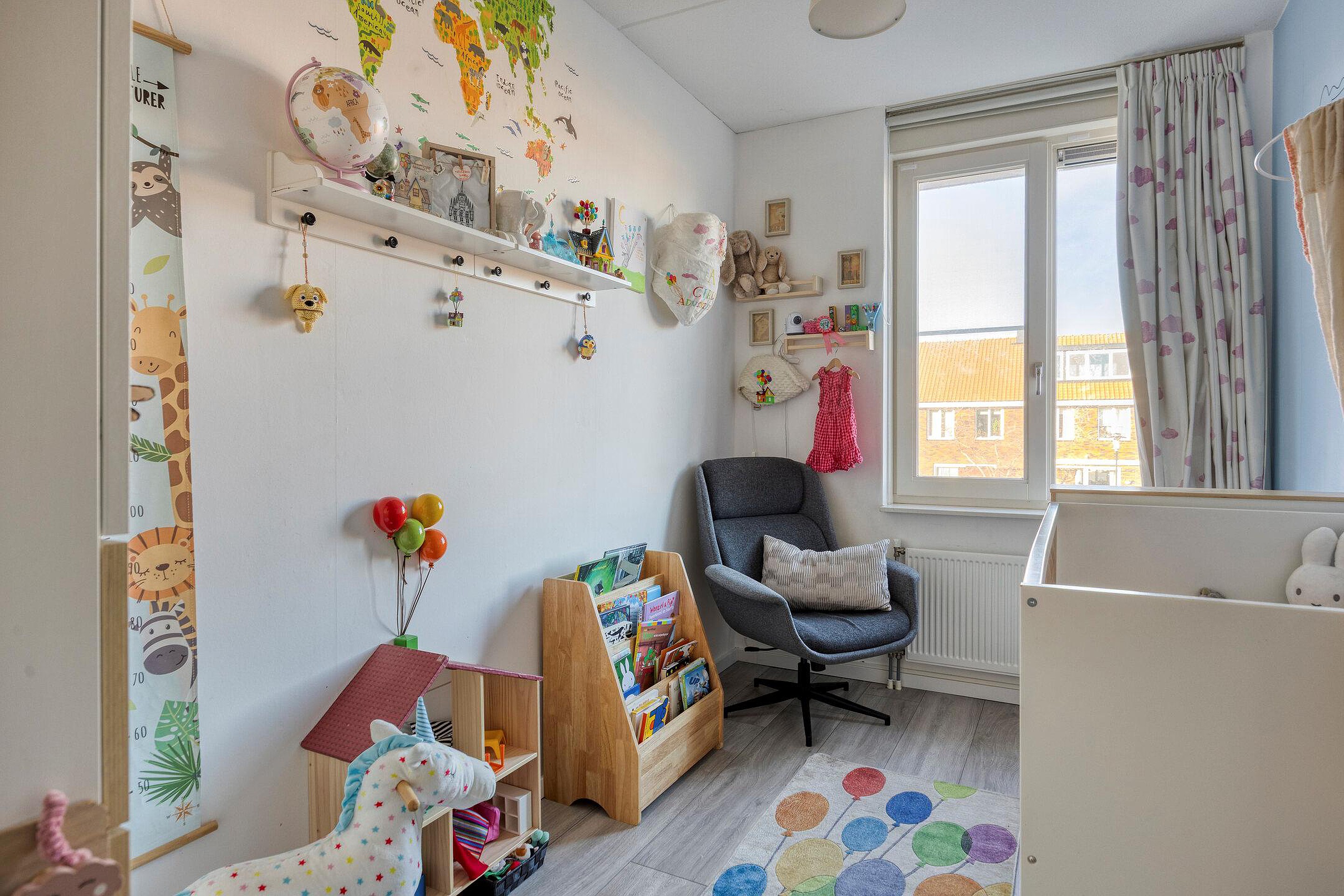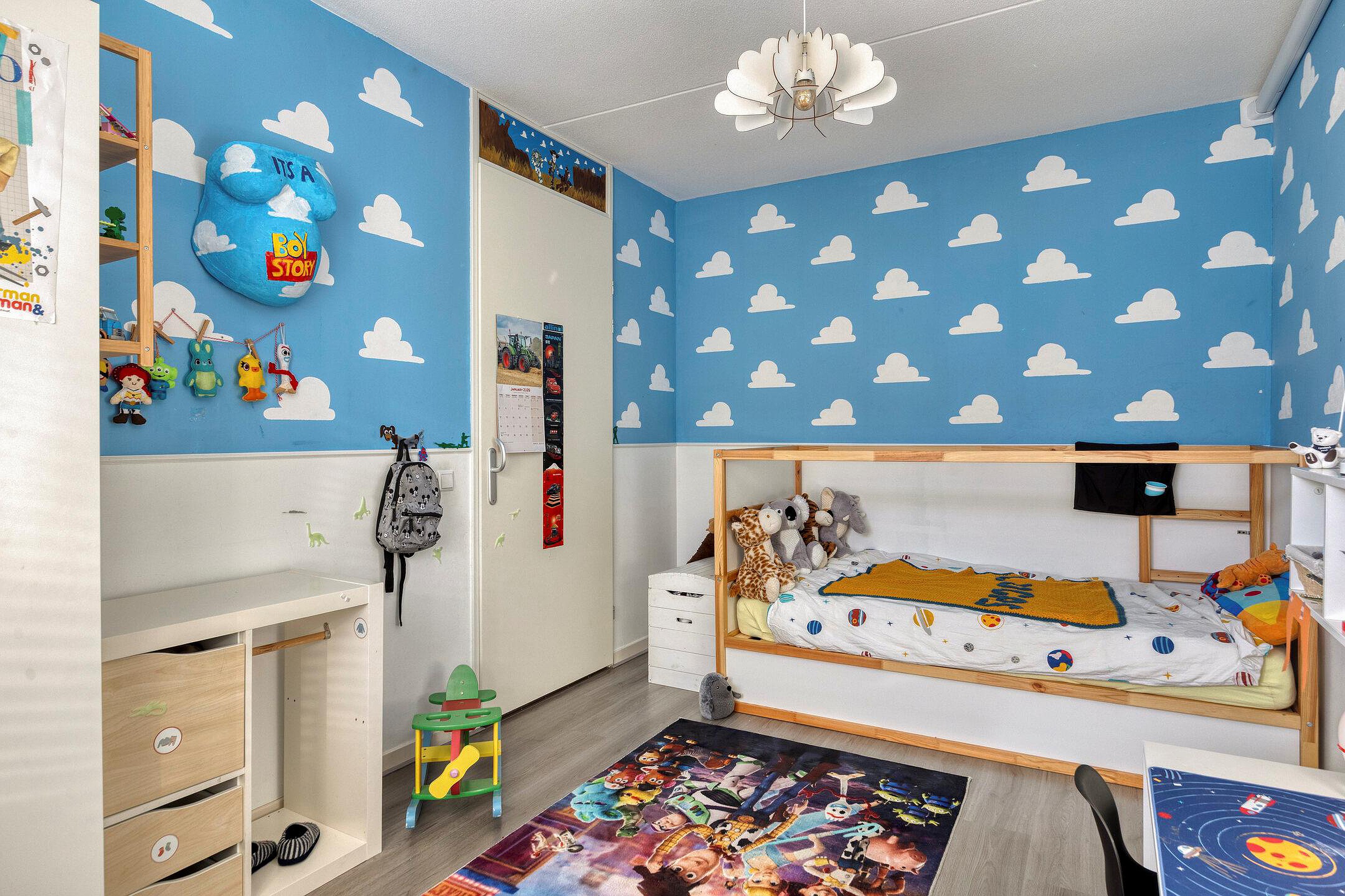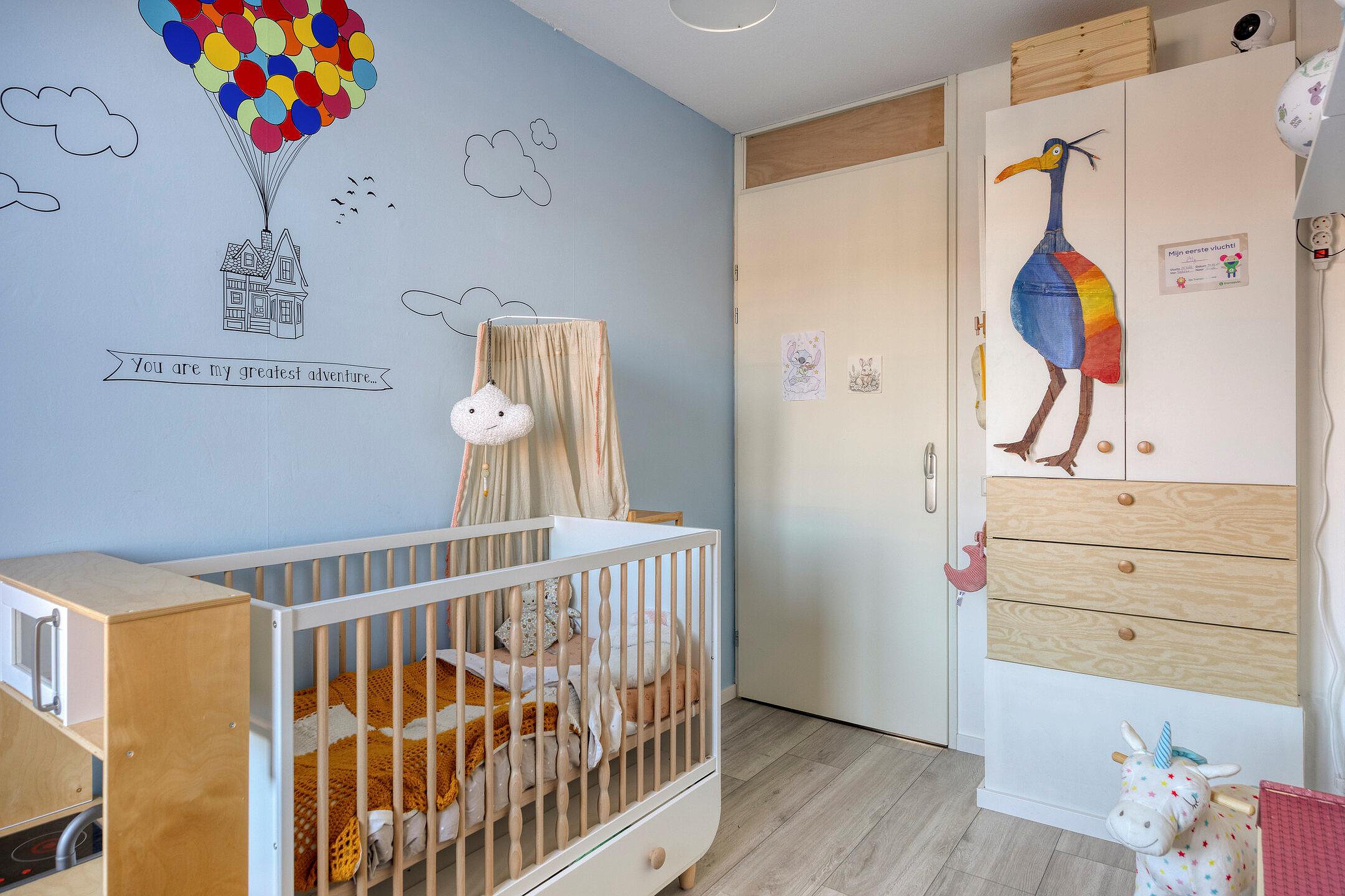 De grote slaapkamer is speels ingericht, voorzien van airco, rolluik en een inloopkast.