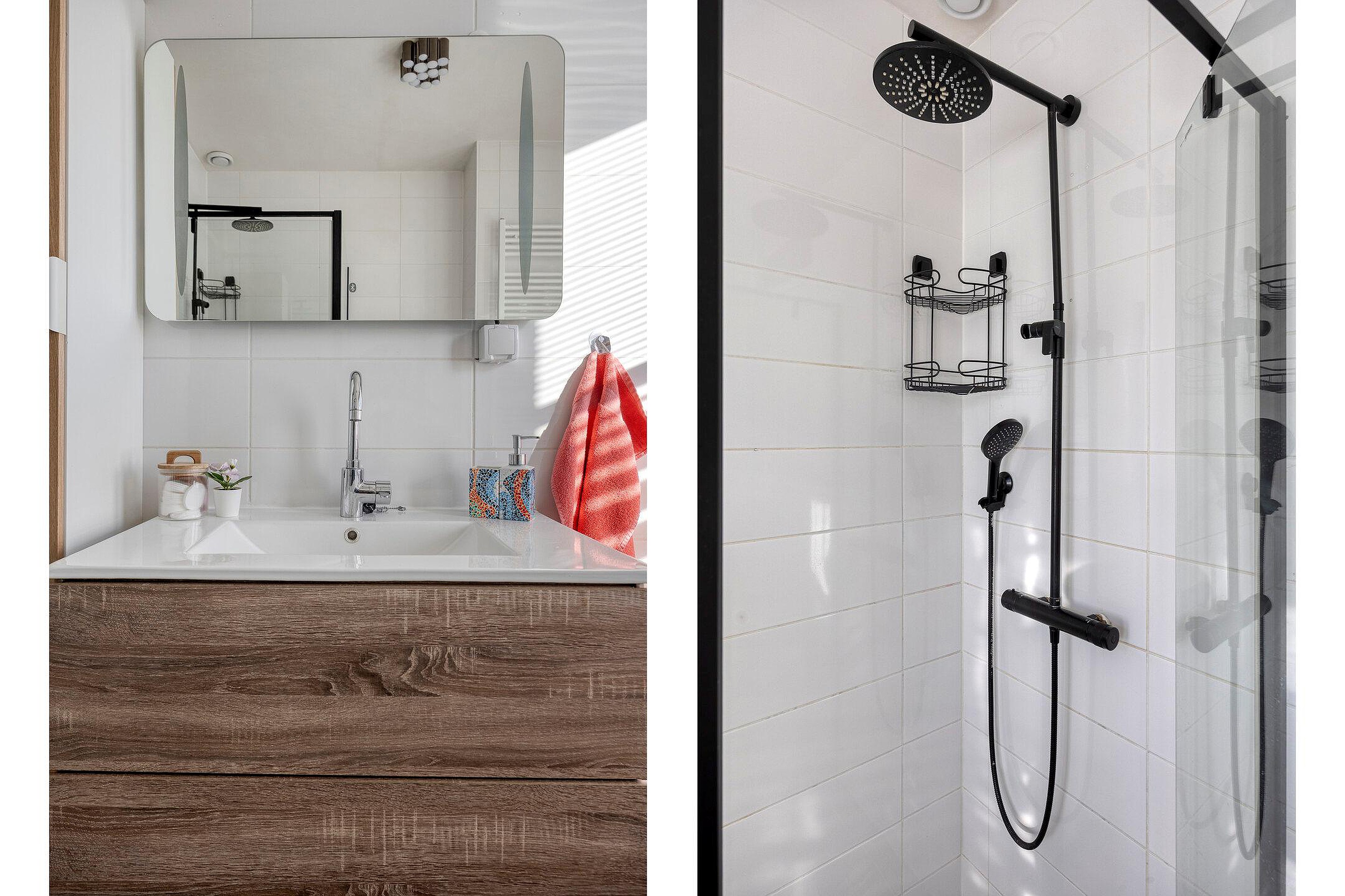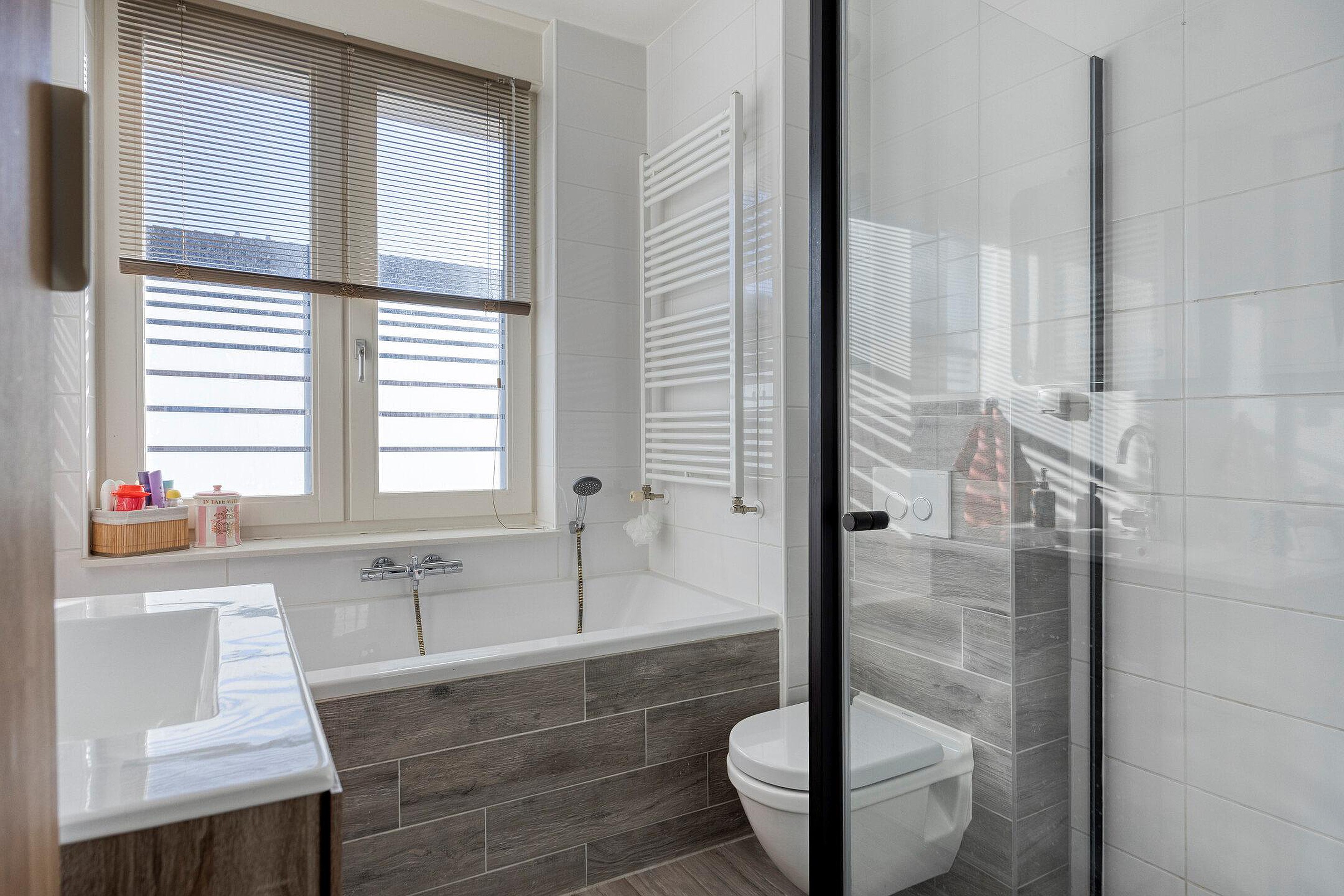 De moderne badkamer is volledig betegeld en uitgerust met een ligbad, douchecabine, wastafelmeubel, handdoekradiator en een tweede toilet.