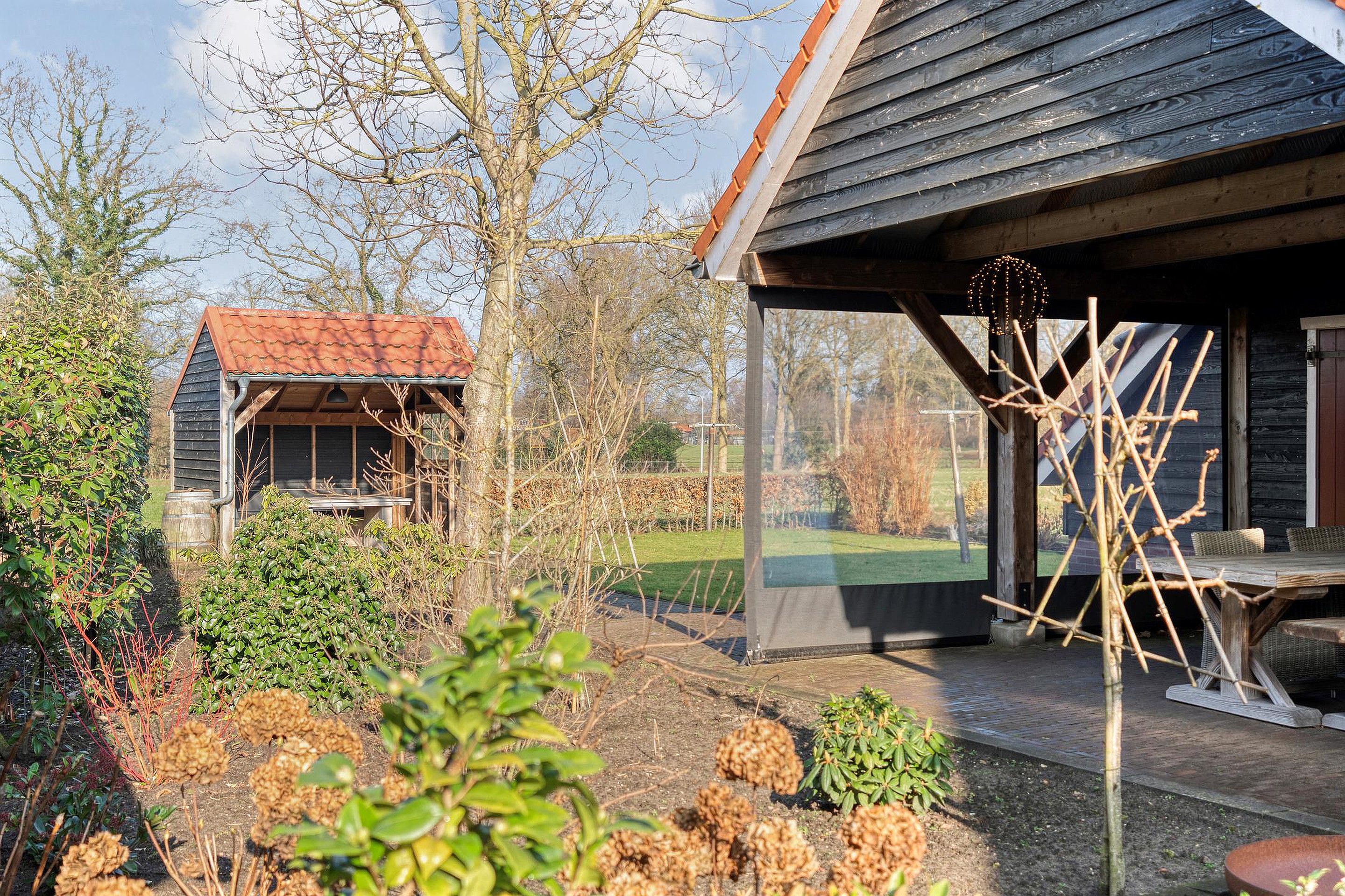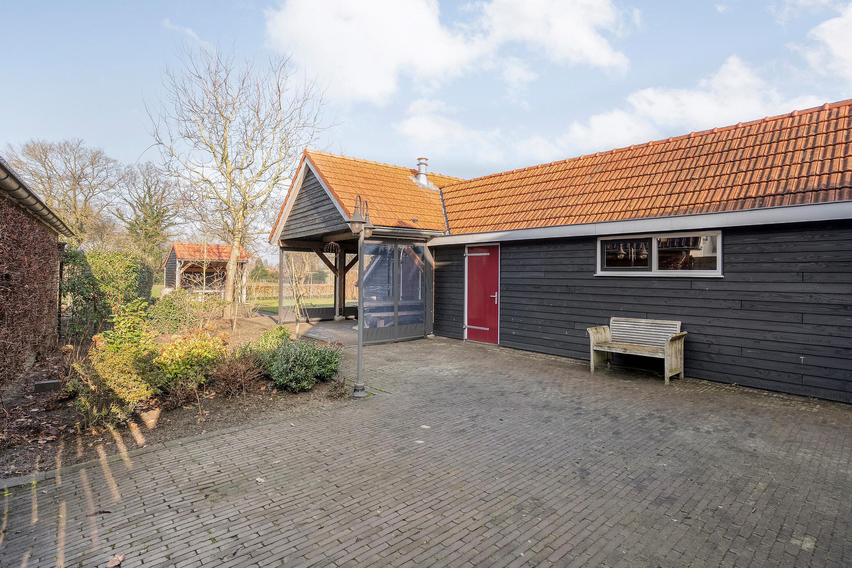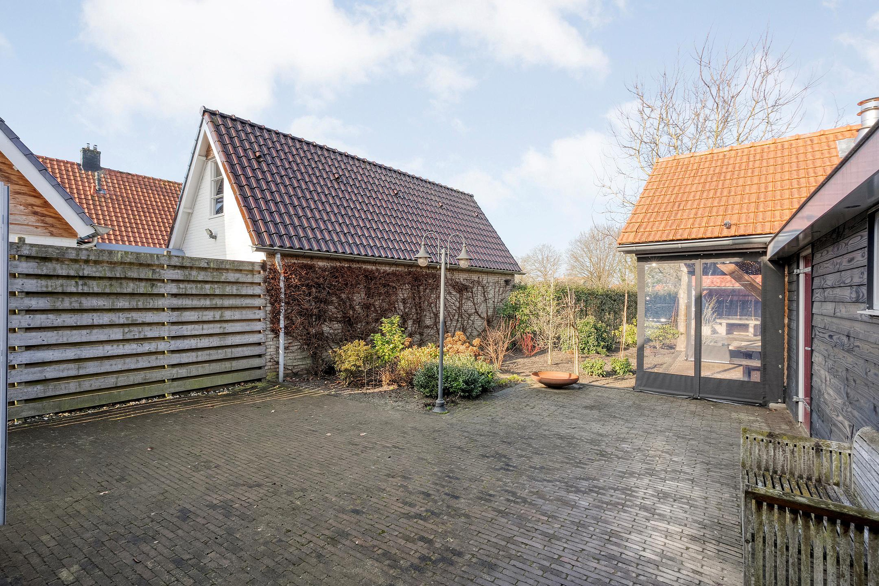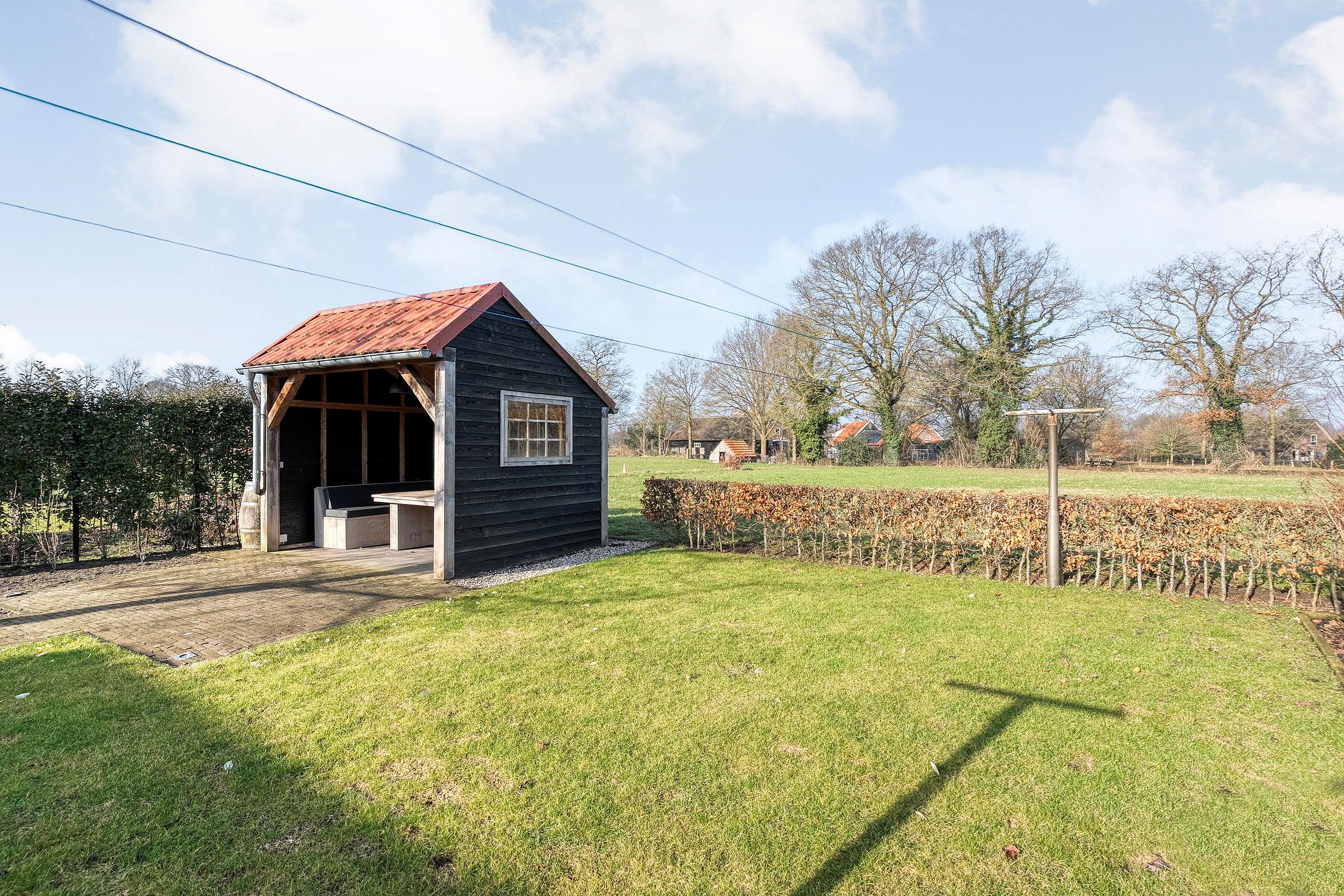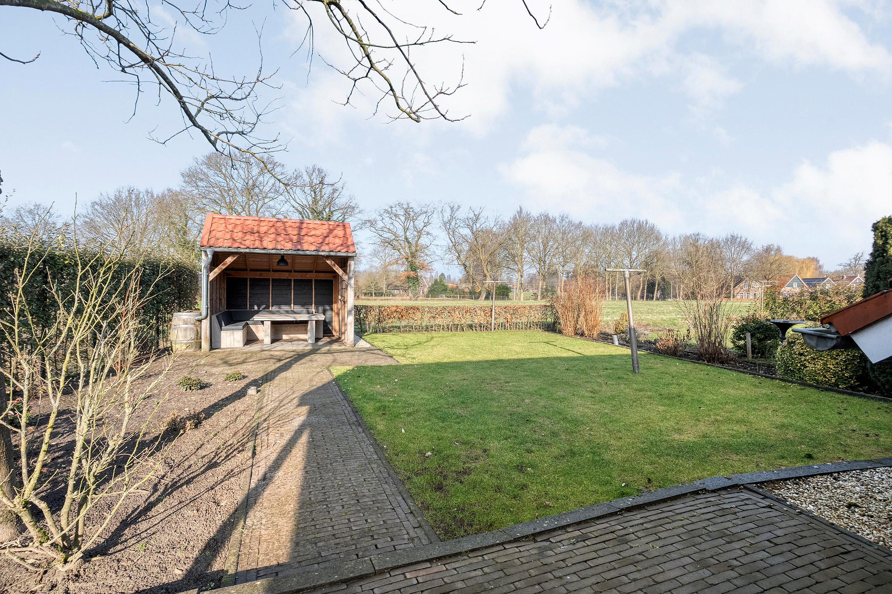 De buitenkant van het huis – en vooral alles wat daaromheen te vinden is – zal menig hart sneller doen kloppen. Stap naar buiten en je stuit op een royale, vrijstaande garage met elektrische garagedeur; ideaal voor wie graag aan auto’s sleutelt, of gewoon een veilige plek zoekt voor de fietsen, motor, caravan of gereedschappen. En dat is nog niet alles: er is een praktische vliering (extra bergruimte dus!), een apart schuurgedeelte én een handige aangrenzende overkapping/veranda waar je tot laat in het najaar nog kunt genieten van een hapje en een drankje.