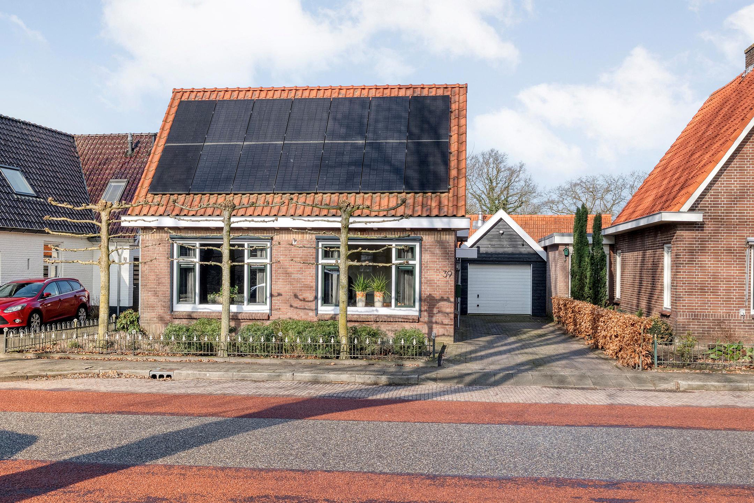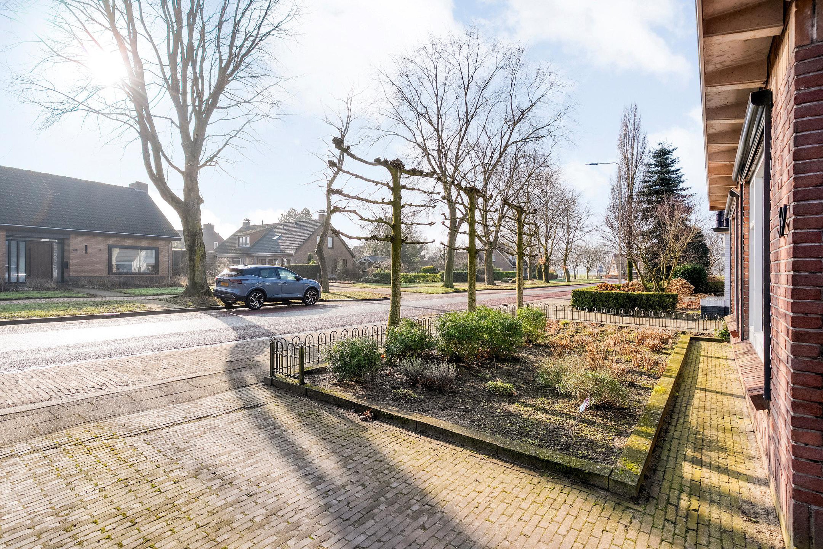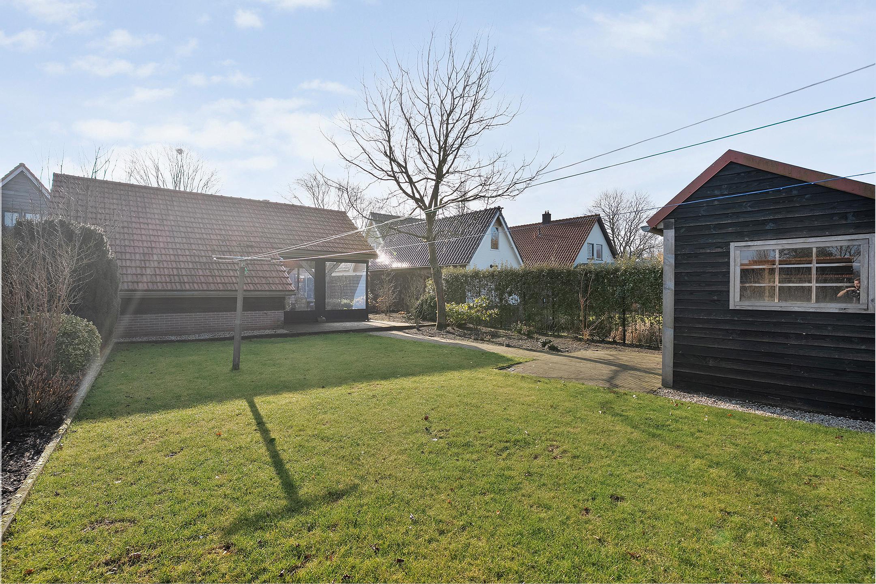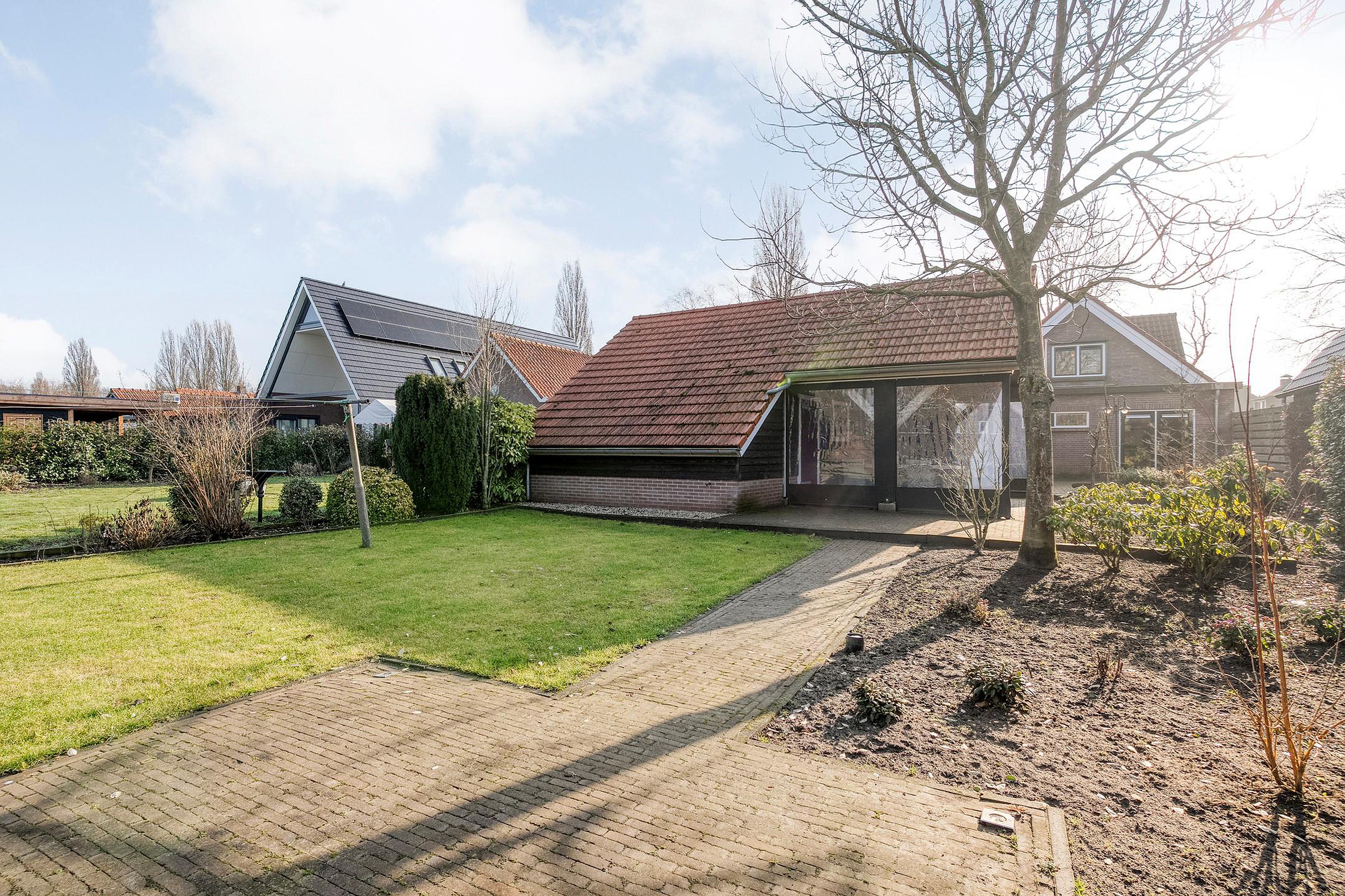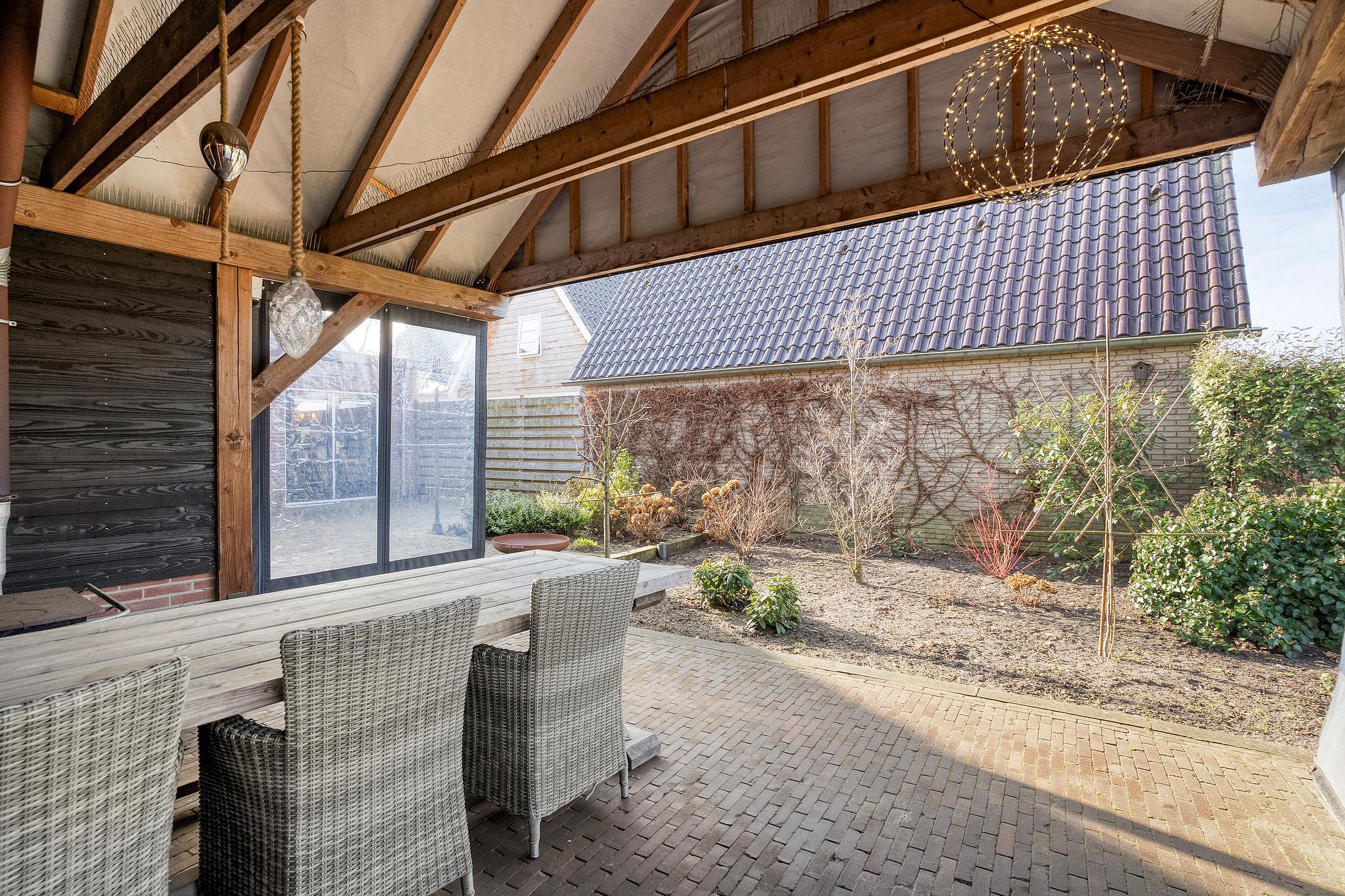 De buitenkant van het huis – en vooral alles wat daaromheen te vinden is – zal menig hart sneller doen kloppen. Stap naar buiten en je stuit op een royale, vrijstaande garage met elektrische garagedeur; ideaal voor wie graag aan auto’s sleutelt, of gewoon een veilige plek zoekt voor de fietsen, motor, caravan of gereedschappen. En dat is nog niet alles: er is een praktische vliering (extra bergruimte dus!), een apart schuurgedeelte én een handige aangrenzende overkapping/veranda waar je tot laat in het najaar nog kunt genieten van een hapje en een drankje.