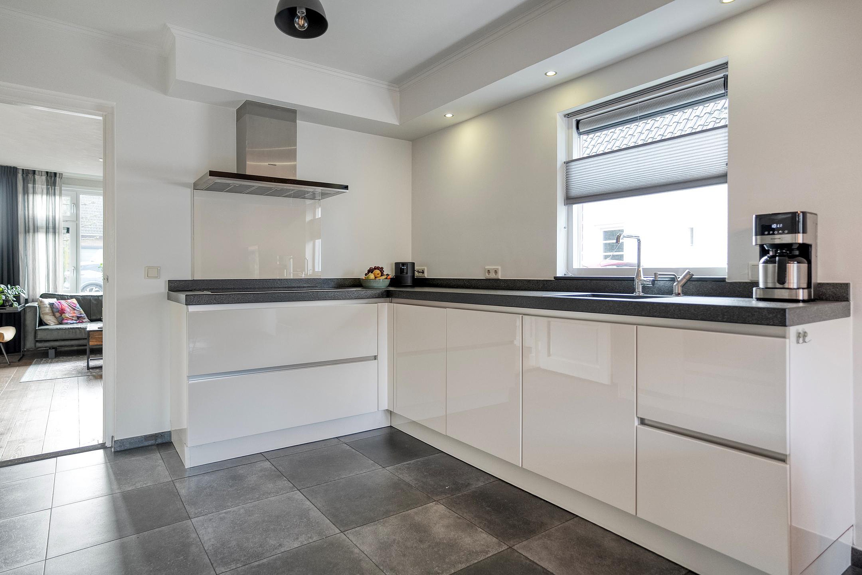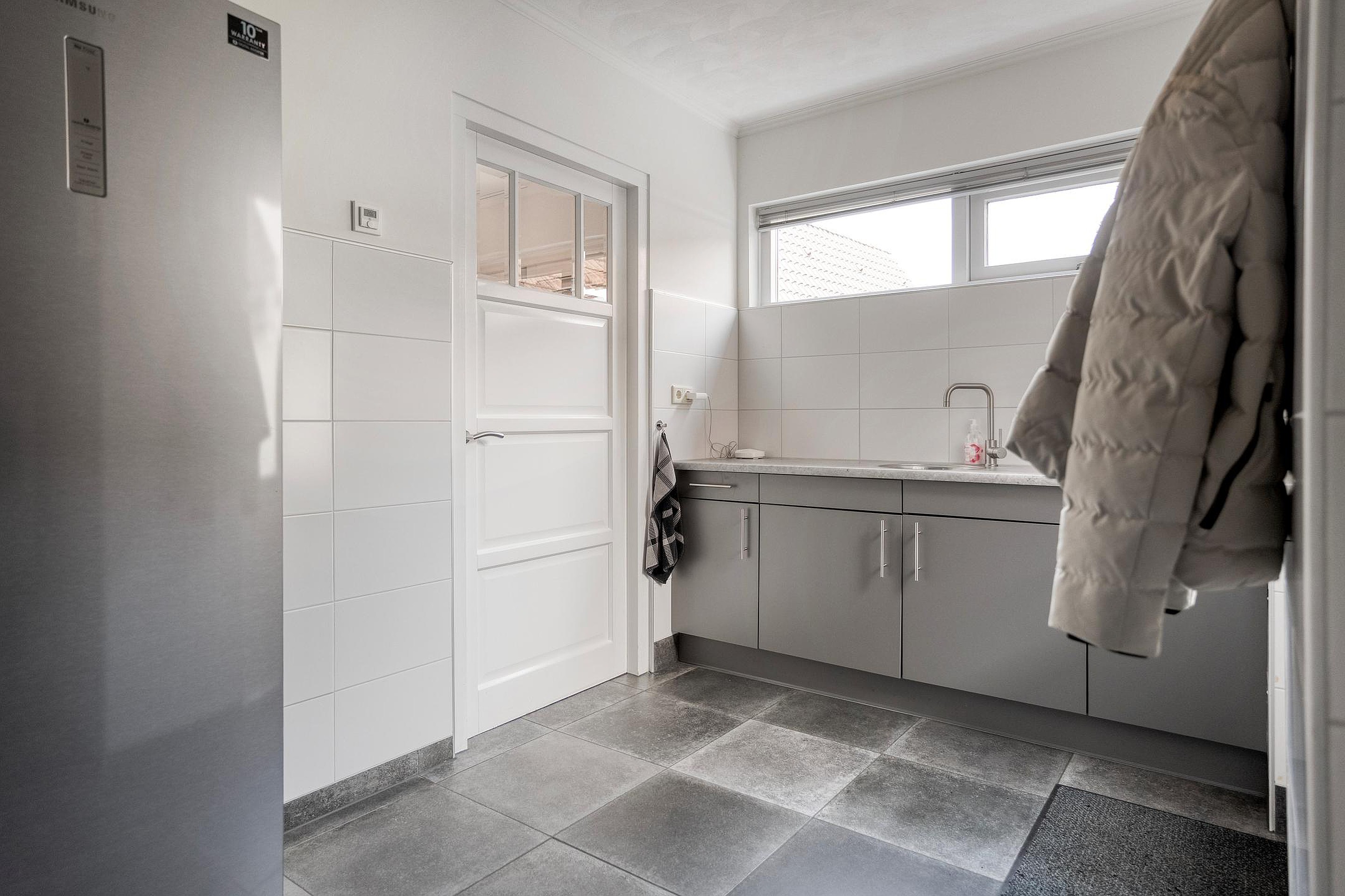 Aan de tuinzijde bevindt zich de woonkeuken met verschillende inbouwapparatuur alsmede de bijkeuken met apart keukenblok, wasmachine aansluitingen en de c.v. installatie.