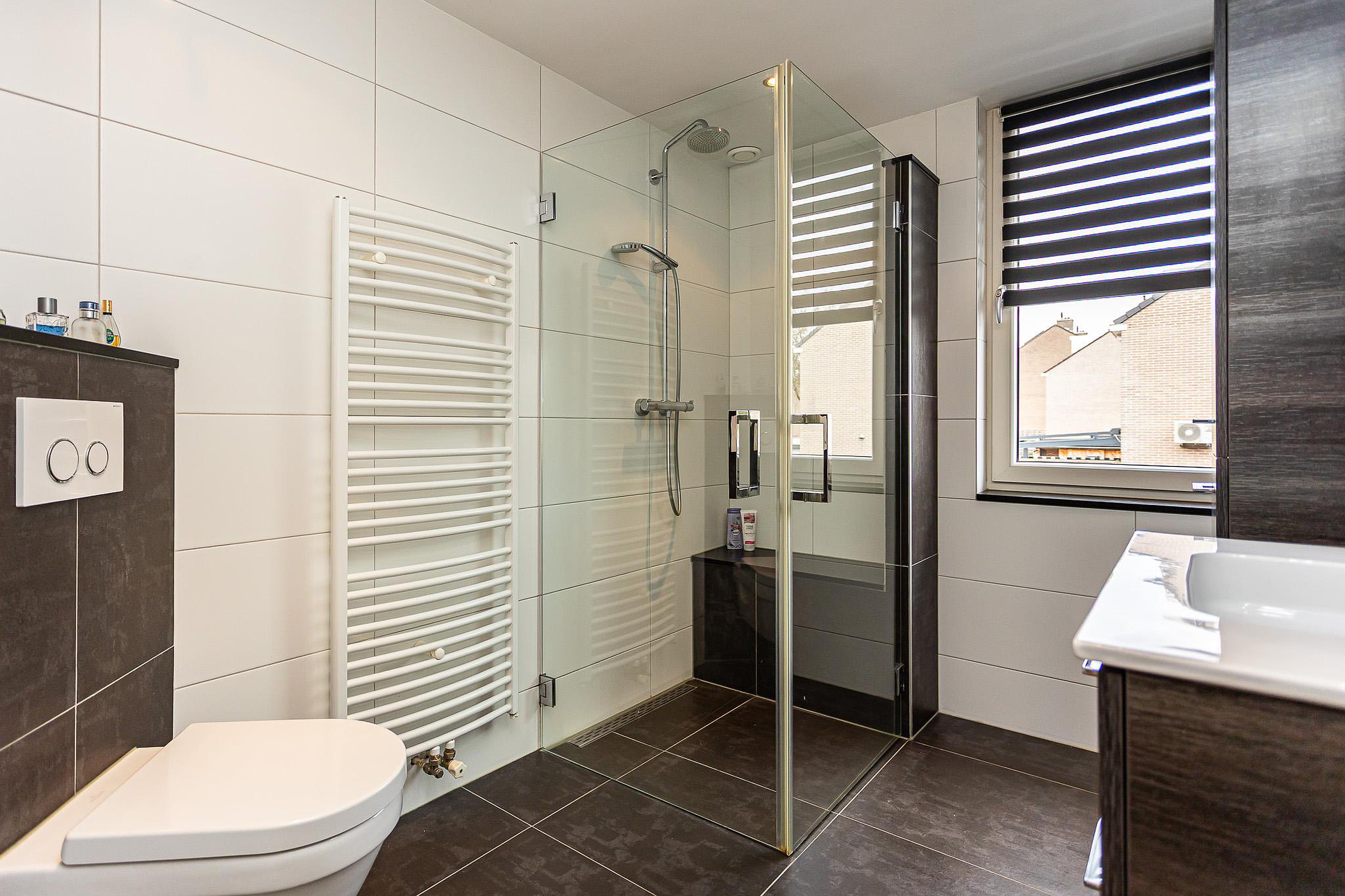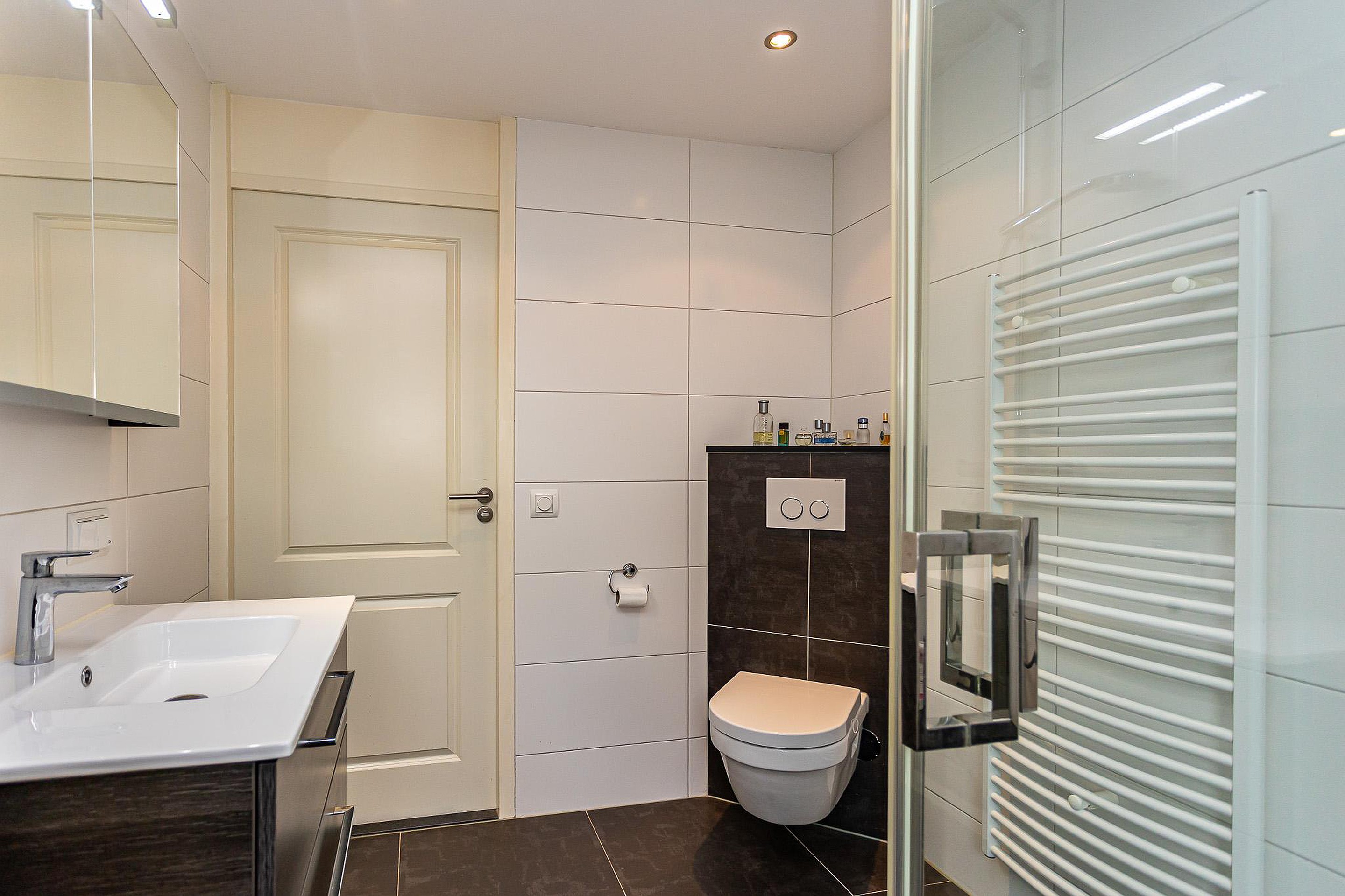 Overloop met bergkast, 2 royale slaapkamers (op eenvoudige wijze zijn weer drie slaapkamers te realiseren), luxe badkamer met inloopdouche, vaste wastafel in badkamer-meubel, 2e toilet en designradiator.