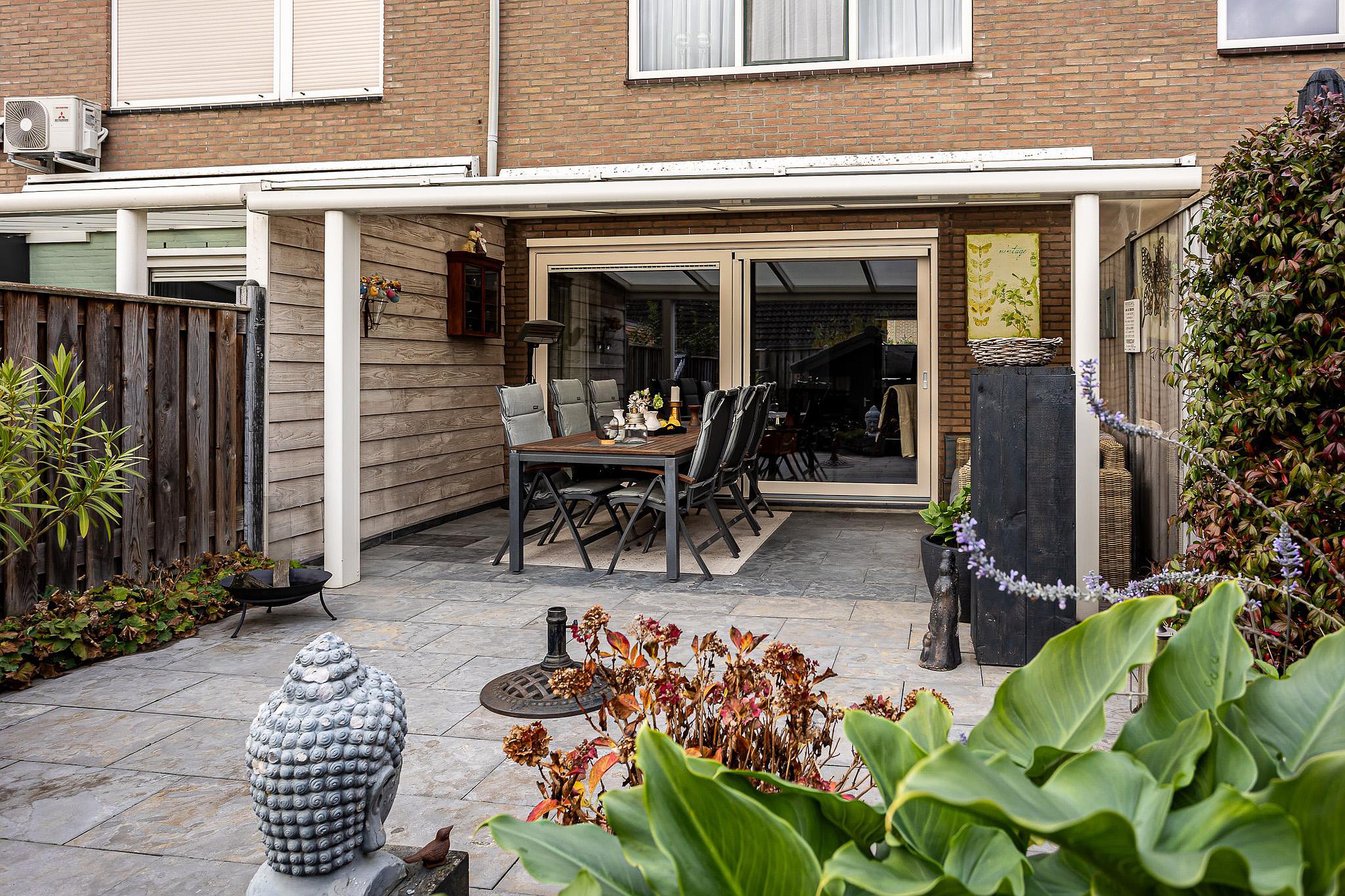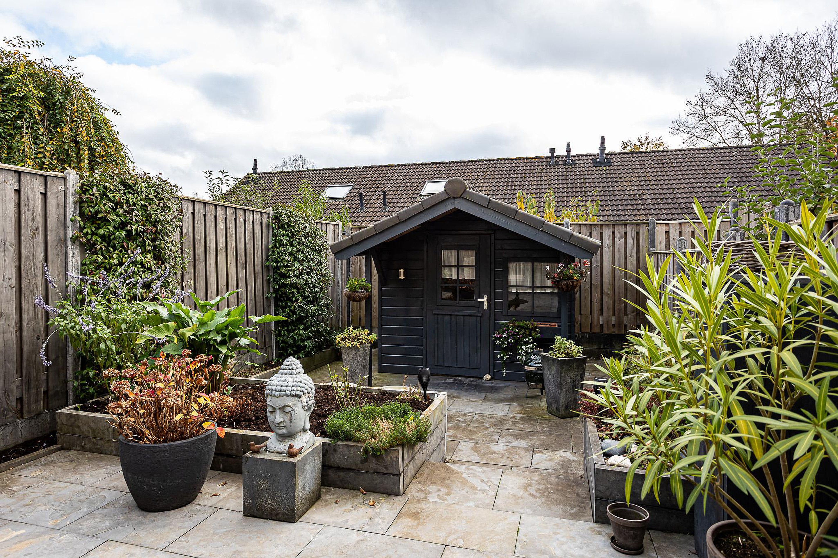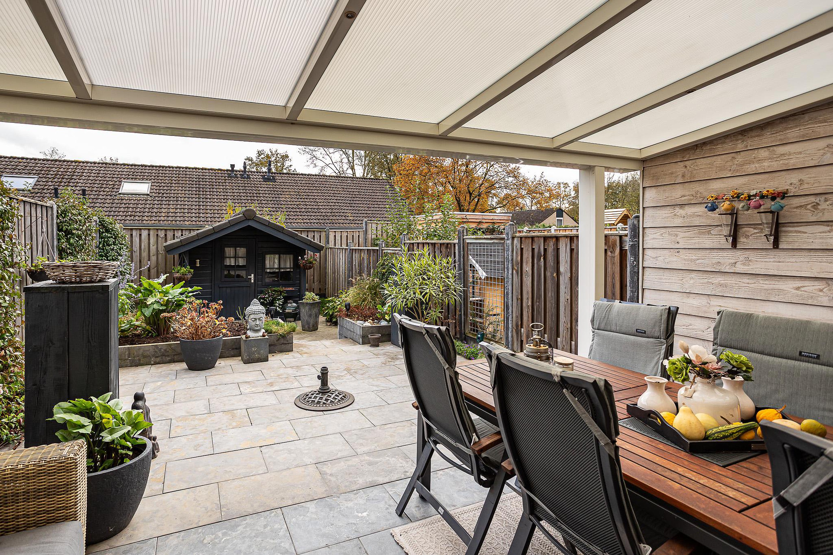 Fraai aangelegde zonnige achtertuin (zuiden) met aluminium overkapping en houten tuinberging.