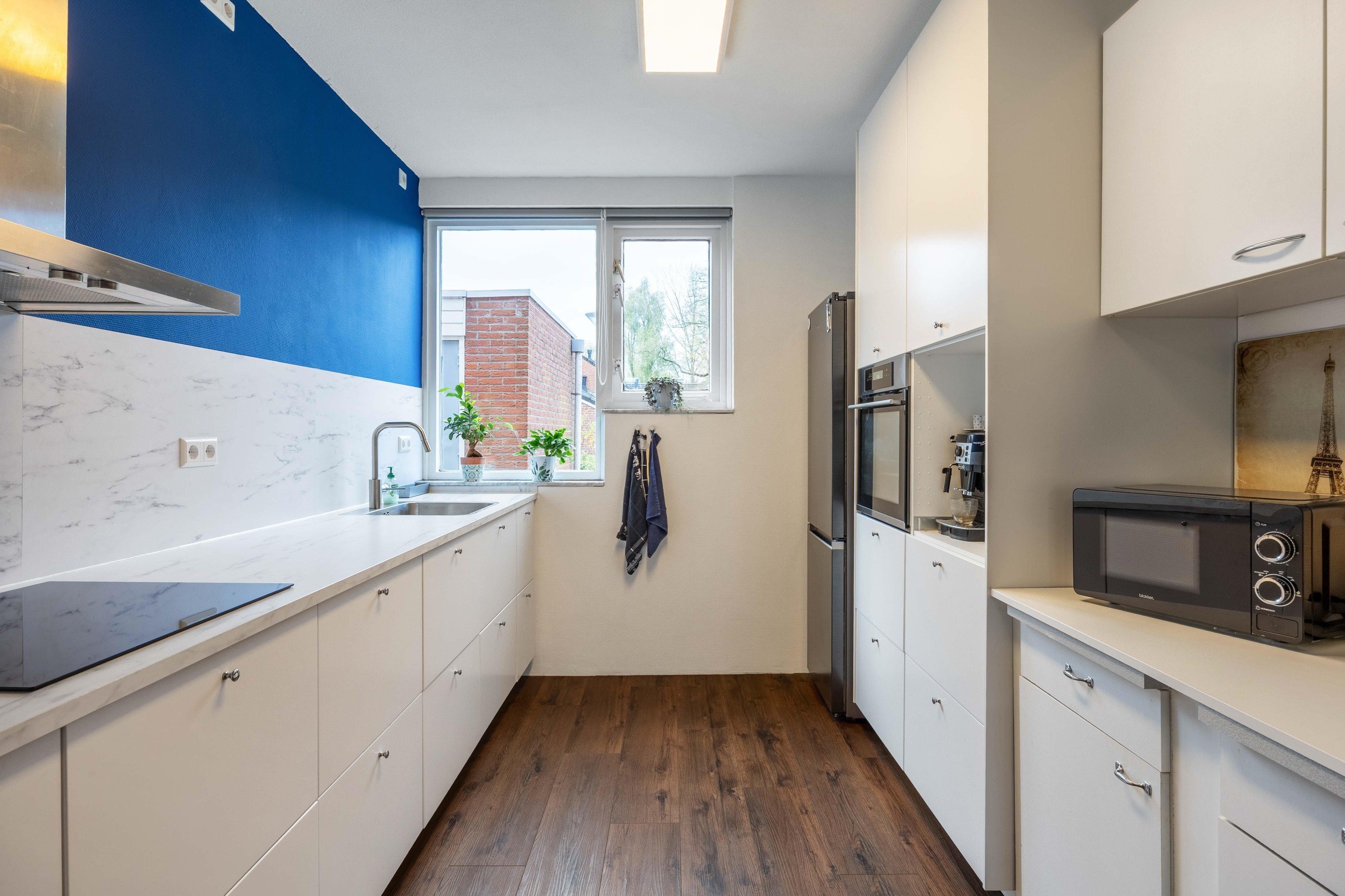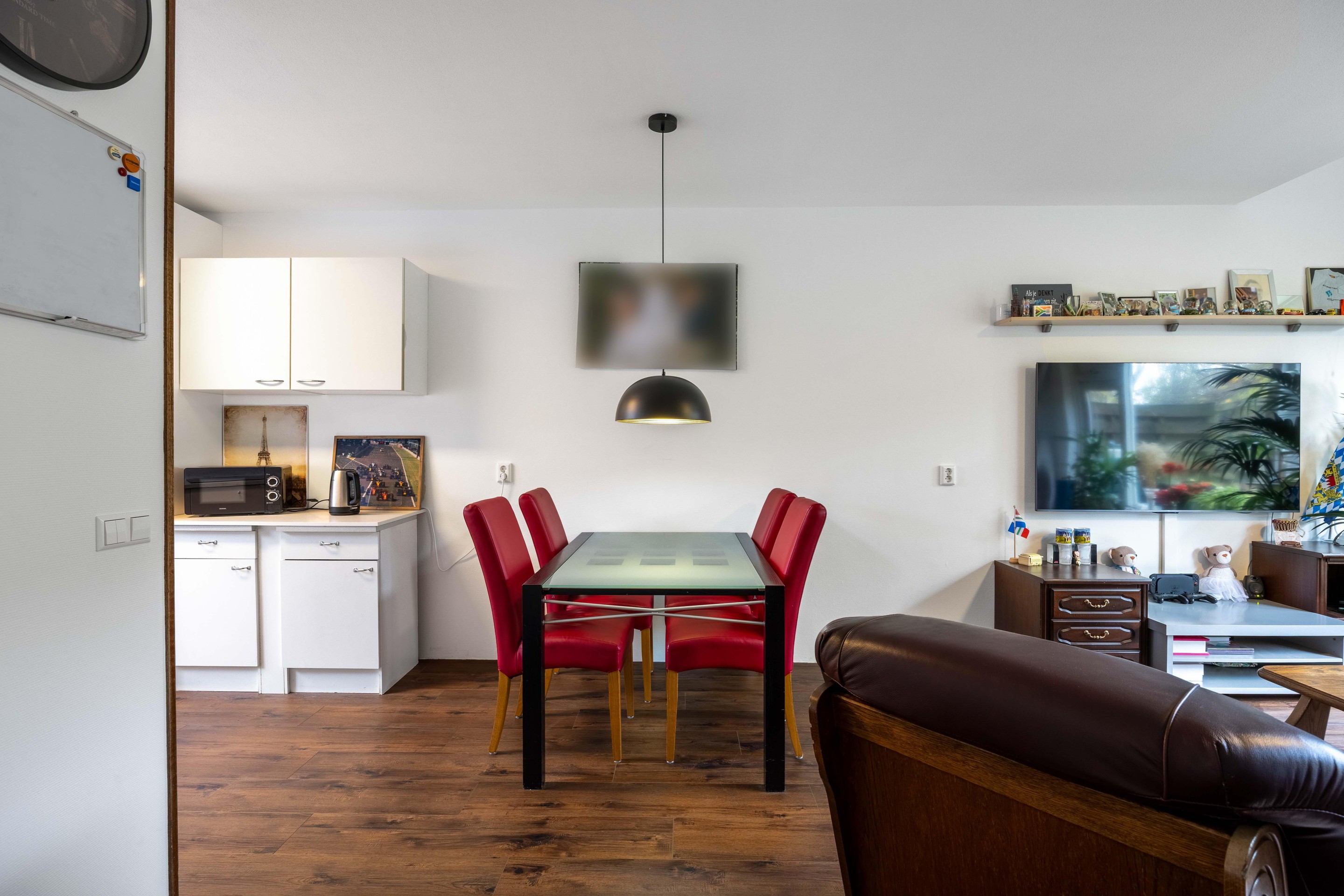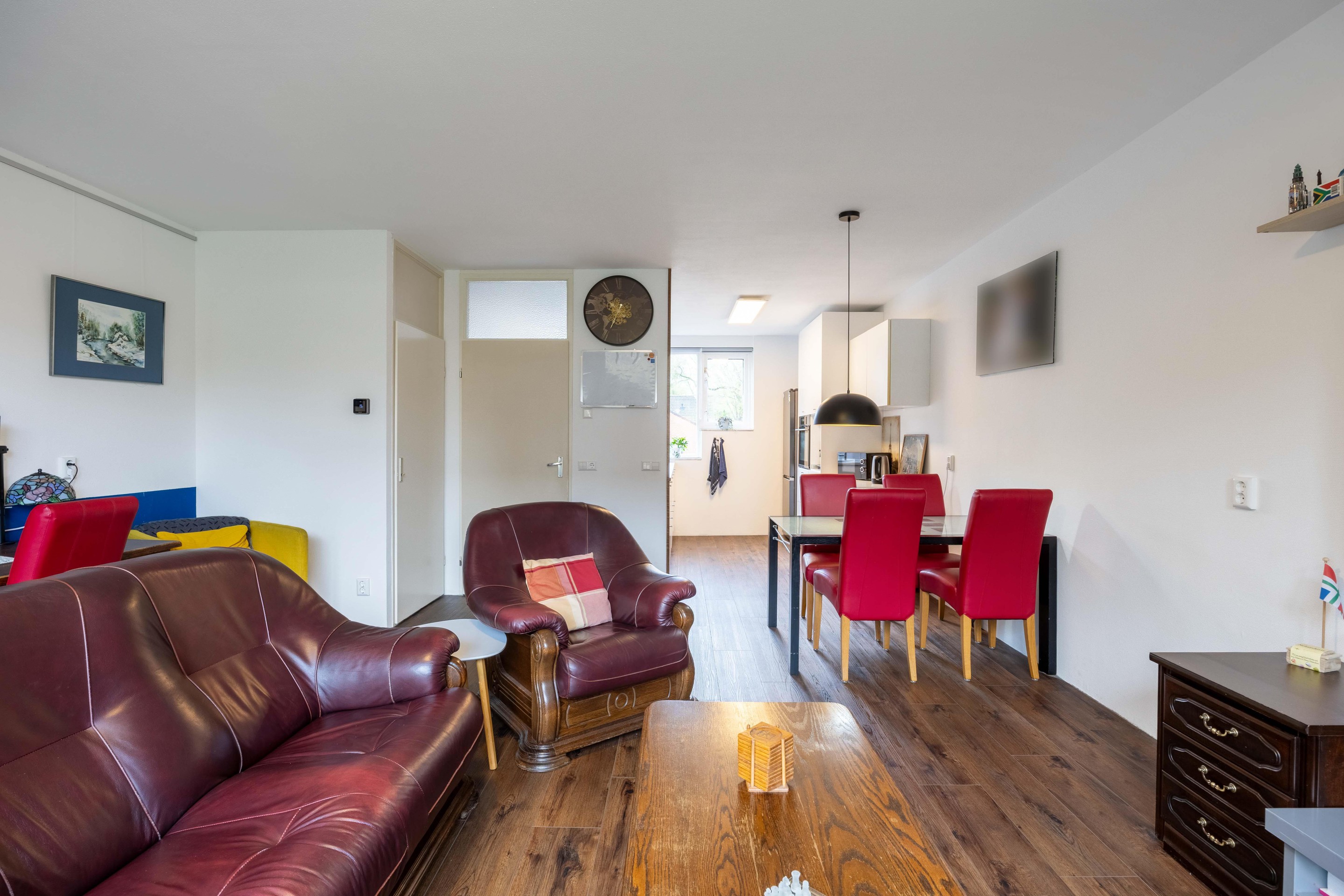 De woonkamer is licht en ruim, dankzij de grote raampartij en de tuindeur schijnt de zon 's morgens je woonkamer naar binnen. De woonkamer staat in verbinding met de keuken welke is uitgevoerd in parallelopstelling en voorzien van inbouwapparatuur.