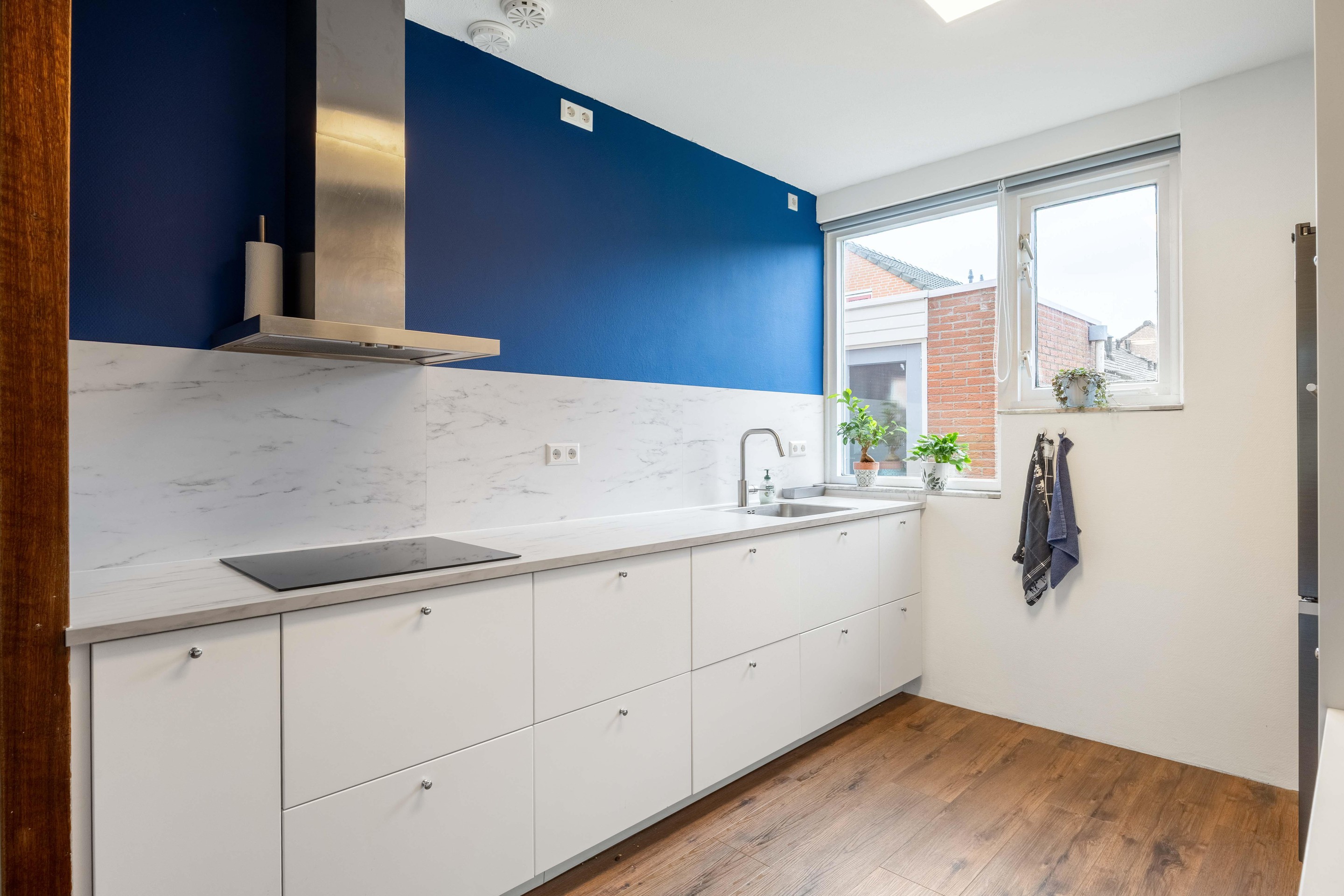 Begane grond Hal/ entree met meterkast, toilet met fonteintje; trapopgang naar de verdieping en toegang tot de woonkamer. Lichte woonkamer met open keuken uitgevoerd in parallelopstelling voorzien van inductiekookplaat, afzuigkap, spoelbak, keukenkraan met uittrekbare uitloop en inbouw oven. Zowel in de woonkamer, keuken als hal bevindt zich vloerverwarming. Tevens vanuit de woonkamer middels tuindeur toegang tot de achtertuin.