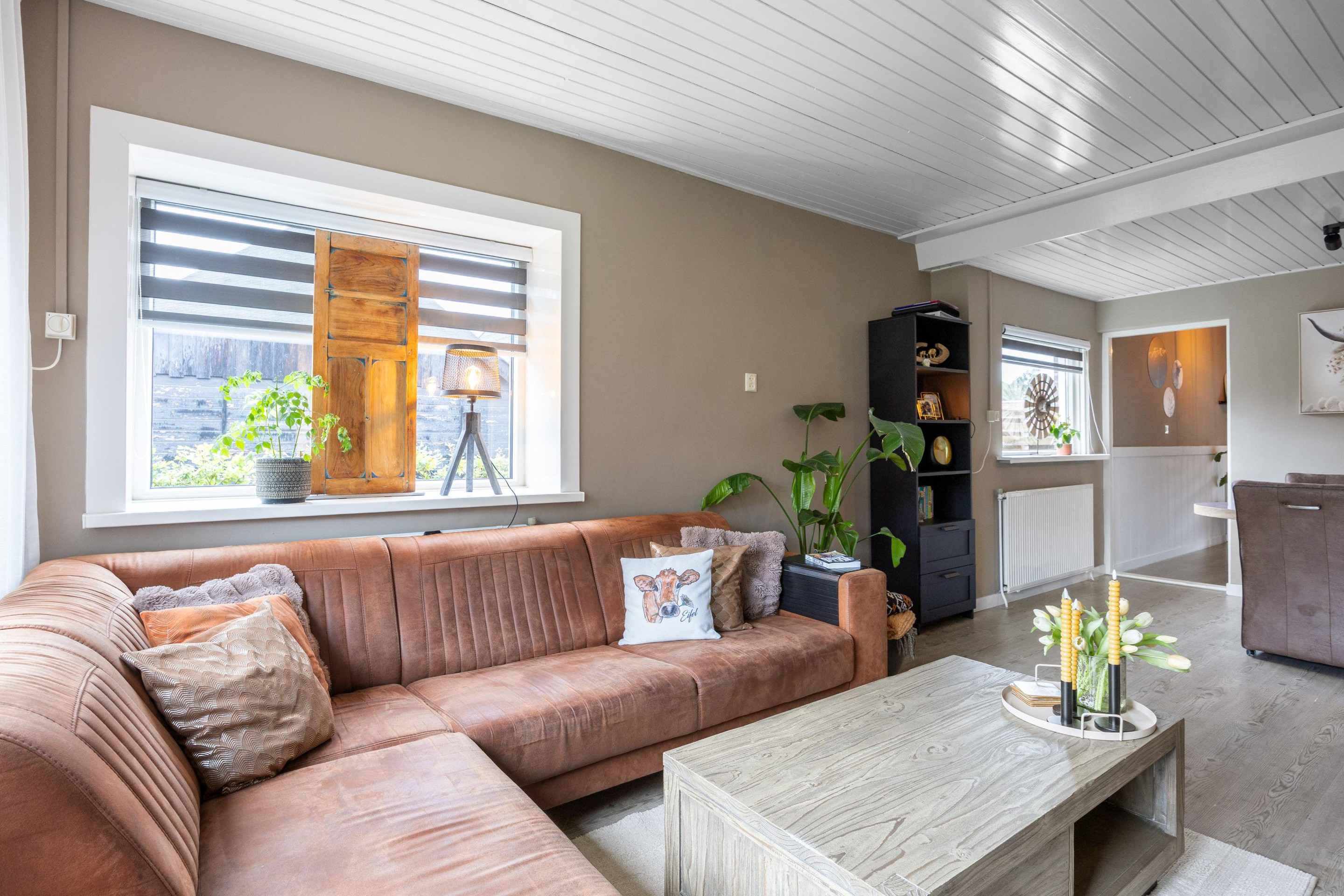 Bij binnenkomst treft u de entree met toilet, meterkast en toegang naar de eerste verdieping. De hal leidt direct naar de modern afgewerkte keuken, die in open verbinding staat met de ruime en lichte woonkamer. Dankzij elektrische screens in de woonkamer is het altijd aangenaam, ongeacht het seizoen. De woonkamer biedt toegang tot een tussenhal, vanwaar u zowel de begane grond slaapkamer als de grote tuin en overkapping bereikt.