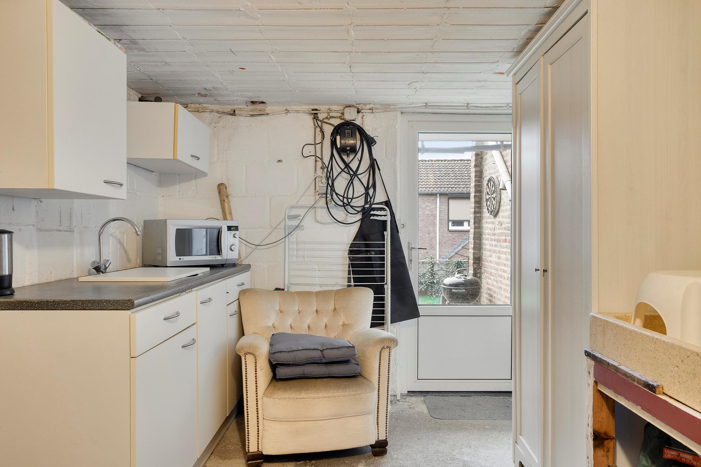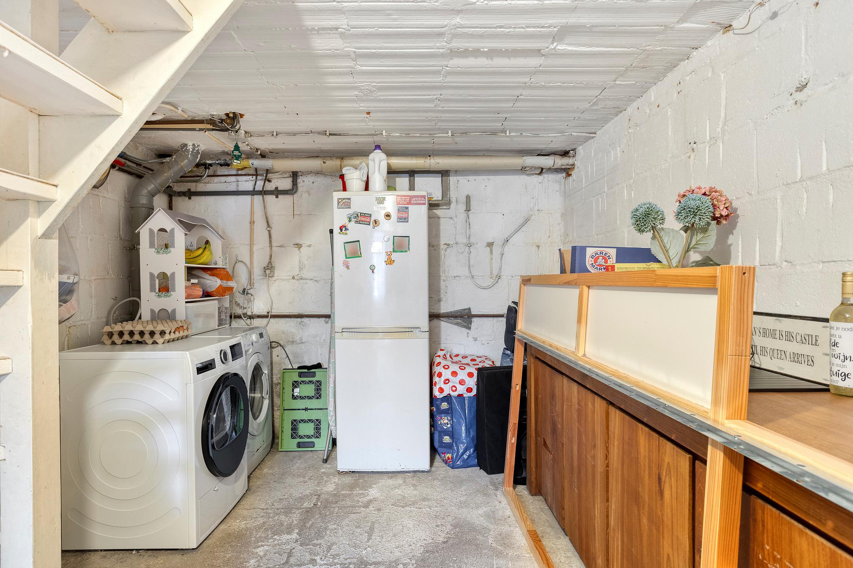 Vanuit de hal heeft men toegang tot de kelder, deze is opgedeeld in 3 ruimtes. In ruimte I (ca.17m2) bevinden zich de witgoedaansluitingen, een keukenblok en een authentiek lavet van ocriet. Vanuit deze ruimte heeft men toegang tot de achtergelegen tuin. Ruimte II (ca.13m2) momenteel in gebruik als hobbyruimte en ruimte III (ca.8m2) is in gebruik als berging. De kelder heeft een stahoogte van 2.05 meter.