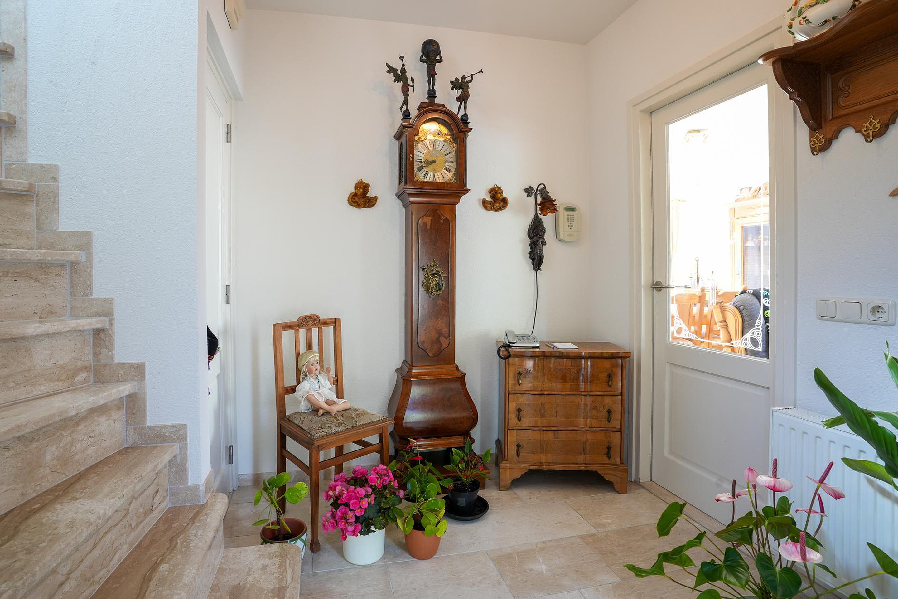 Vanaf de oprit loop je richting de fraaie entree van deze vrijstaande woning. In de hal zie je de met marmer afgewerkte trap, de meterkast en een prachtige Jura natuursteen vloer. Naast de trap is de toiletruimte met dezelfde vloerafwerking, grote wandtegels en een wandcloset.