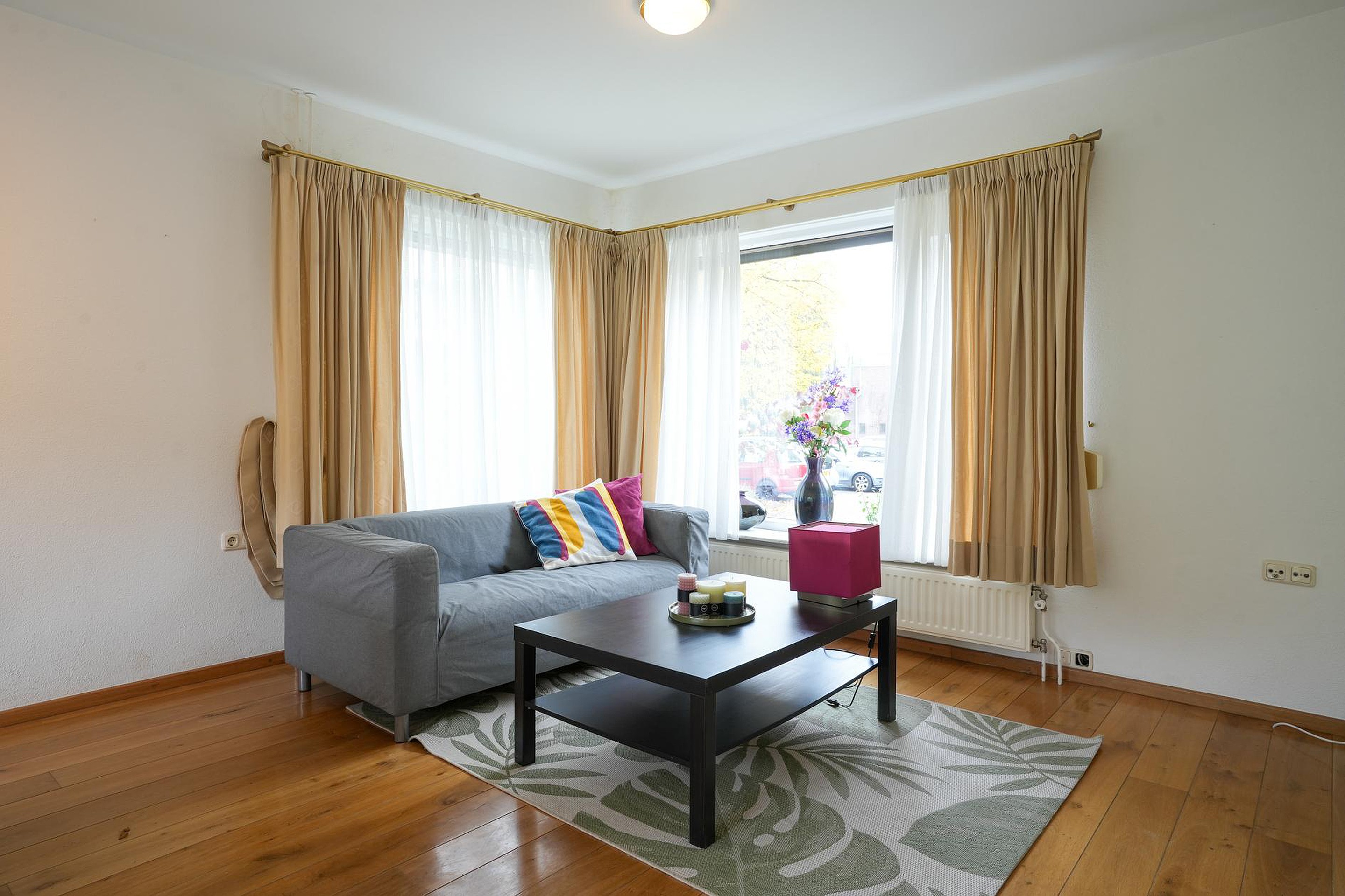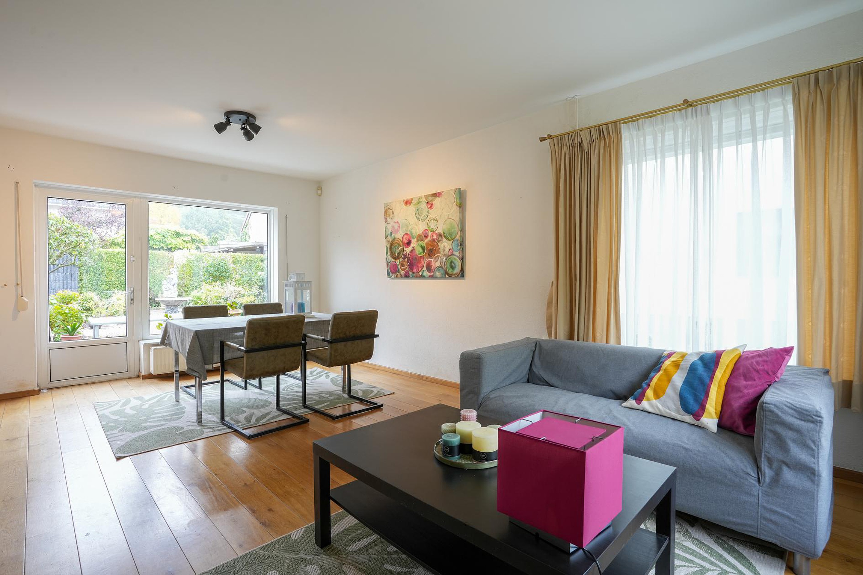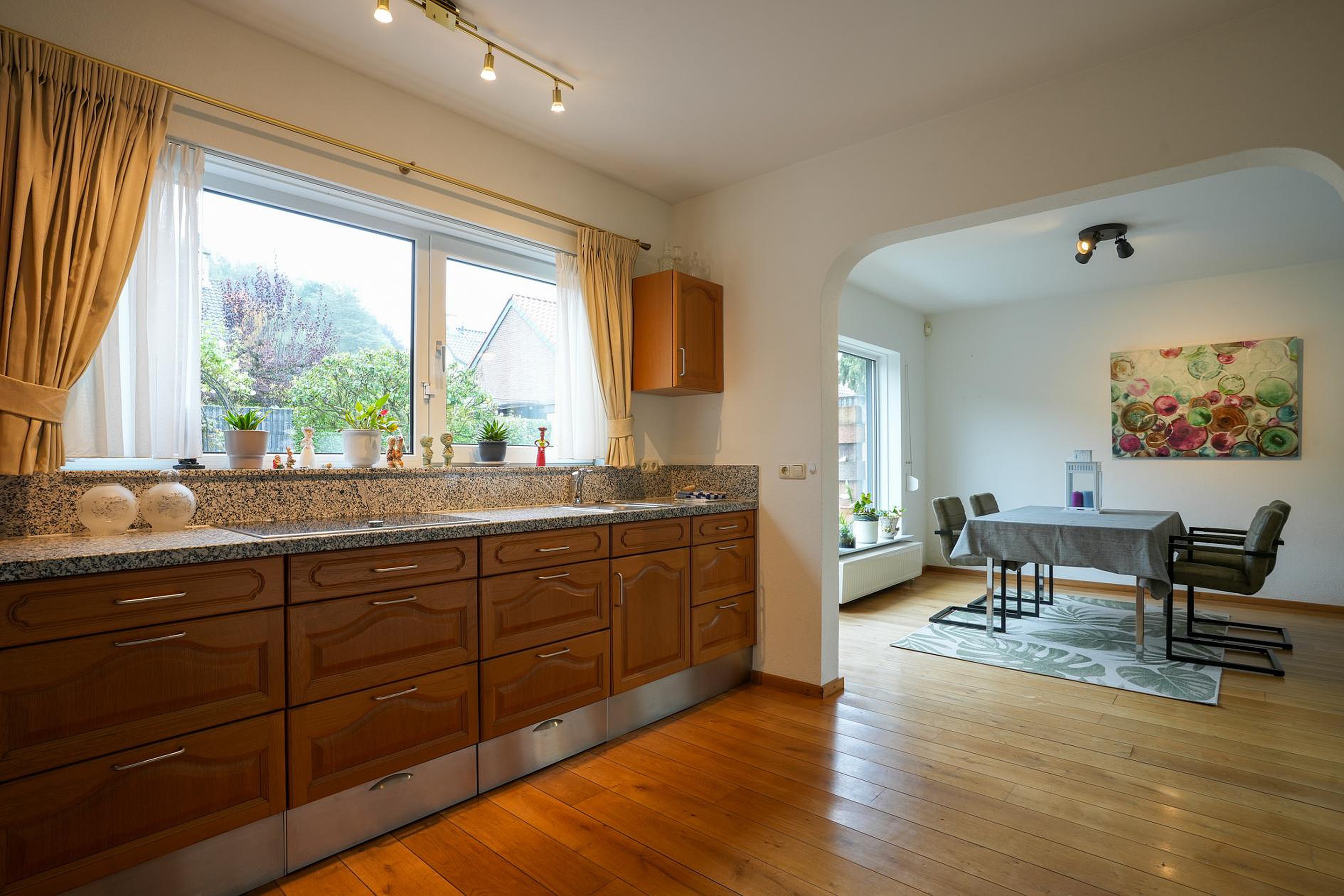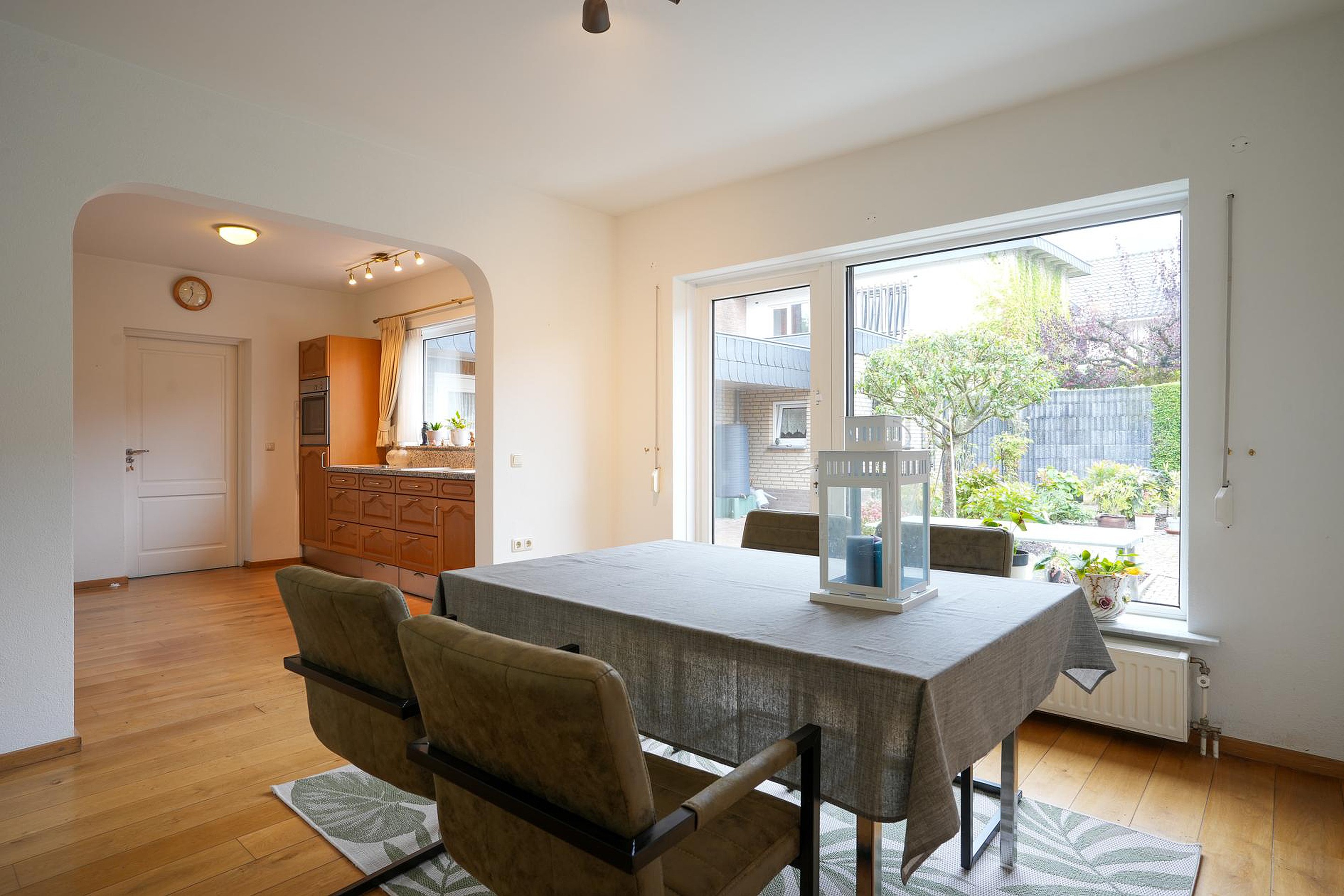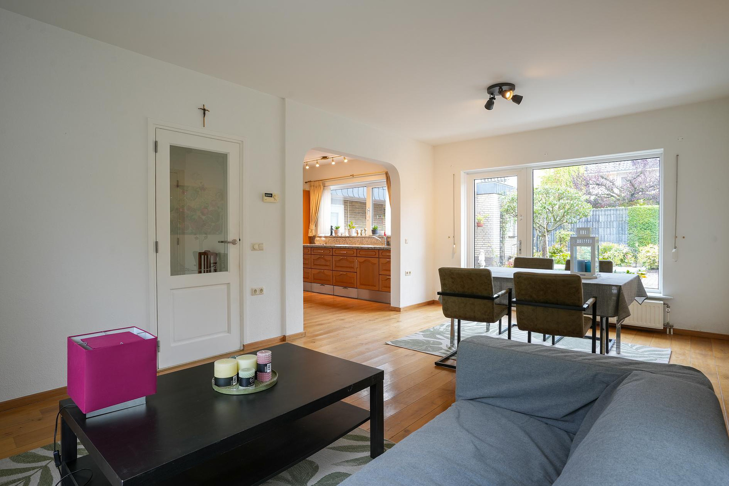 De lichte woon-/eetkamer staat in open verbinding met de keuken, die samen ca. 34 m2 groot zijn. Dit zitgedeelte is aan de voorzijde, met uitzicht naar het Prins Willem Alexanderplein waardoor er altijd wat te zien is. Vanaf de eettafel, aan de zonnige zuidoostkant, kijk je naar de prachtige achtertuin.