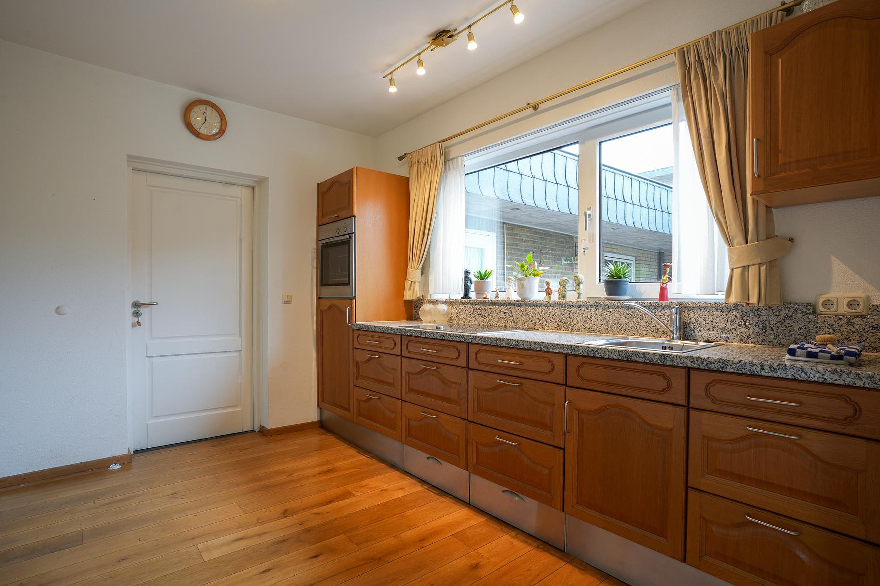 In de tuin keuken staat een 3.50 meter lange wandopstelling met een granieten aanrechtblad en achterwand. Deze degelijke keuken is voorzien van grote lades, twee plintlades, kasten, een keramische kookplaat, koelkast en een oven. Aan de andere zijde, naast de fauteuil, is de trap naar het souterrain.