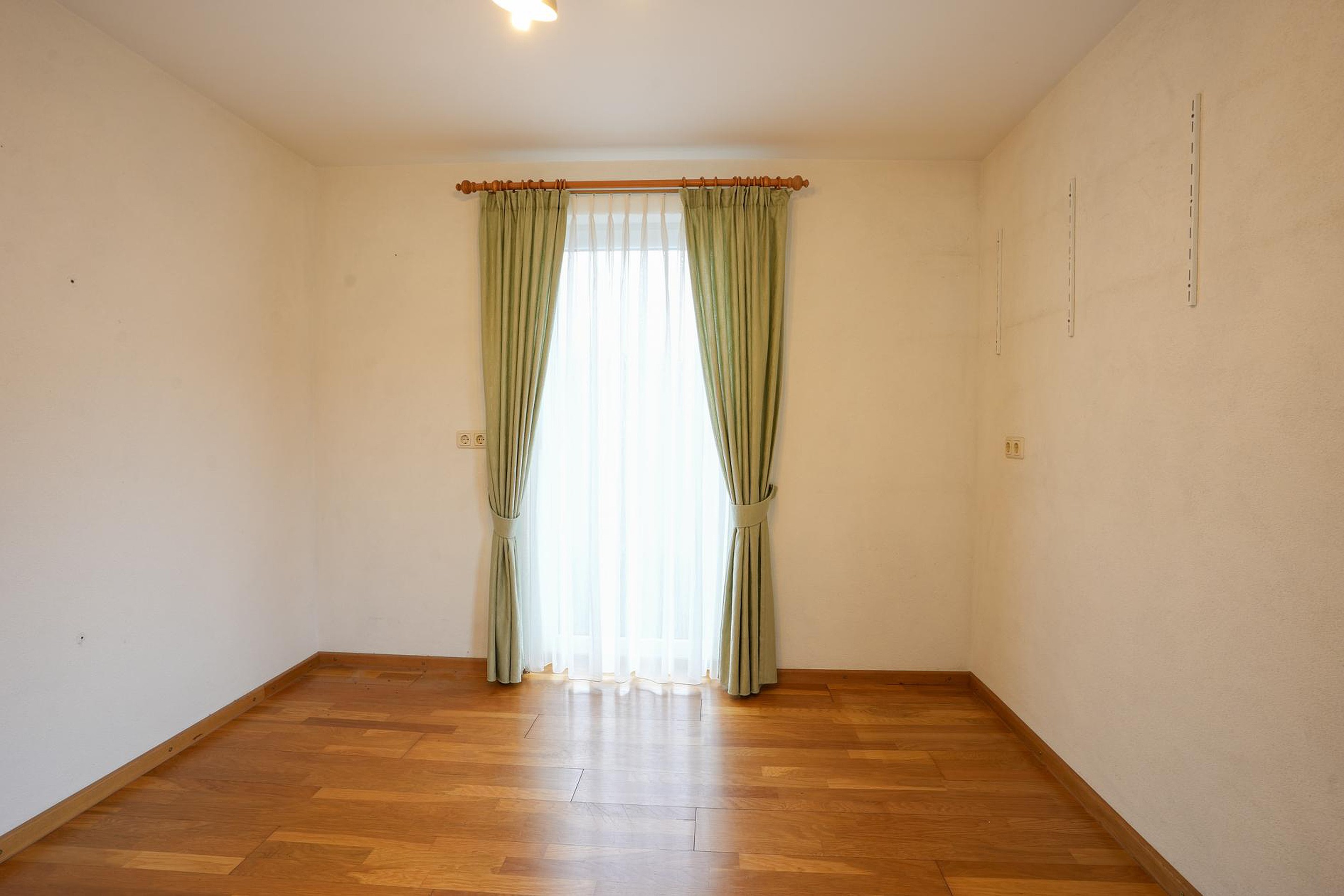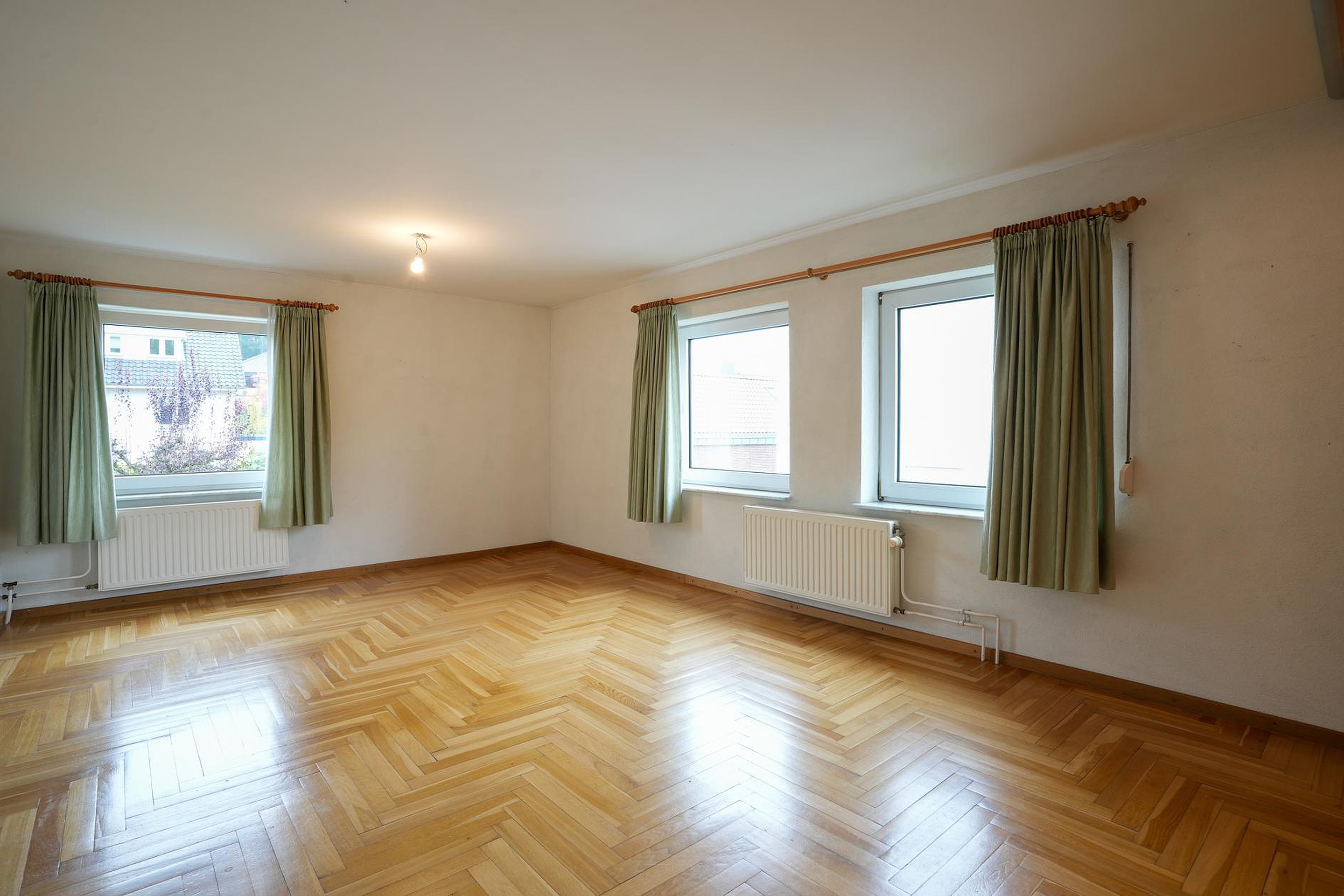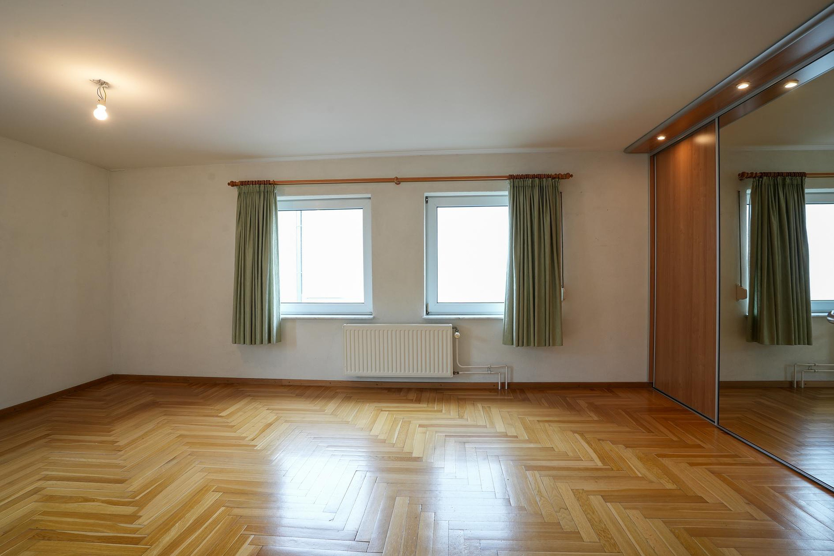 Vanaf de overloop zijn twee (mogelijk drie) slaapkamers en de badkamer te bereiken. Aan de rechterzijde is de hoofdslaapkamer van ruim 23 m2 en de tweede slaapkamer is ca. 9.4 m2 groot. Deze kamer heeft een deur naar het platte dak boven de garage. In beide slaapkamers ligt een gelijmde eiken parketvloer, met een visgraatmotief in de hoofdslaapkamer.