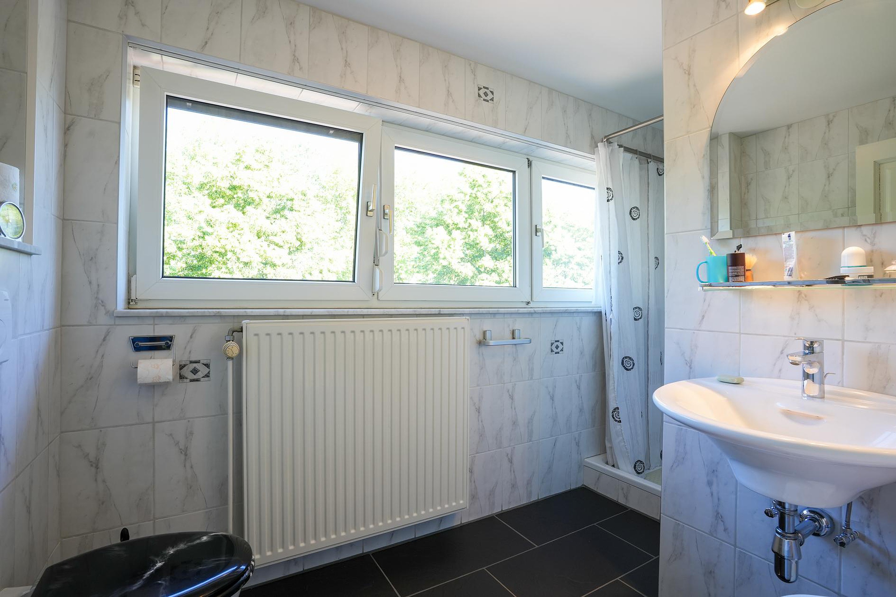 De badkamer (ca. 4.5 m2), met maar liefst drie ramen in de voorgevel, is ingedeeld met een douche, wandcloset en een wastafel. Het marmermotief van de wandtegels past goed bij de donkere vloertegels.