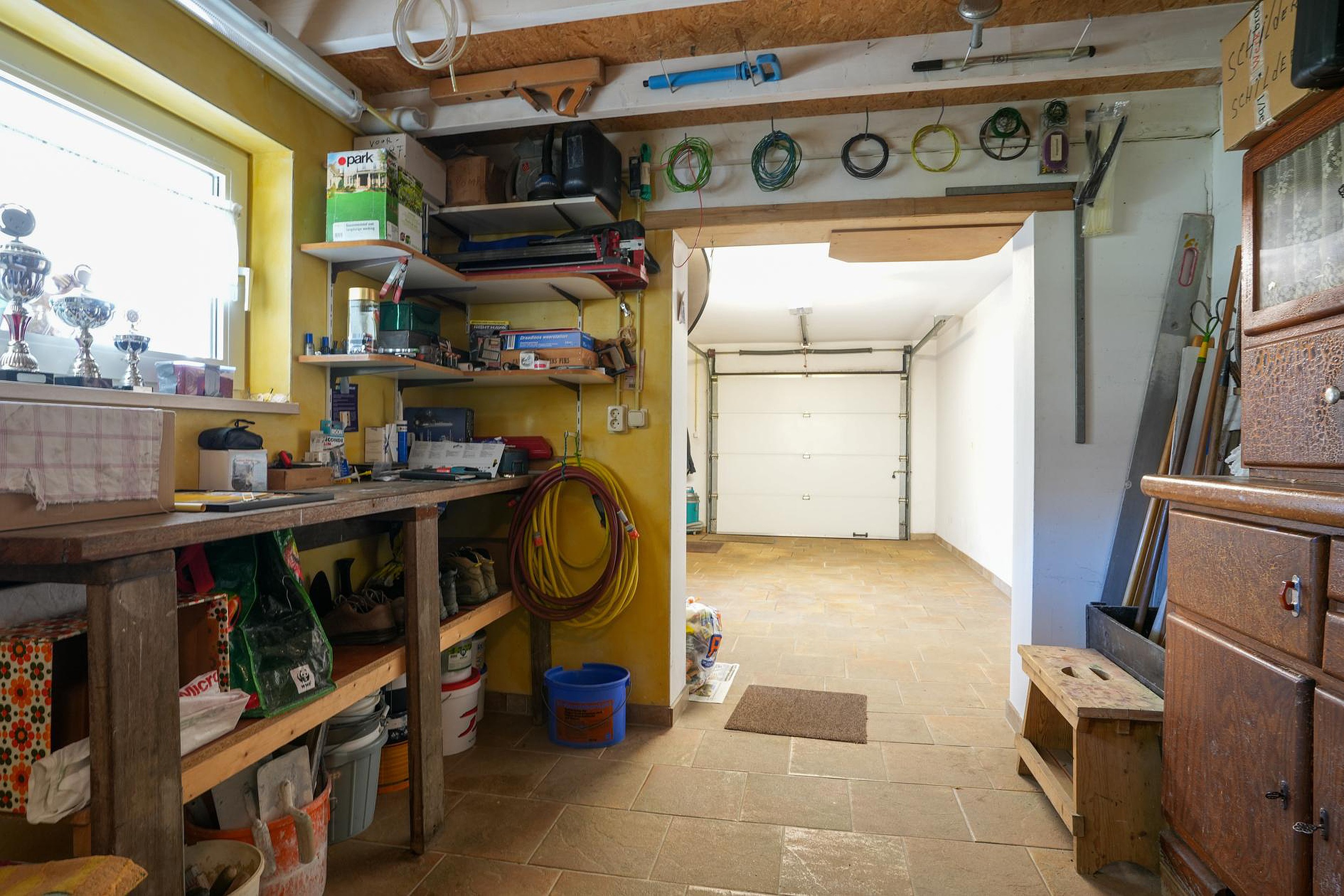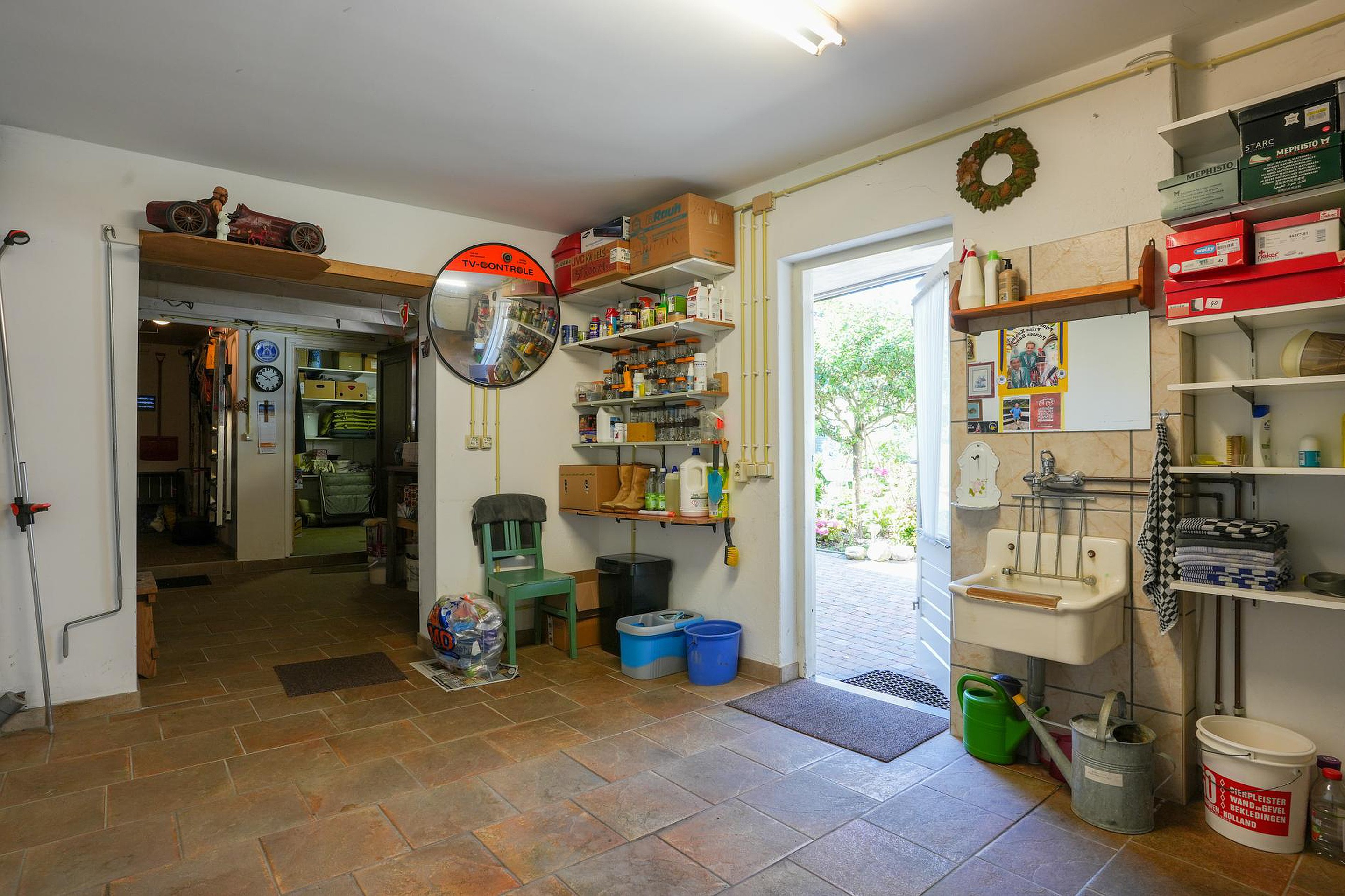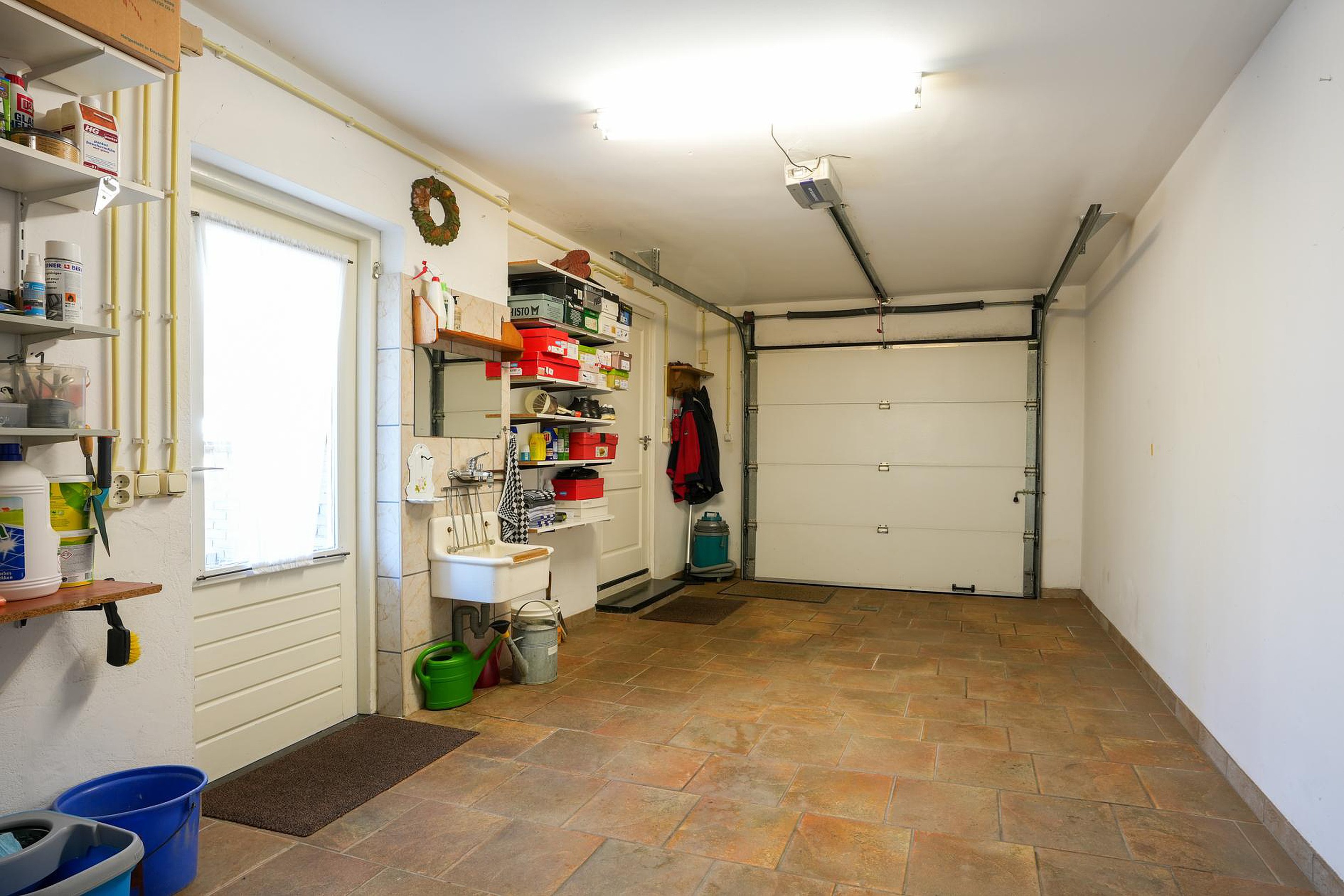 Vanuit de keuken is de ruime garage (ca. 20.6 m2) te bereiken. Deze ruimte is voorzien van een uitstortgootsteen en een elektrisch bedienbare sectionaaldeur. Er is een inpandige verbinding met twee aaneengesloten bergingen van totaal ca. 24.4 m2, waarvan een in gebruik is als hobbyruimte. In alle ruimtes ligt een mooie tegelvloer en de ramen maken het mogelijk om het woongedeelte te vergroten. Denk hierbij aan het verplaatsen van de keuken of het realiseren van een werk-/studeerkamer.