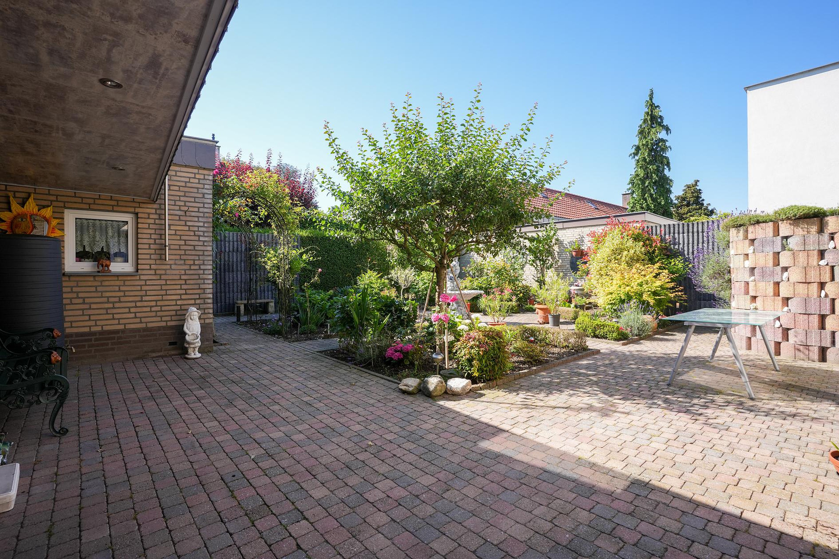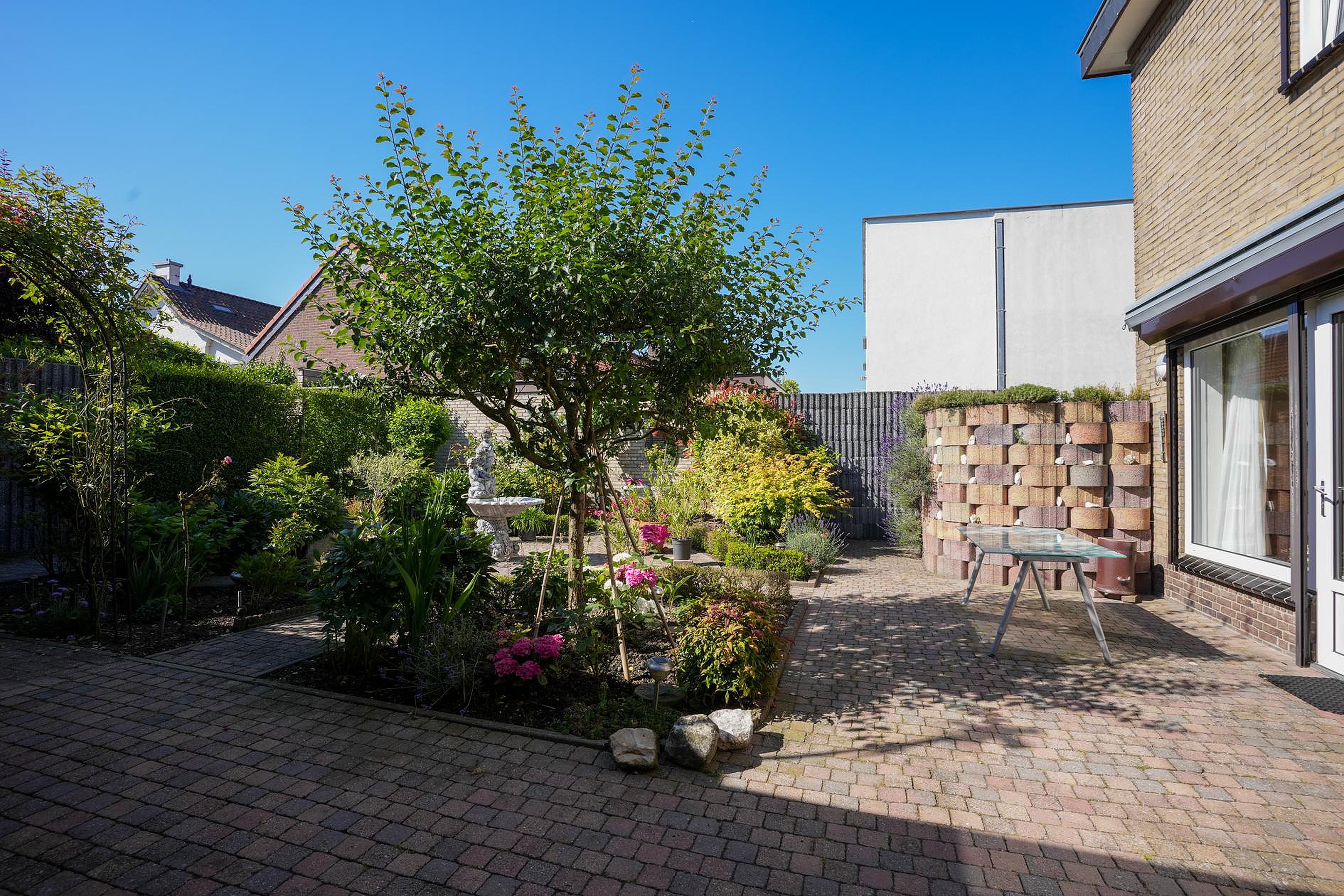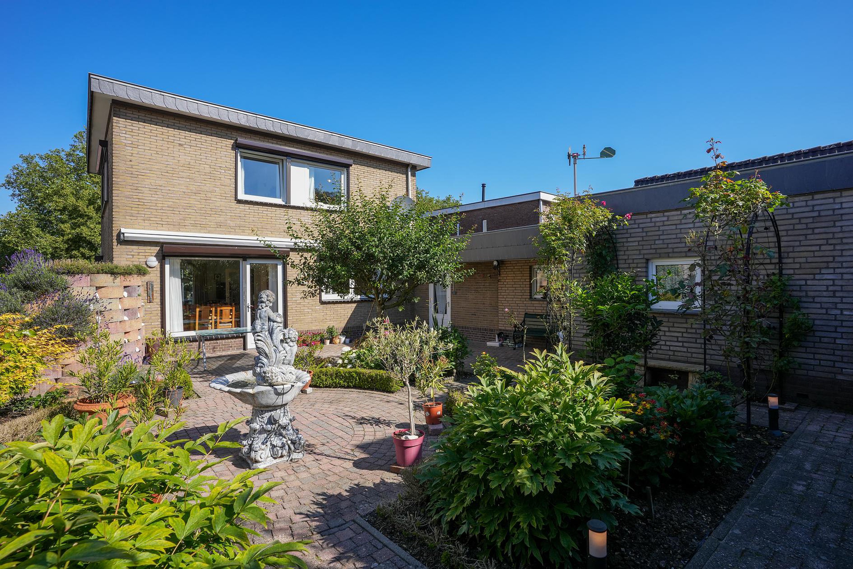 Deze goed onderhouden, vrijstaande woning wordt aan drie kanten omringd door een fraai aangelegde, goed onderhouden tuin. In de voortuin zie je kleurrijke bloemen en op de oprit is parkeergelegenheid voor twee auto’s. De achtertuin, gesitueerd op het zuidoosten, biedt steeds nieuwe indrukken en verschillende plekken om in de zon te zitten.