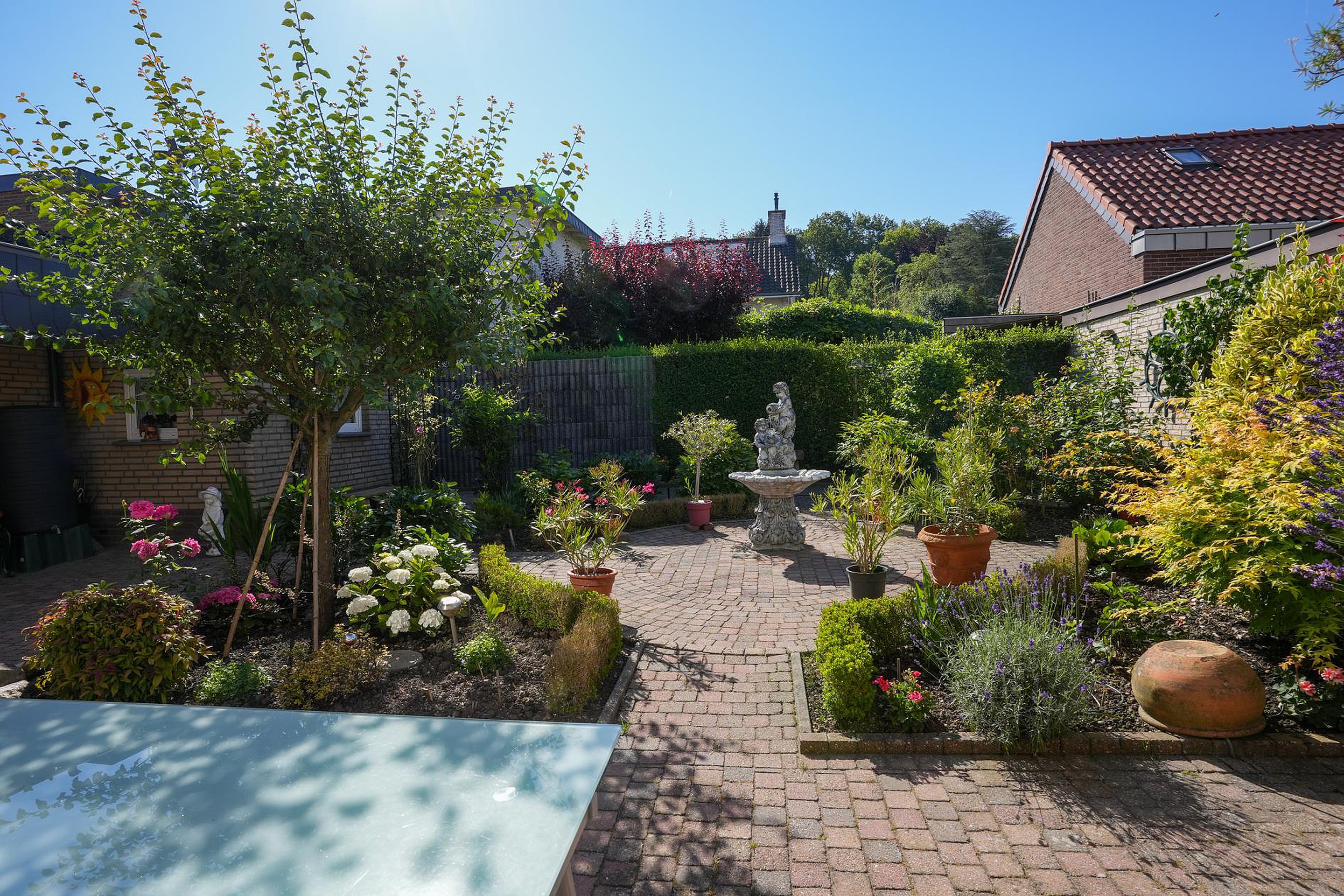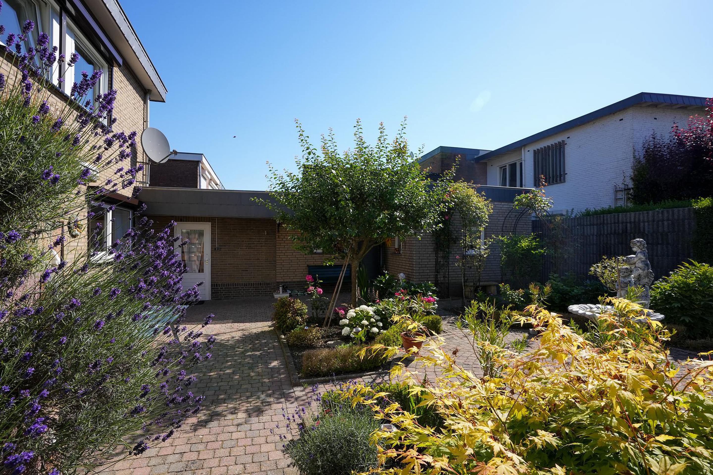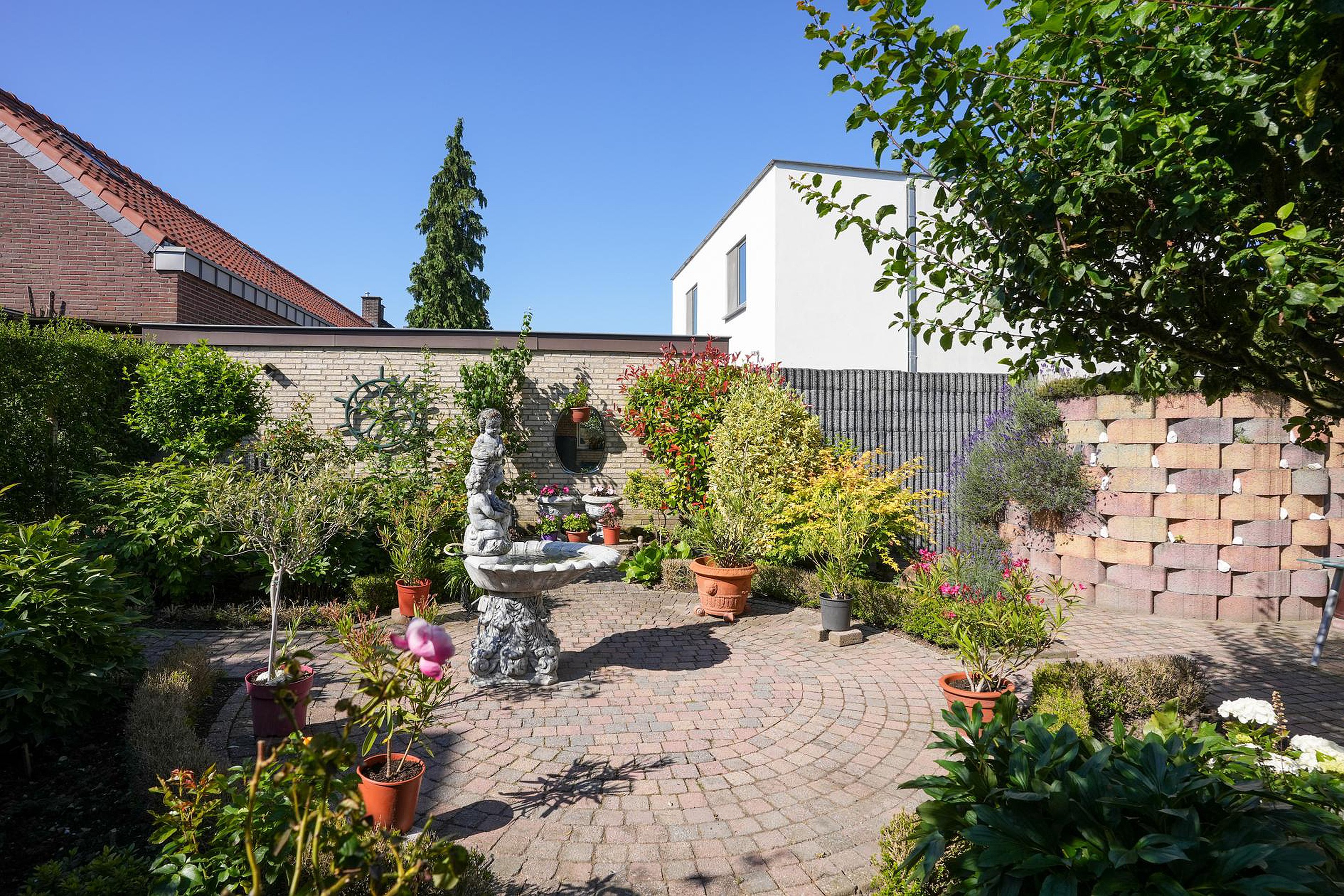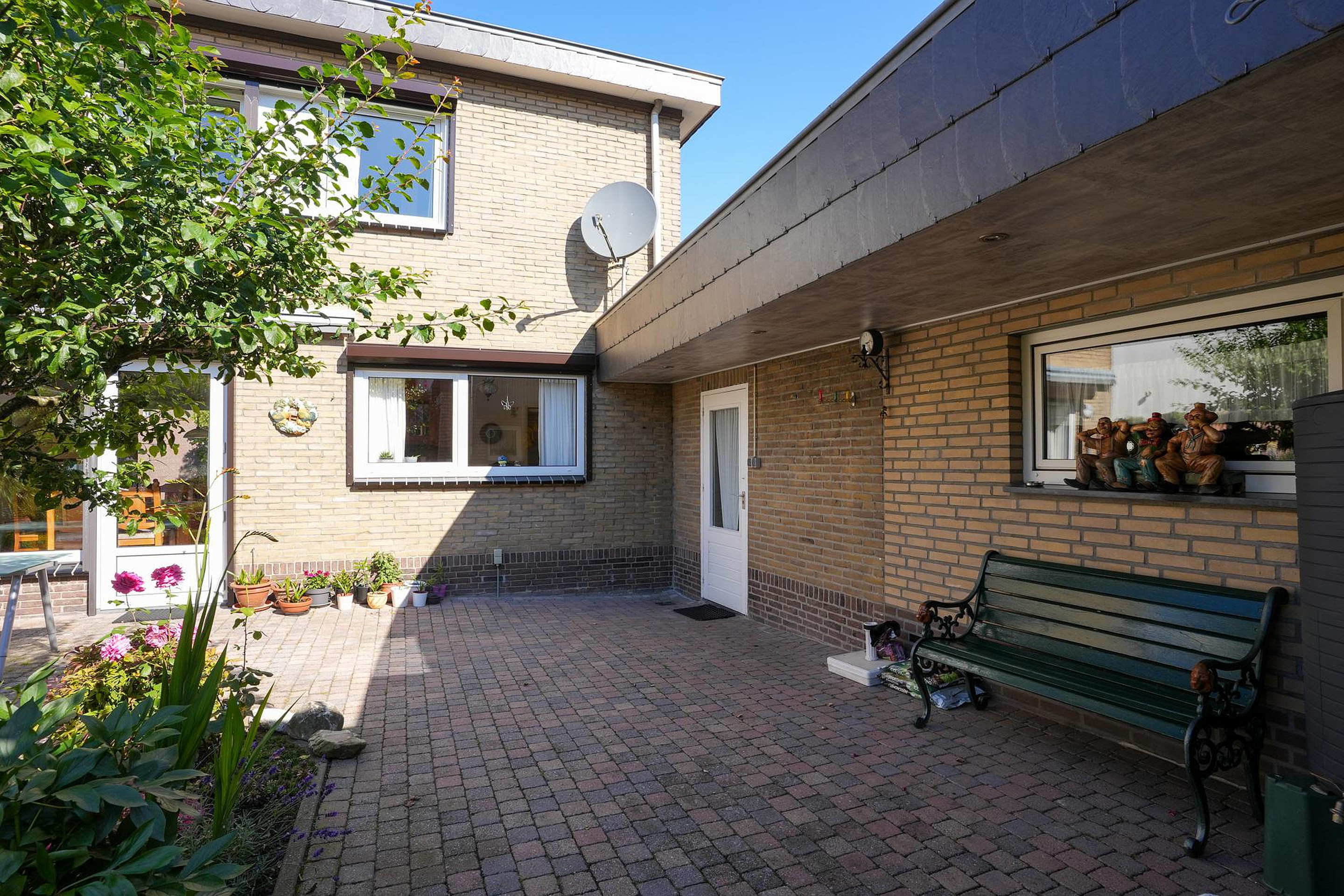 Deze goed onderhouden, vrijstaande woning wordt aan drie kanten omringd door een fraai aangelegde, goed onderhouden tuin. In de voortuin zie je kleurrijke bloemen en op de oprit is parkeergelegenheid voor twee auto’s. De achtertuin, gesitueerd op het zuidoosten, biedt steeds nieuwe indrukken en verschillende plekken om in de zon te zitten.