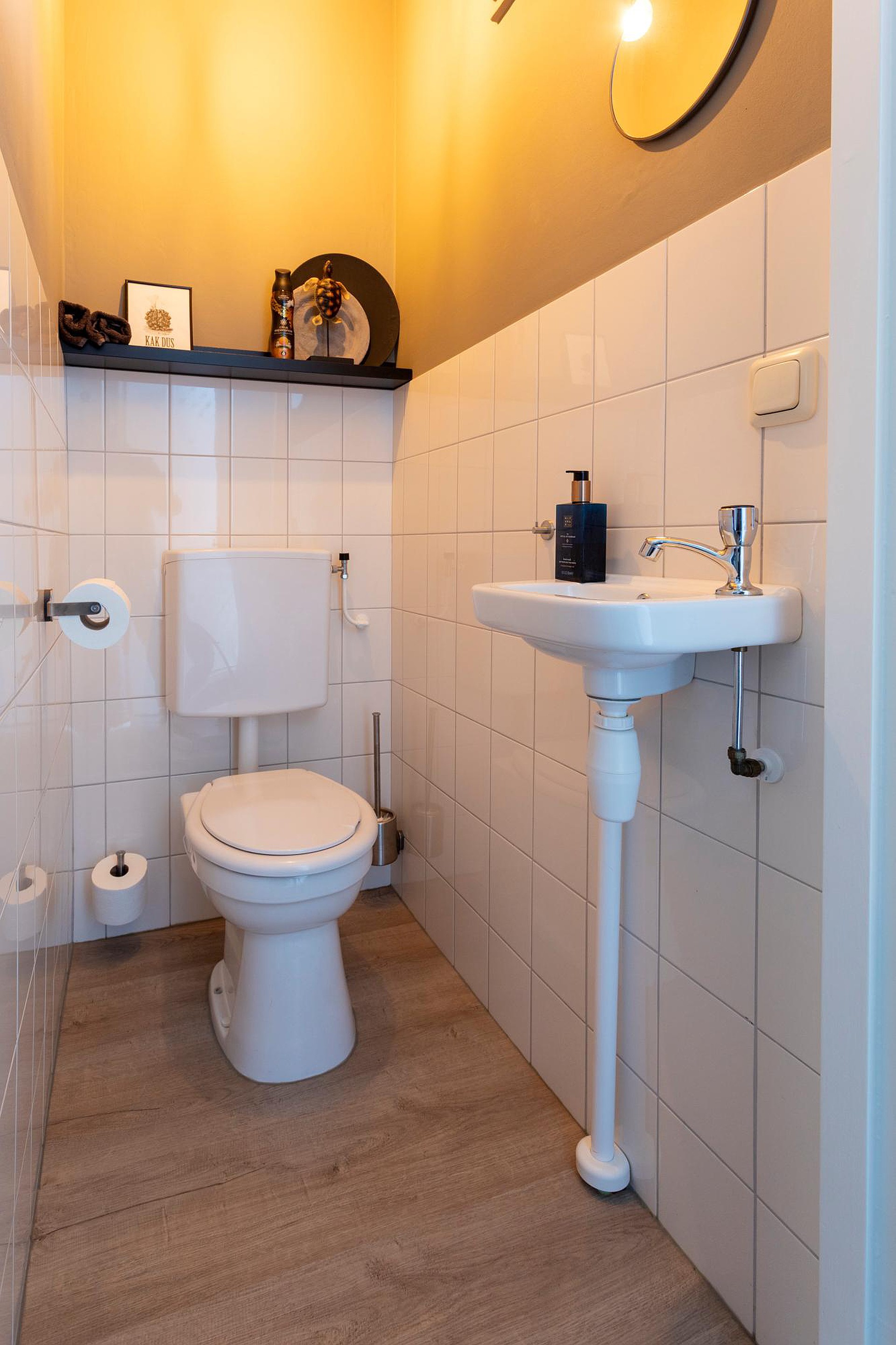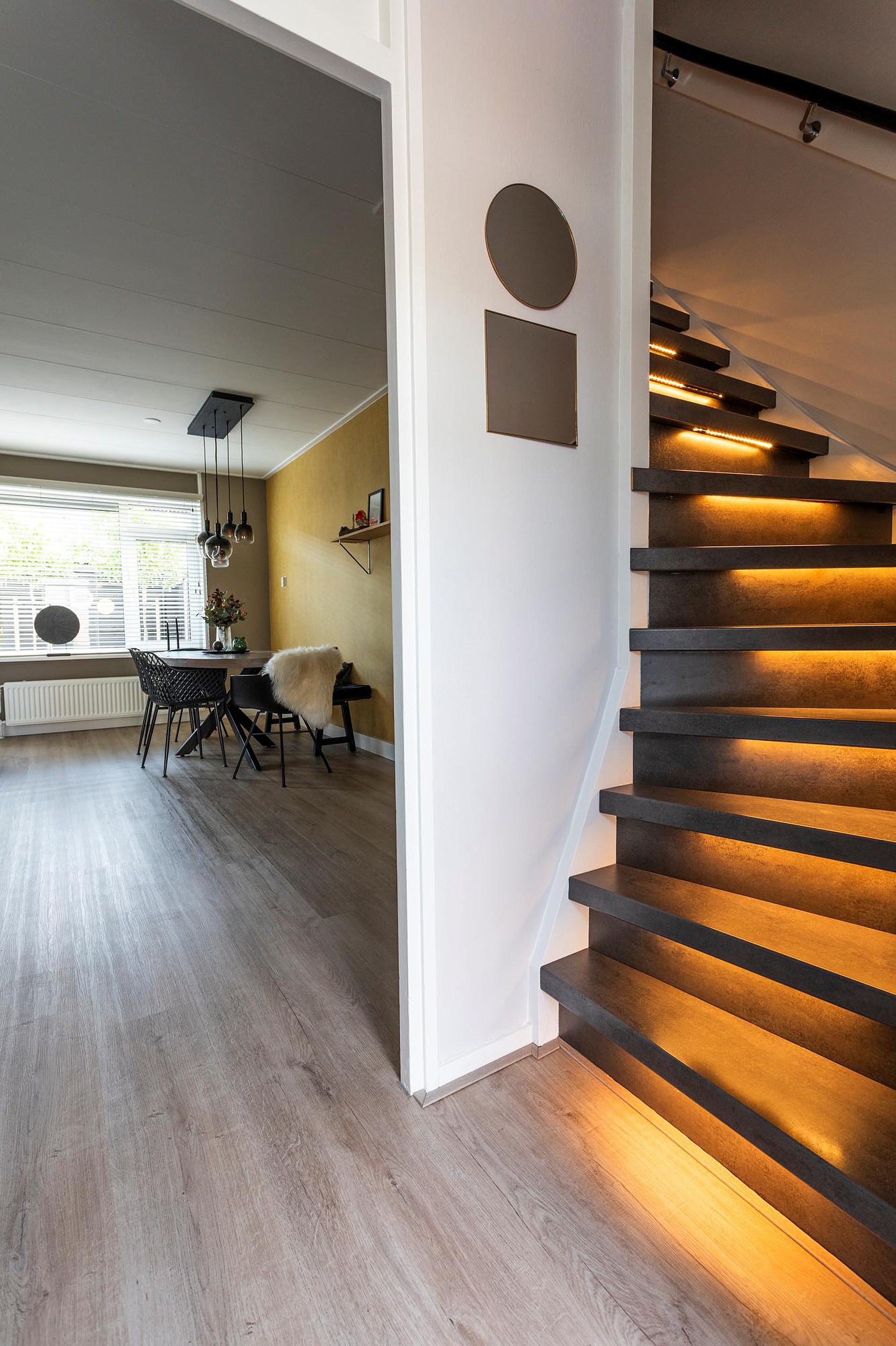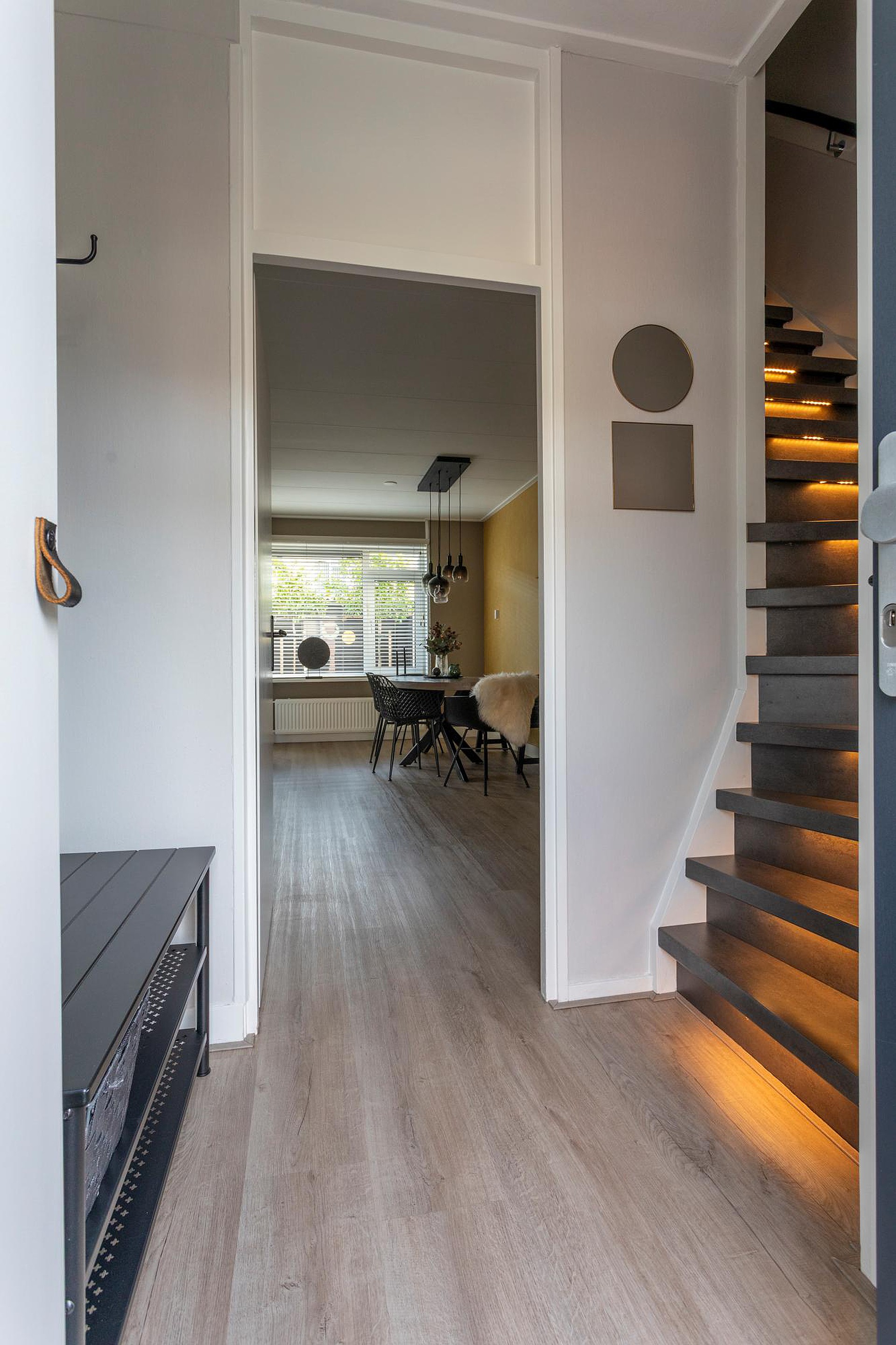 Entree, hal met meterkast, modern toilet met fontein en een fraai afgewerkte trapopgang met nieuwe trapbekleding en geïntegreerde verlichting.