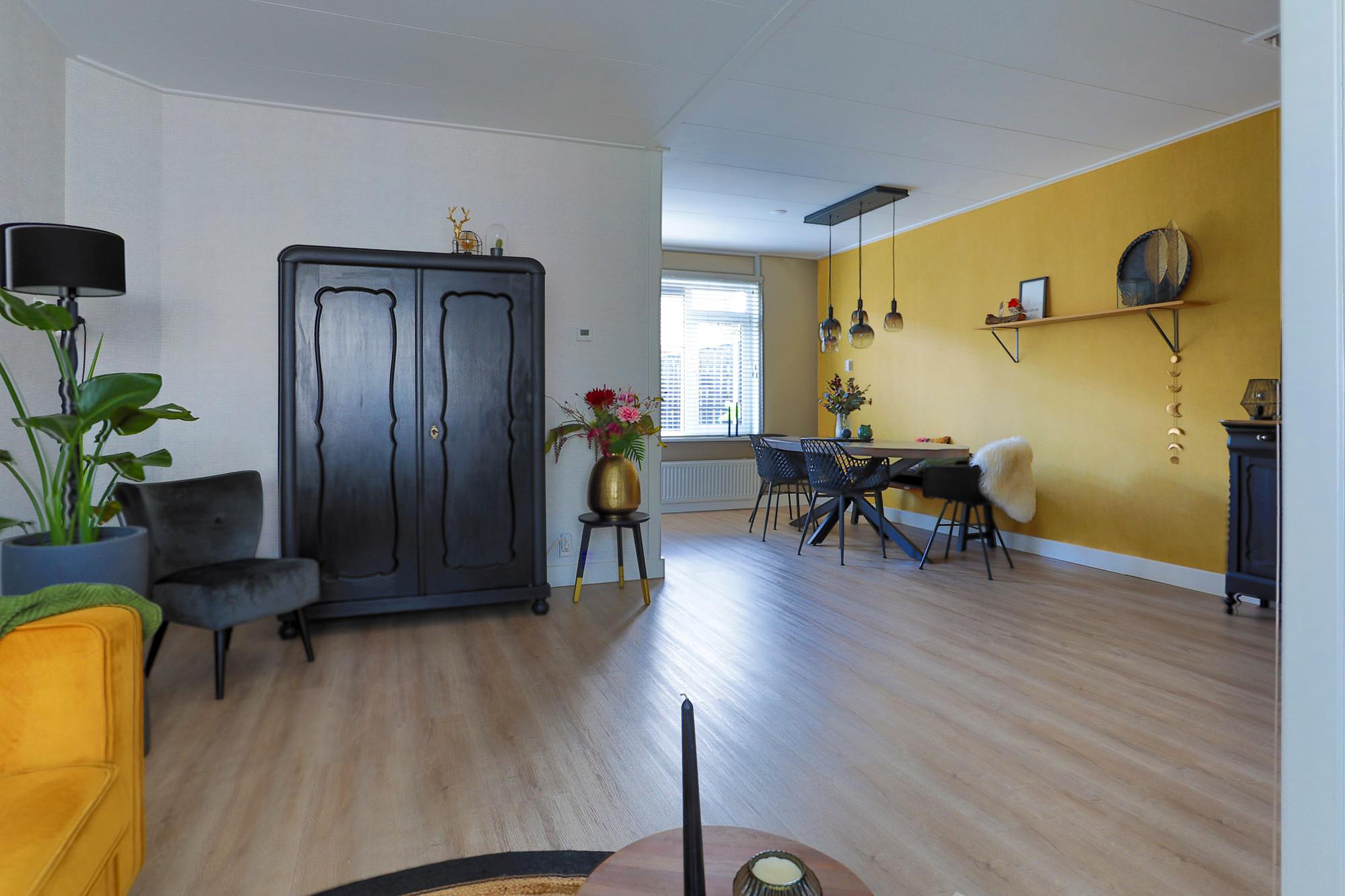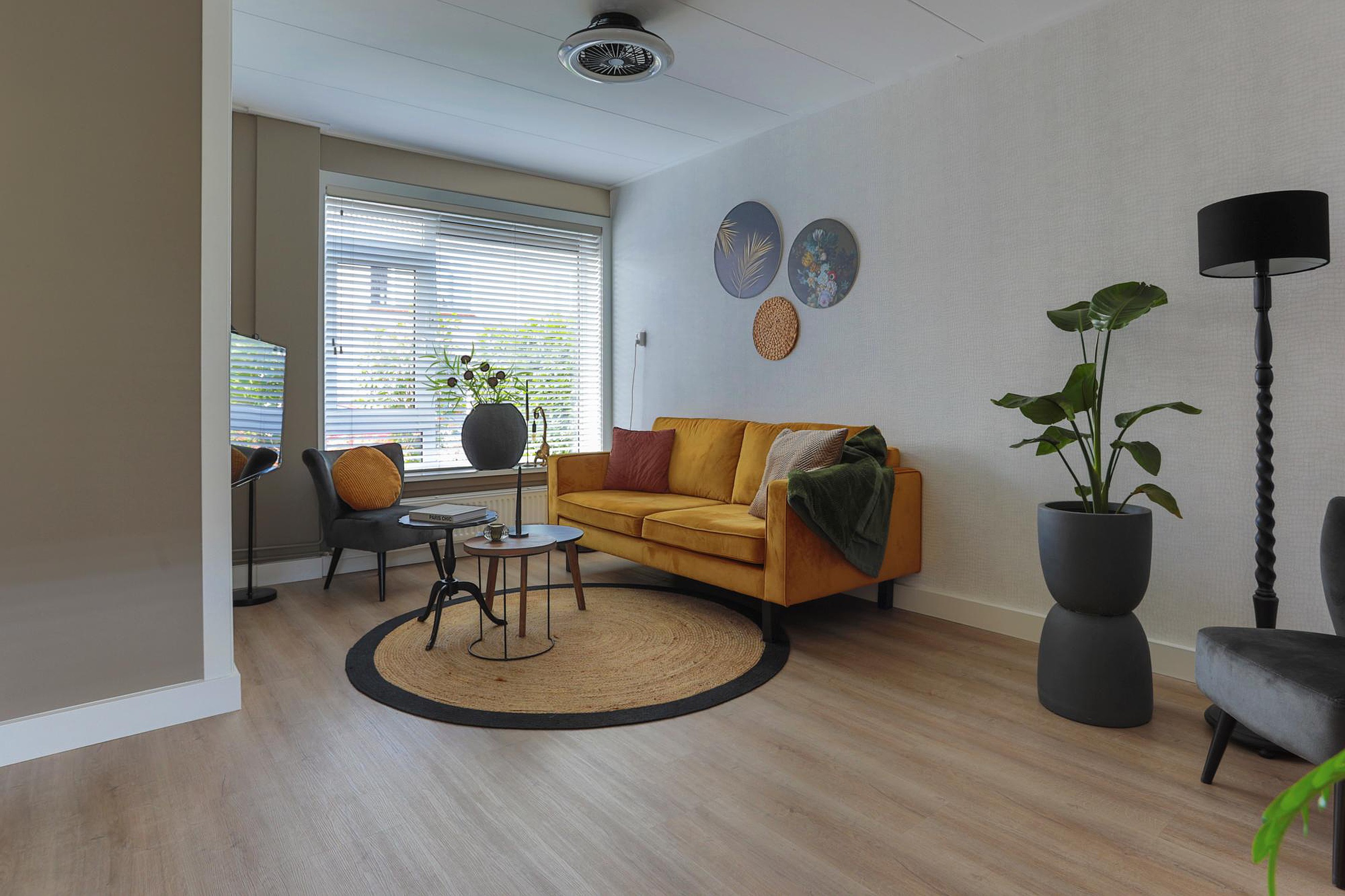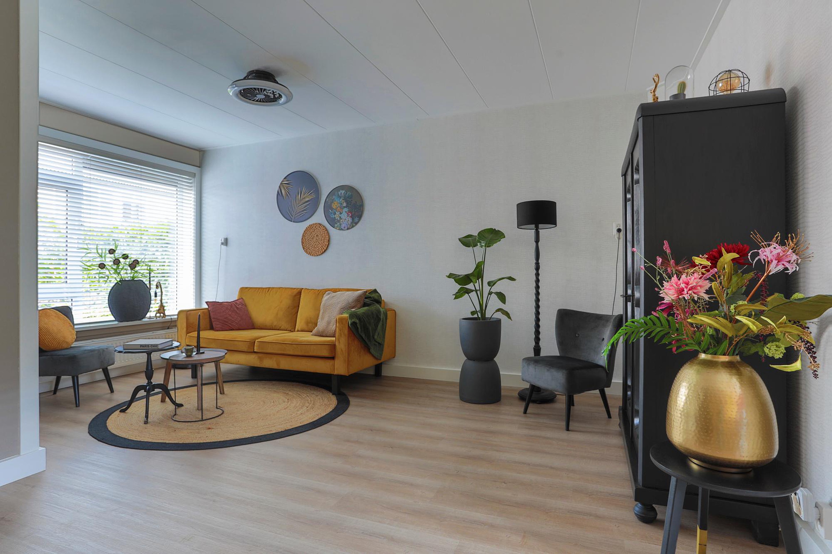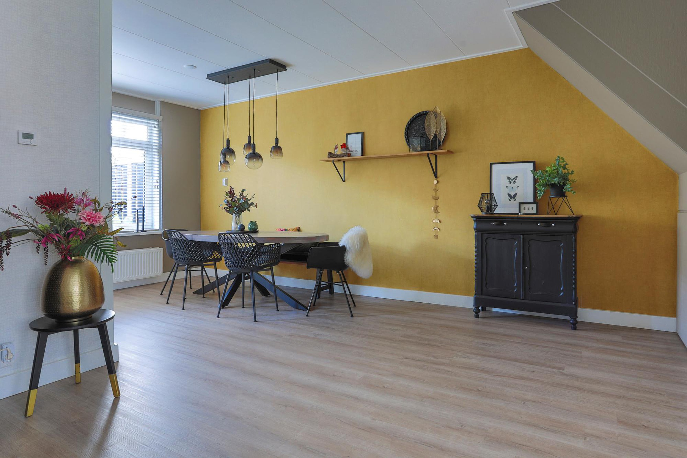 De sfeervolle en lichte woonkamer is voorzien van een moderne pvc vloer en staat in verbinding met de luxe keuken.