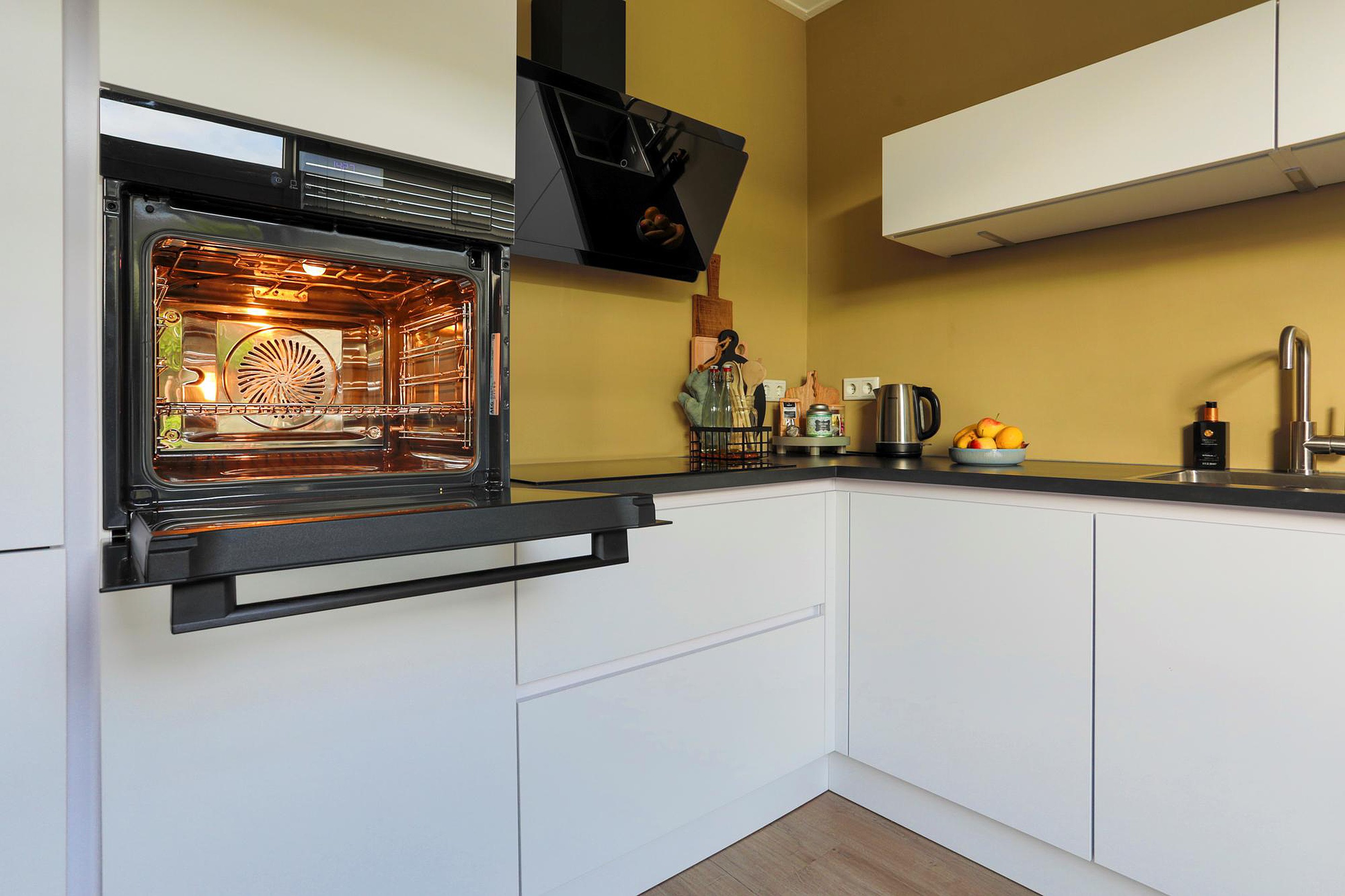 De keuken is compleet uitgerust met een kookplaat, afzuigkap, stoomoven, koelkast, vriezer en vaatwasser en vormt een fijne plek voor dagelijks gebruik én gezellig samenzijn.