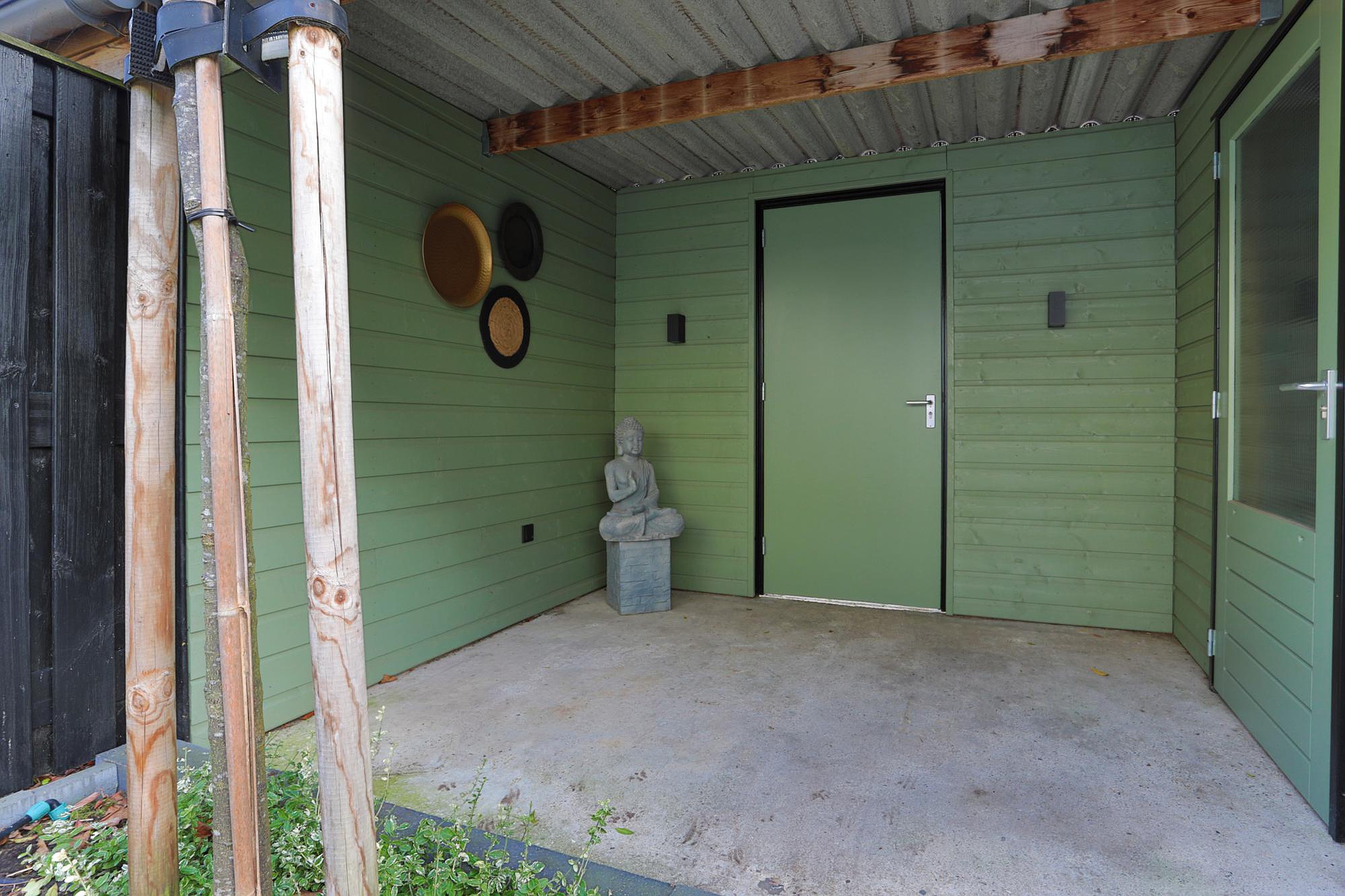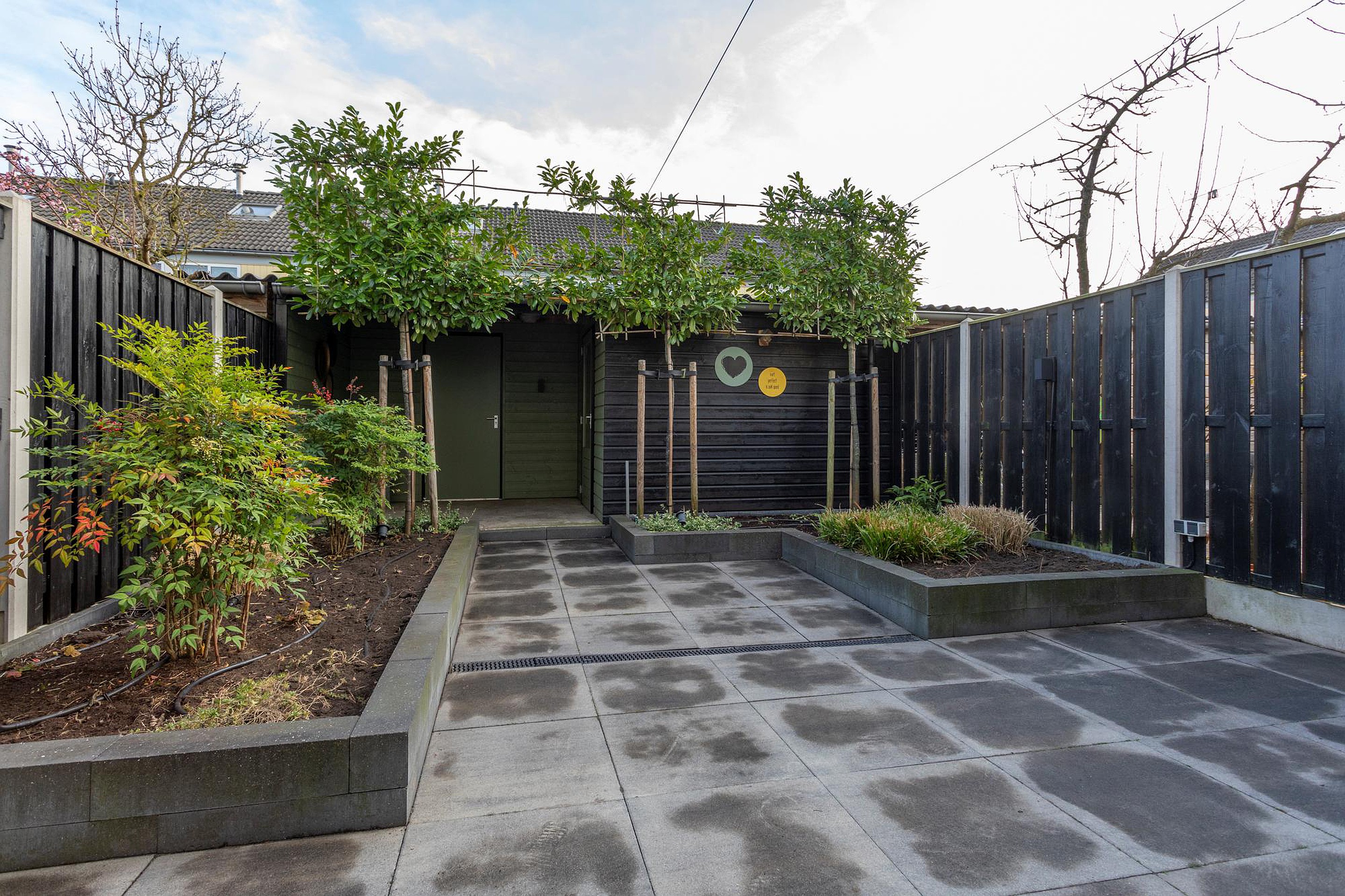 De zonnige en fraai aangelegde achtertuin is gelegen op het zuidoosten en beschikt over een terrasoverkapping en een vrijstaande berging.