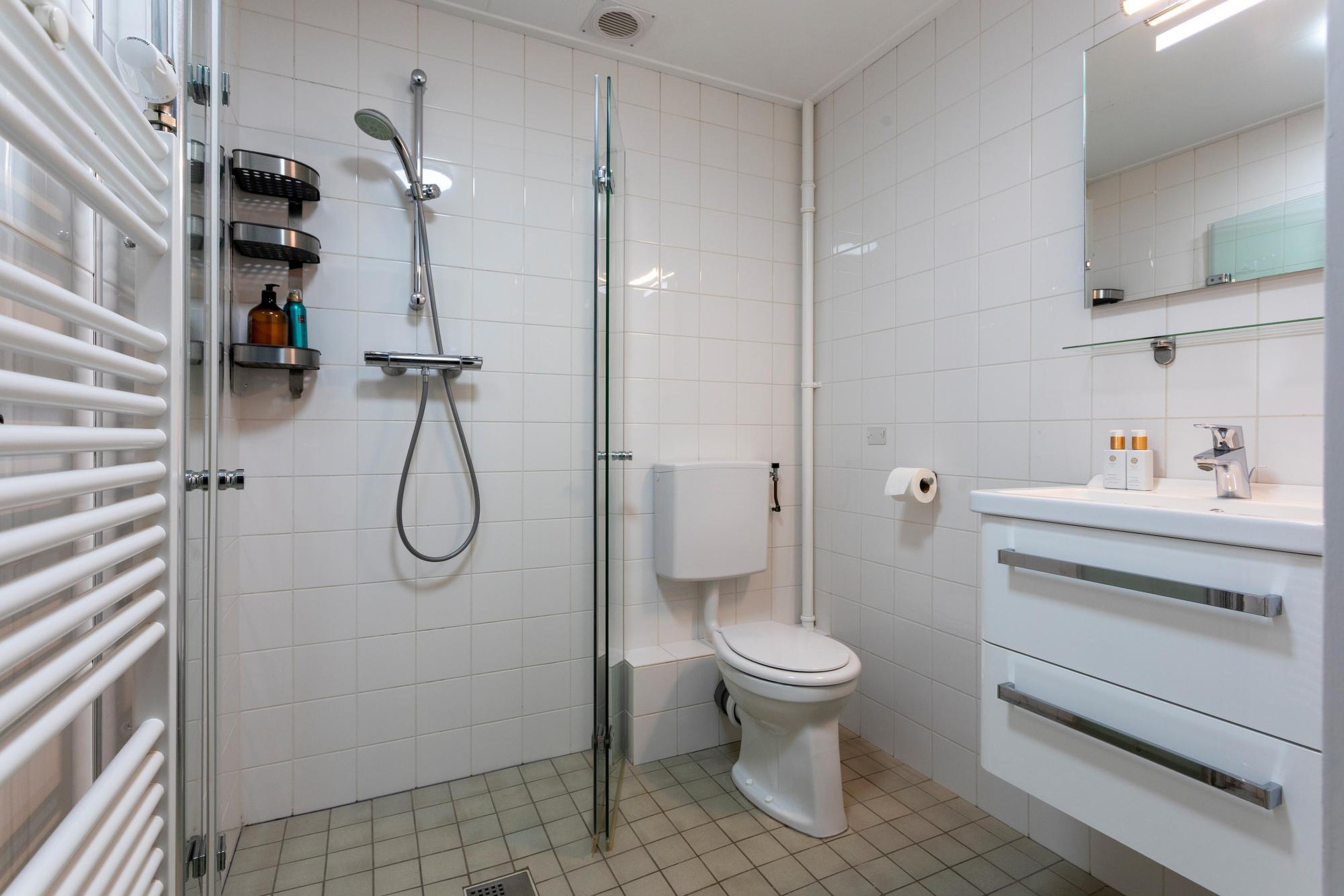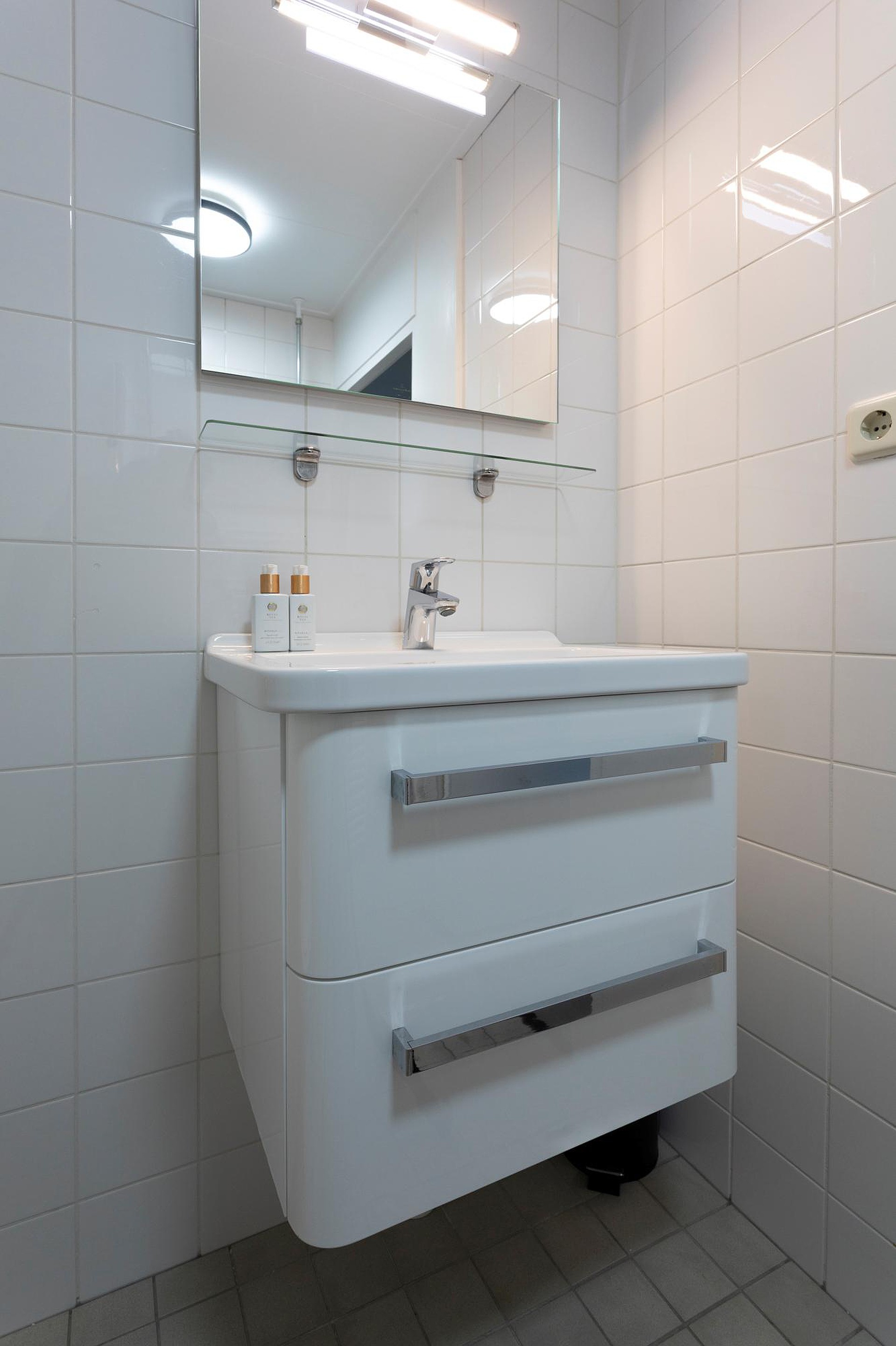 De nette badkamer is uitgevoerd met een douchecabine, wastafelmeubel, designradiator en een tweede toilet.