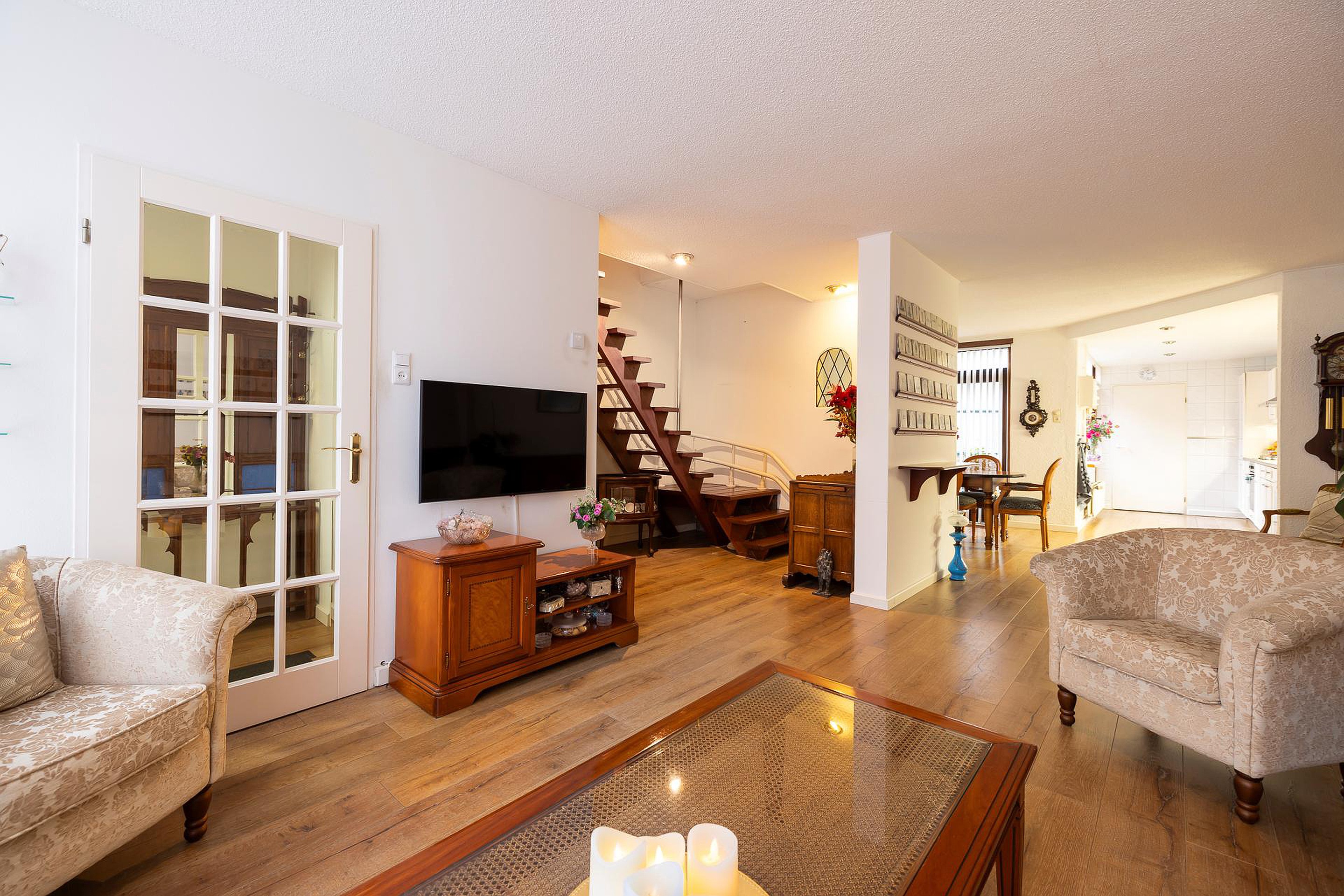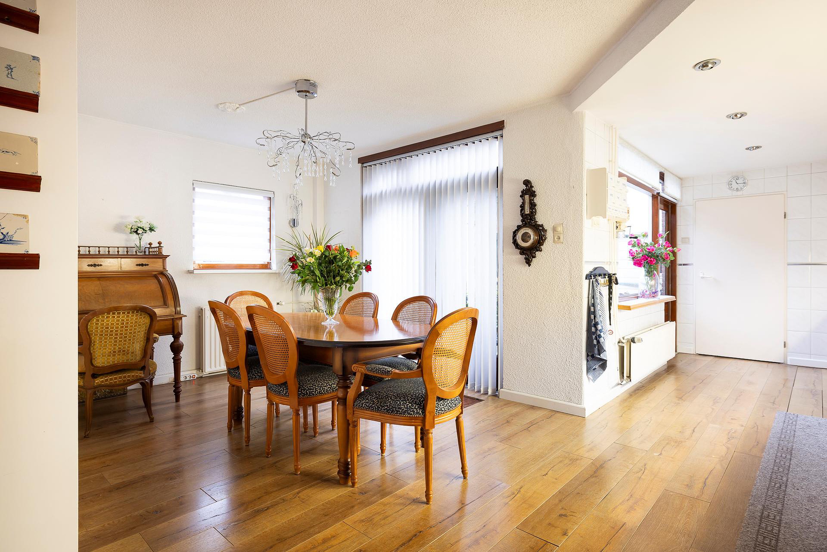 De voordeur zit op de hoek van de woning waarachter je de hal met toilet vindt en de toegang tot de woonkamer. Aan de achterzijde van de woning vind je de grote keuken met berging en de tuin met zijpoort. Aan de zijkant van de woning vind je de opgang naar de eerste verdieping.