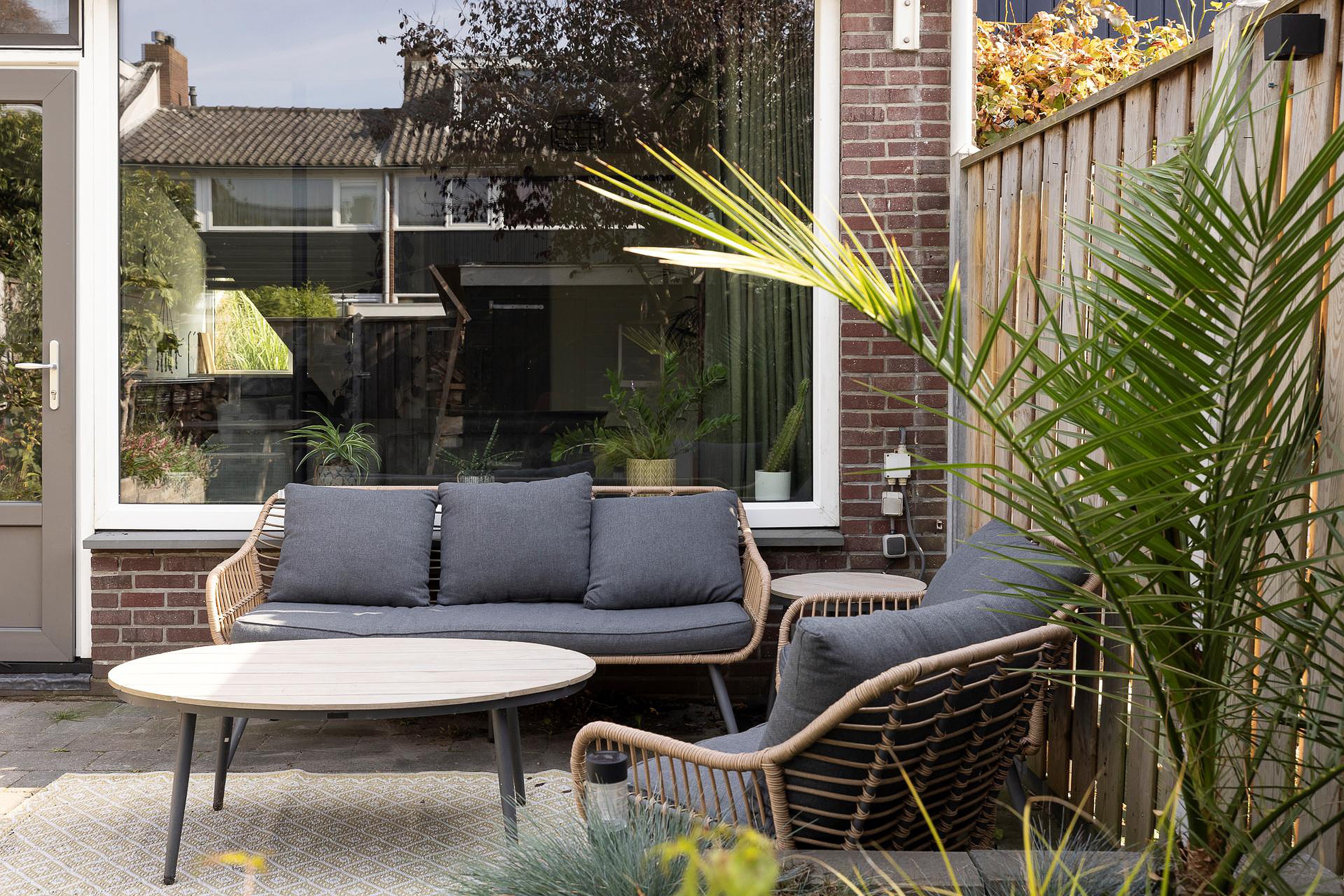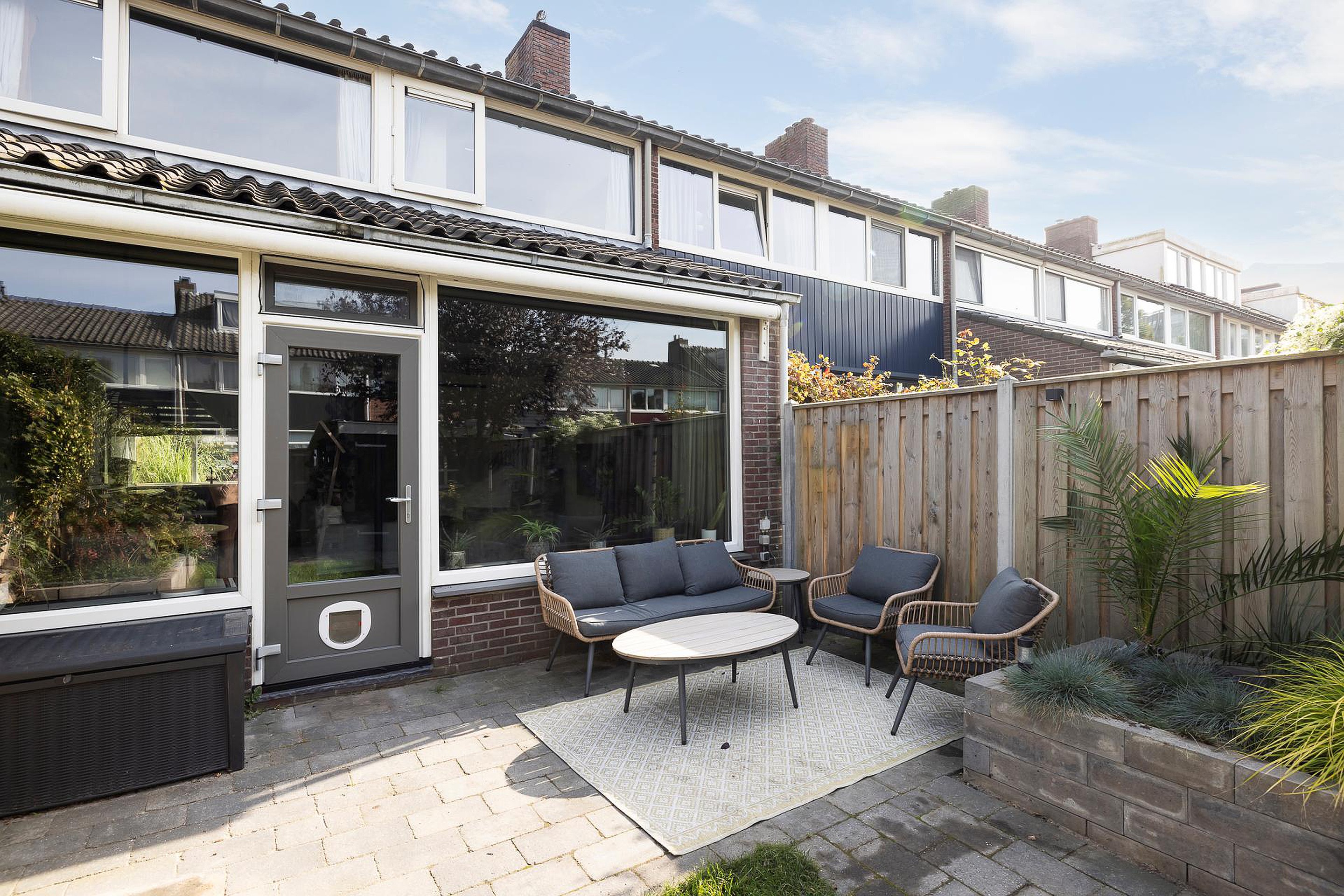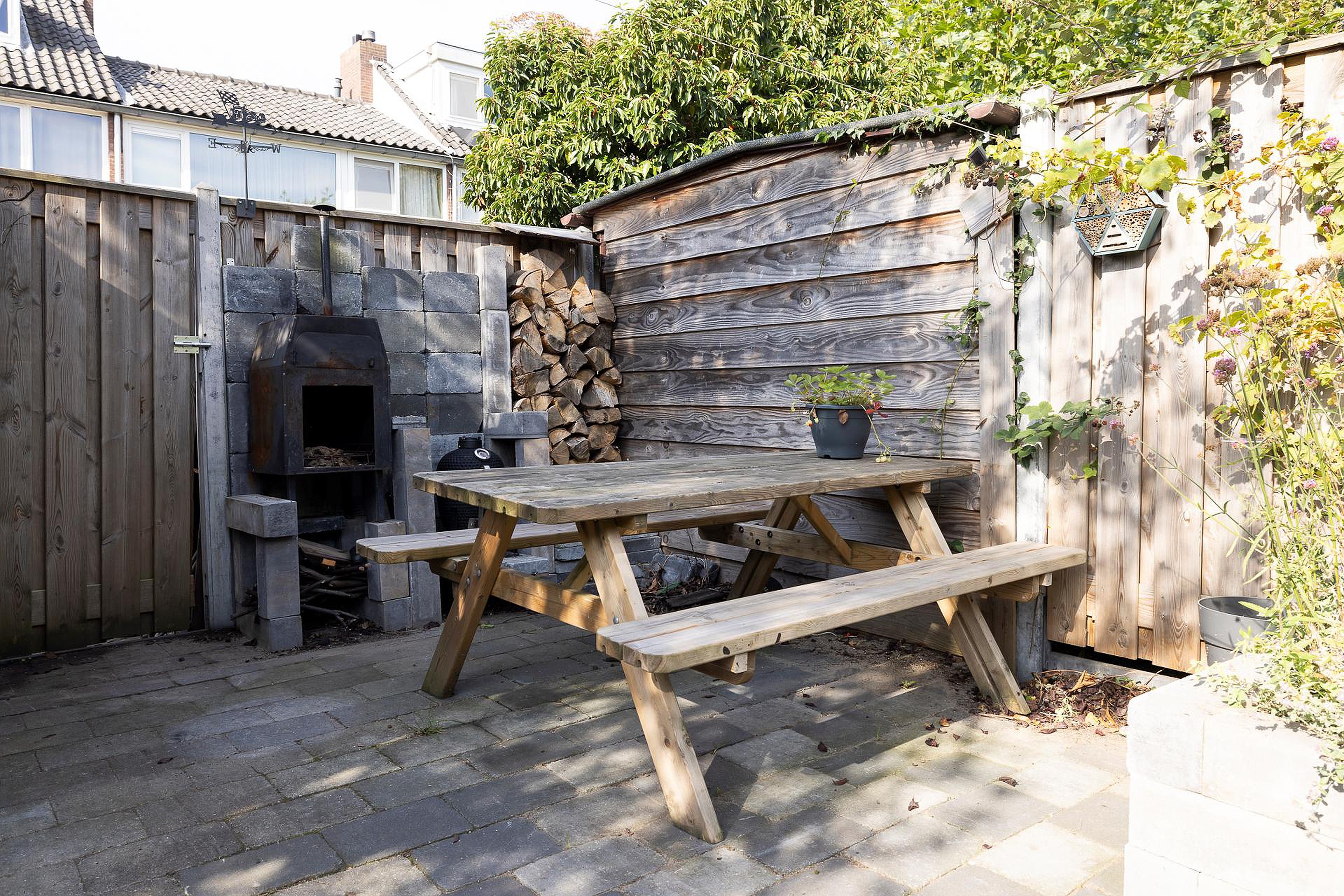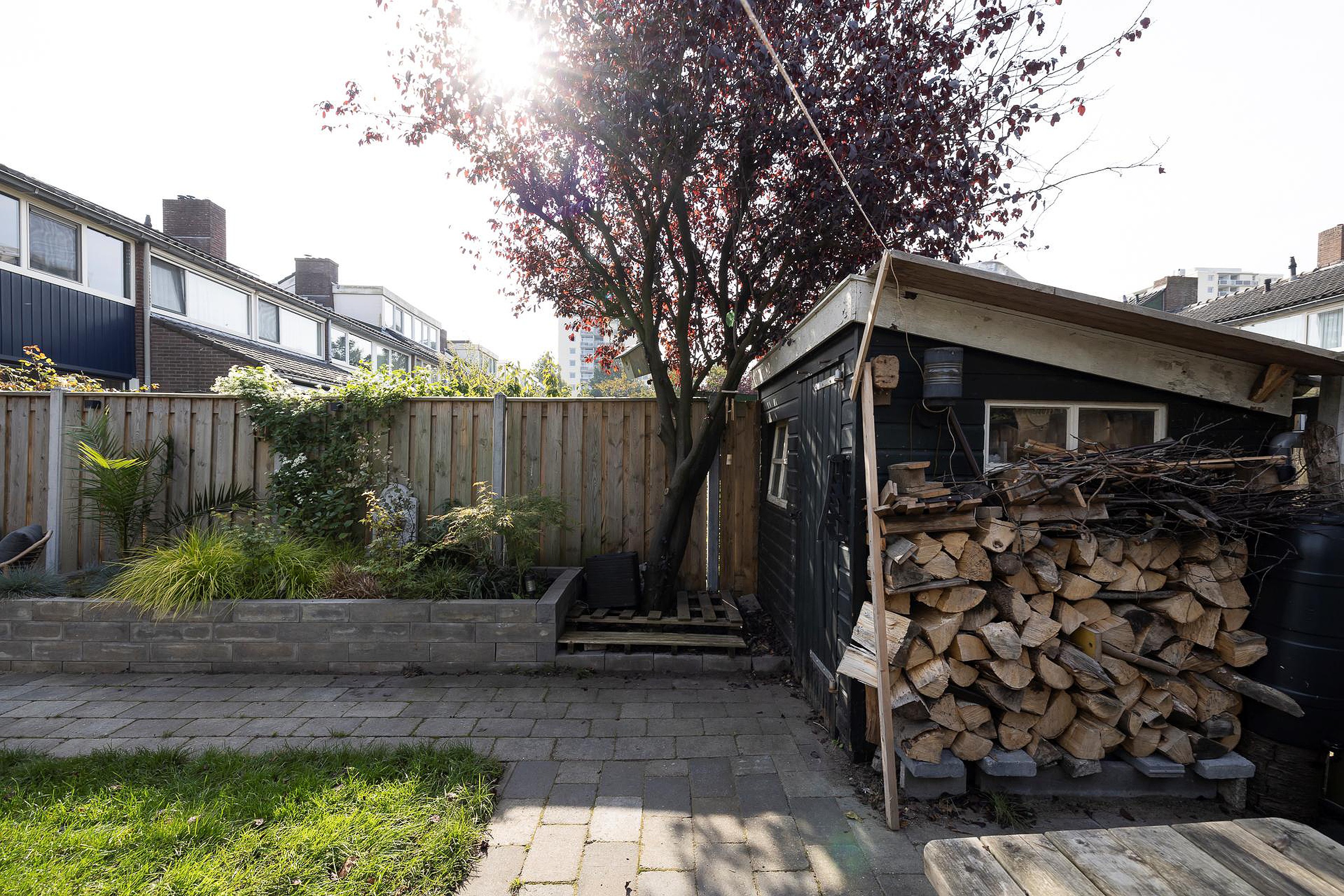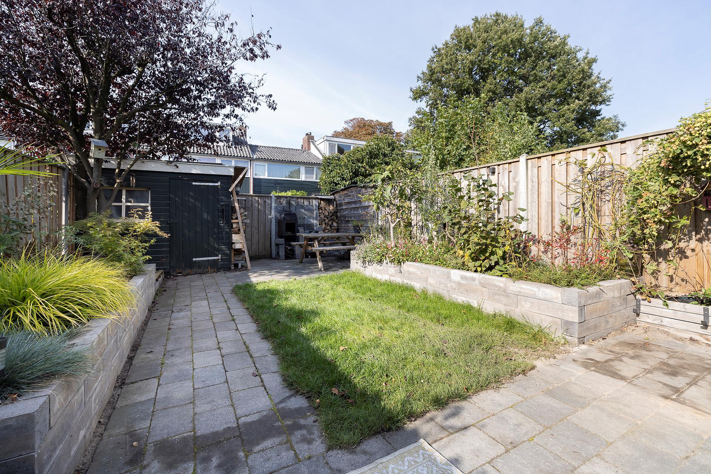 - Zonnige achtertuin op het westen met schuur en achterom