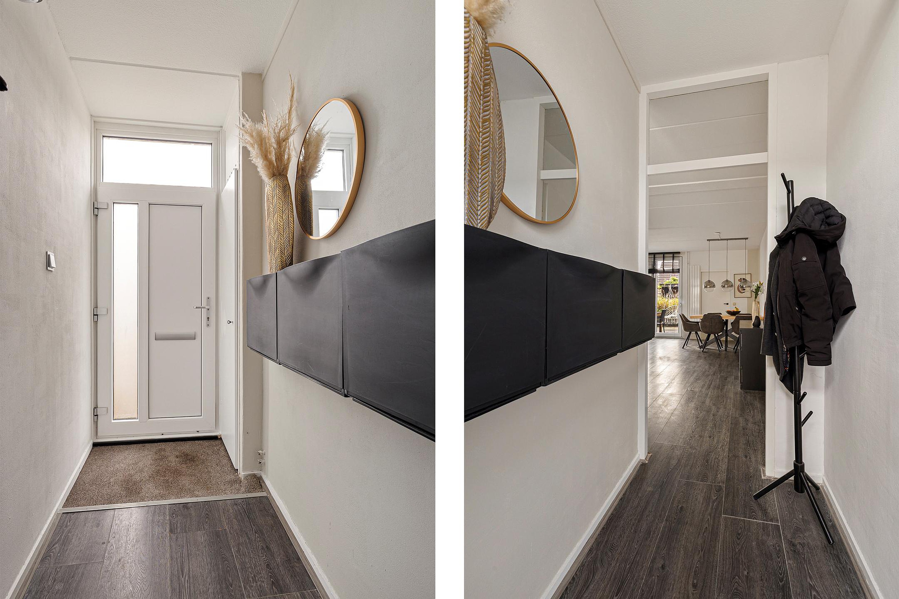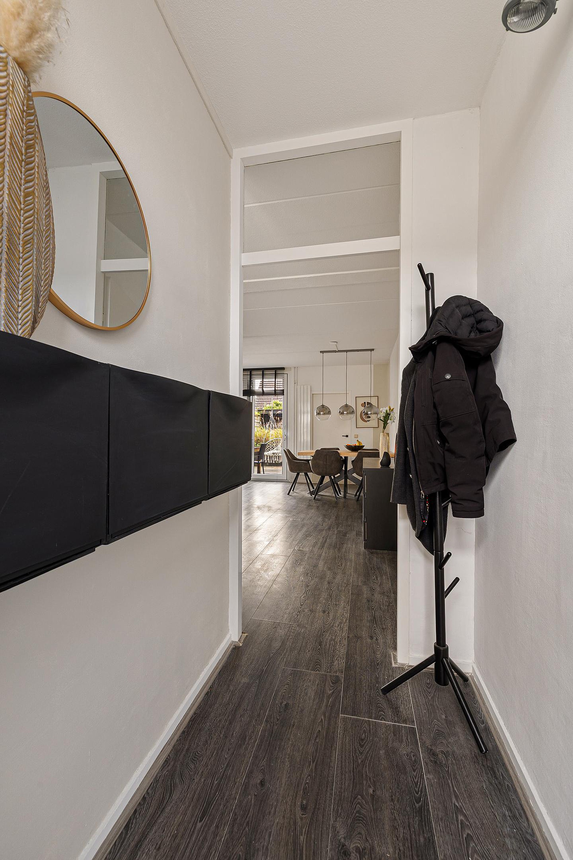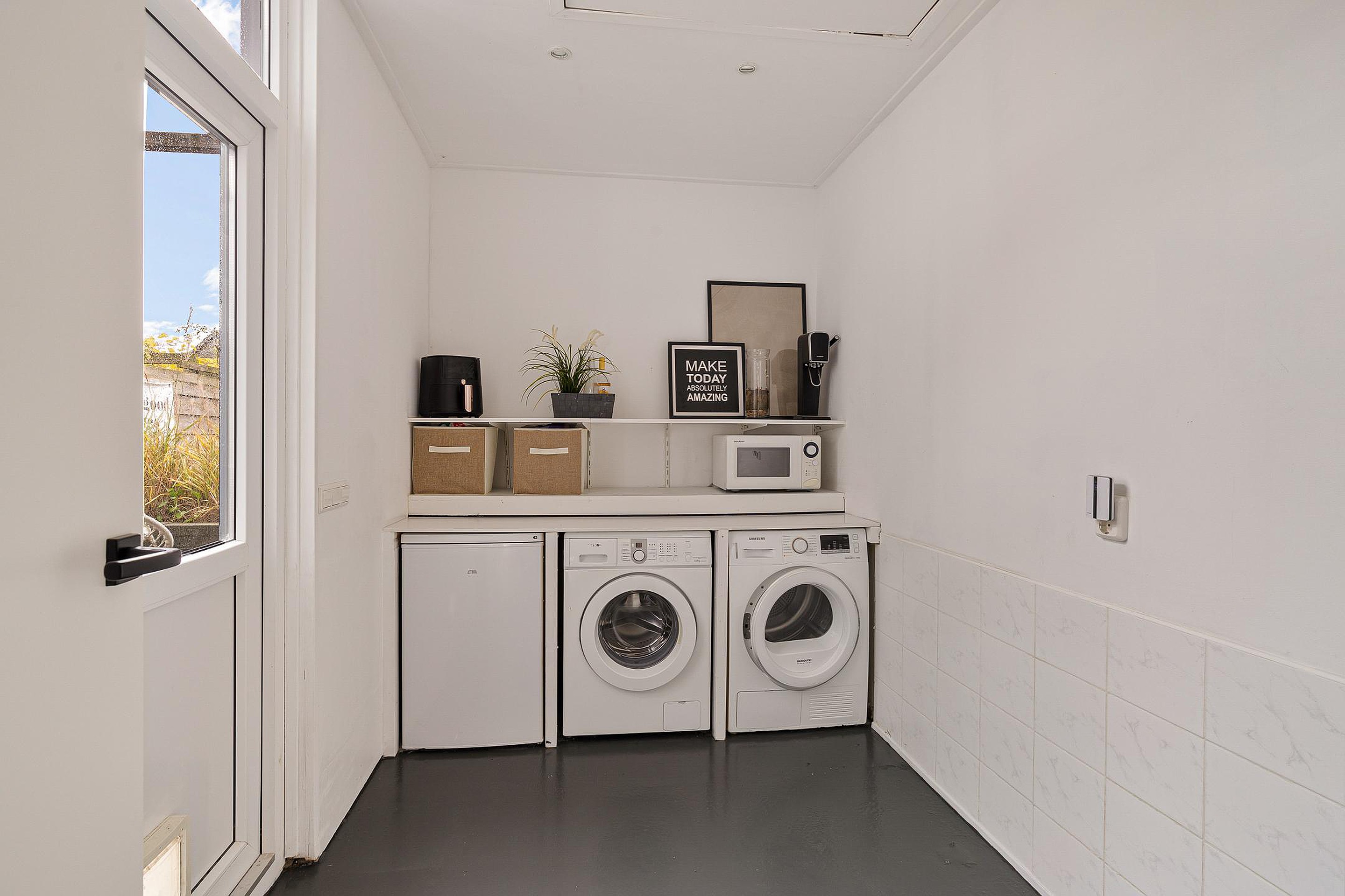 Via de entree kom je in de hal met toegang tot de lichte en ruime woonkamer. Aansluitend bevindt zich de moderne keuken, voorzien van diverse inbouwapparatuur en een schuifpui. De bijkeuken beschikt over een wasmachine- en drogeraansluiting, vlizotrap naar vliering en een deur naar de achtertuin.