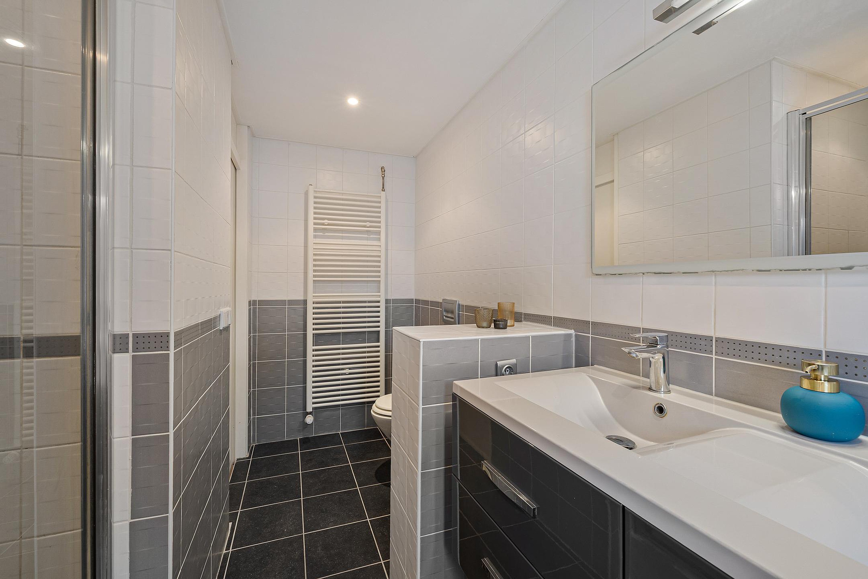De overloop geeft toegang tot twee slaapkamers en de ruime badkamer, uitgevoerd met ligbad, douche, toilet, dubbel wastafelmeubel en designradiator. Via de trapopgang op de overloop is de tweede verdieping bereikbaar.