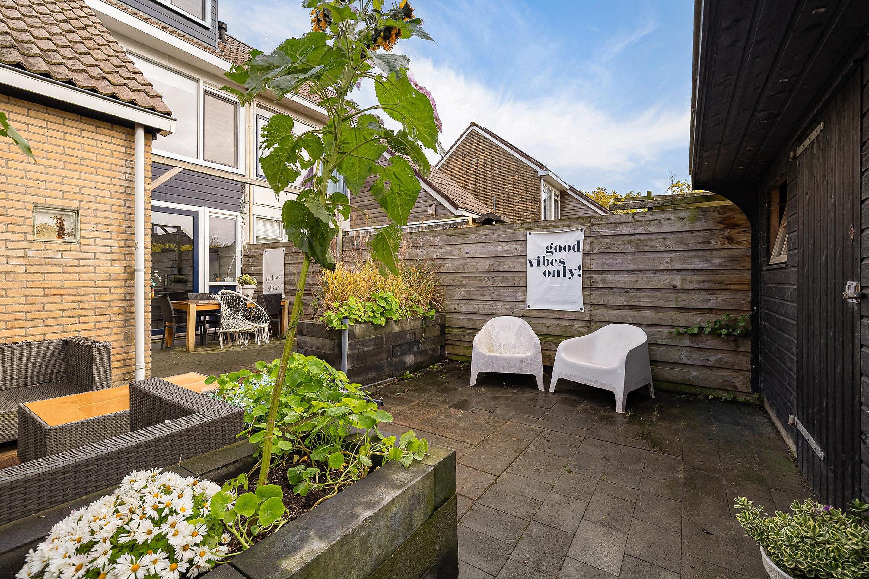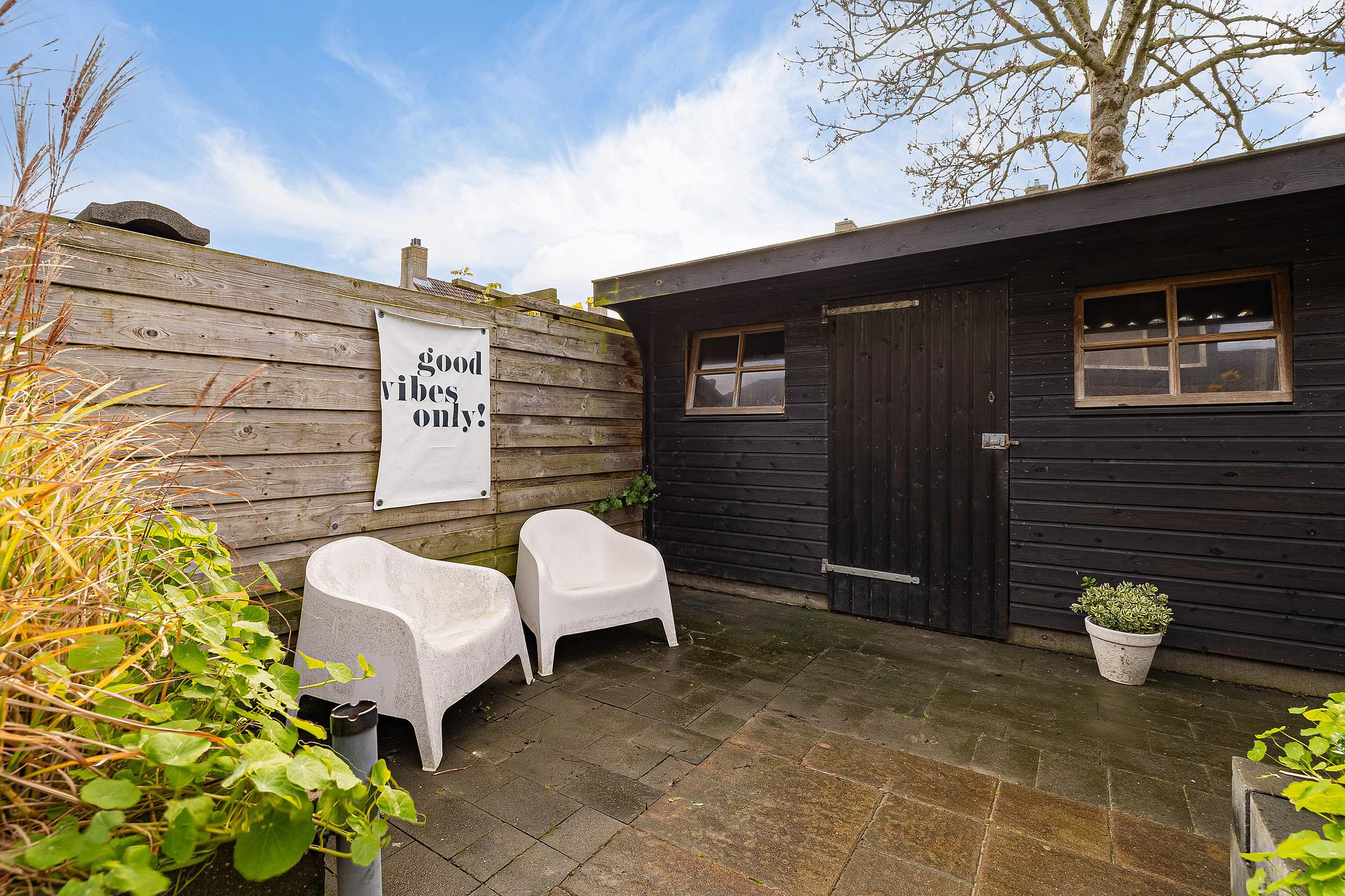 De tuin is onderhoudsvriendelijk ingericht en beschikt over een ruime berging, ideaal voor fietsen en tuingereedschap.