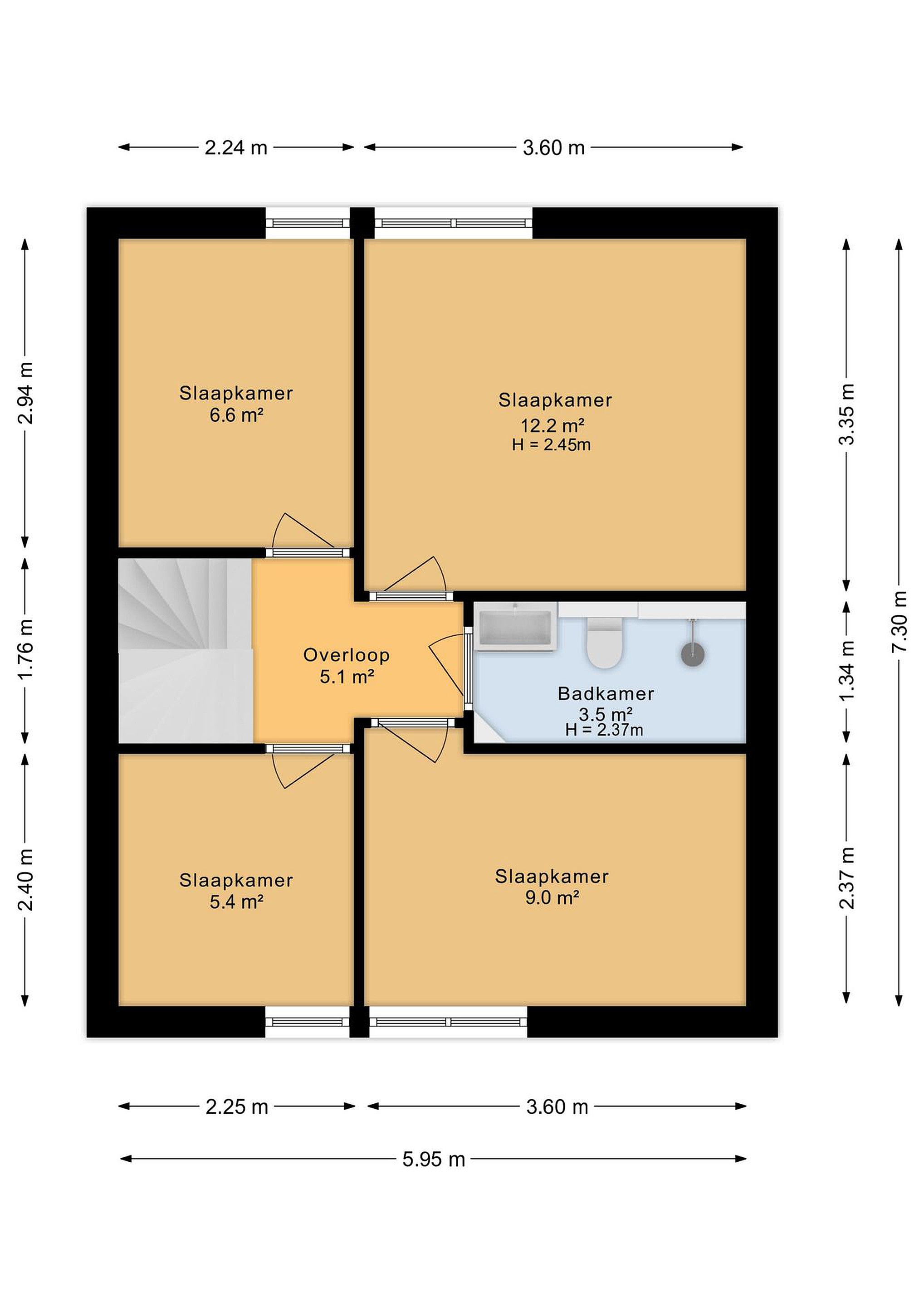 De overloop geeft toegang tot vier slaapkamers, variërend in grootte en geschikt als slaap-, werk- of studeerkamer. De moderne badkamer (ca. 5 jaar oud) is smaakvol uitgevoerd met inloopdouche, wastafelmeubel en tweede toilet.