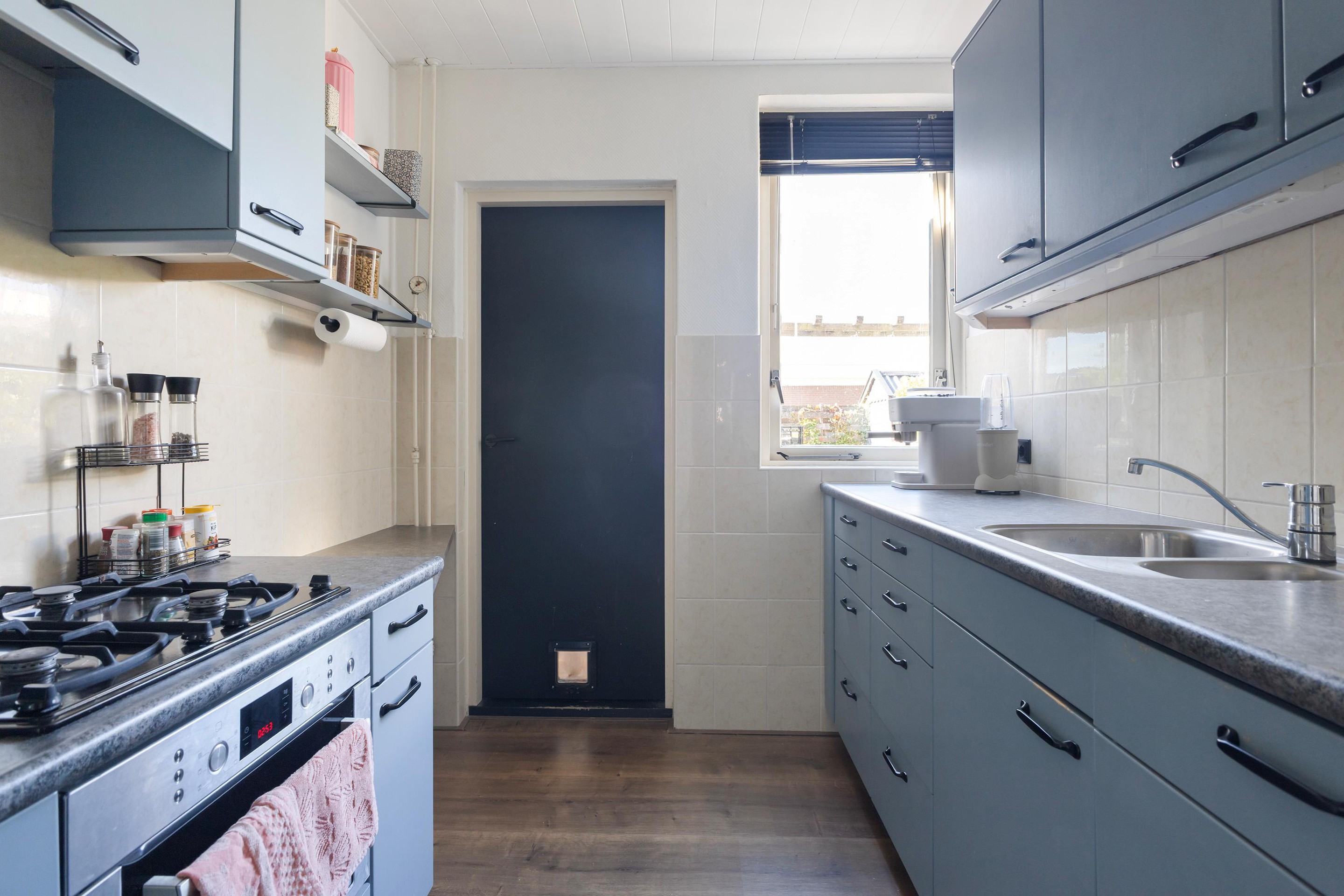 Je komt binnen in de hal met toilet, trapopgang en handige trapkast. De lichte doorzon-woonkamer is voorzien van een laminaatvloer en grote raampartijen aan zowel de voor- als achterzijde, wat zorgt voor een prettige lichtinval. Er is plek voor zowel een gezellige zithoek als een royale eettafel. Vanuit hier heb je fijn zicht op de achtertuin. De gesloten keuken is praktisch ingedeeld met twee rechte opstellingen en voorzien van diverse inbouwapparatuur. Aansluitend vind je de bijkeuken, ideaal voor extra bergruimte of het plaatsen van witgoed. Vanuit de bijkeuken stap je de achtertuin in.