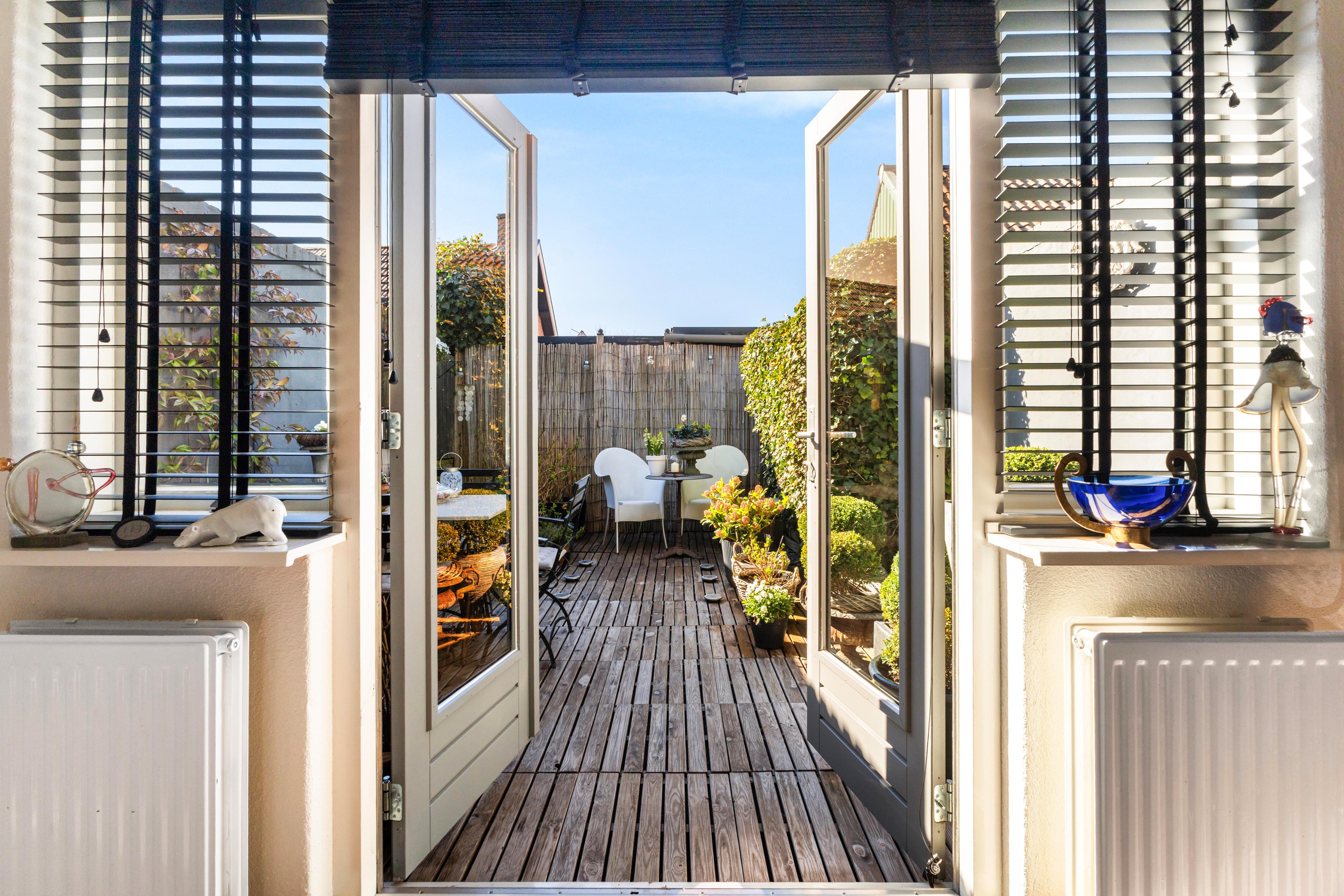 De achtertuin is verzorgd aangelegd en voorzien van een vlonderterras waar je heerlijk beschut kunt zitten. Dankzij de openslaande deuren wordt binnen en buiten hier moeiteloos met elkaar verbonden – een fijne plek om te ontspannen en te genieten van privacy.